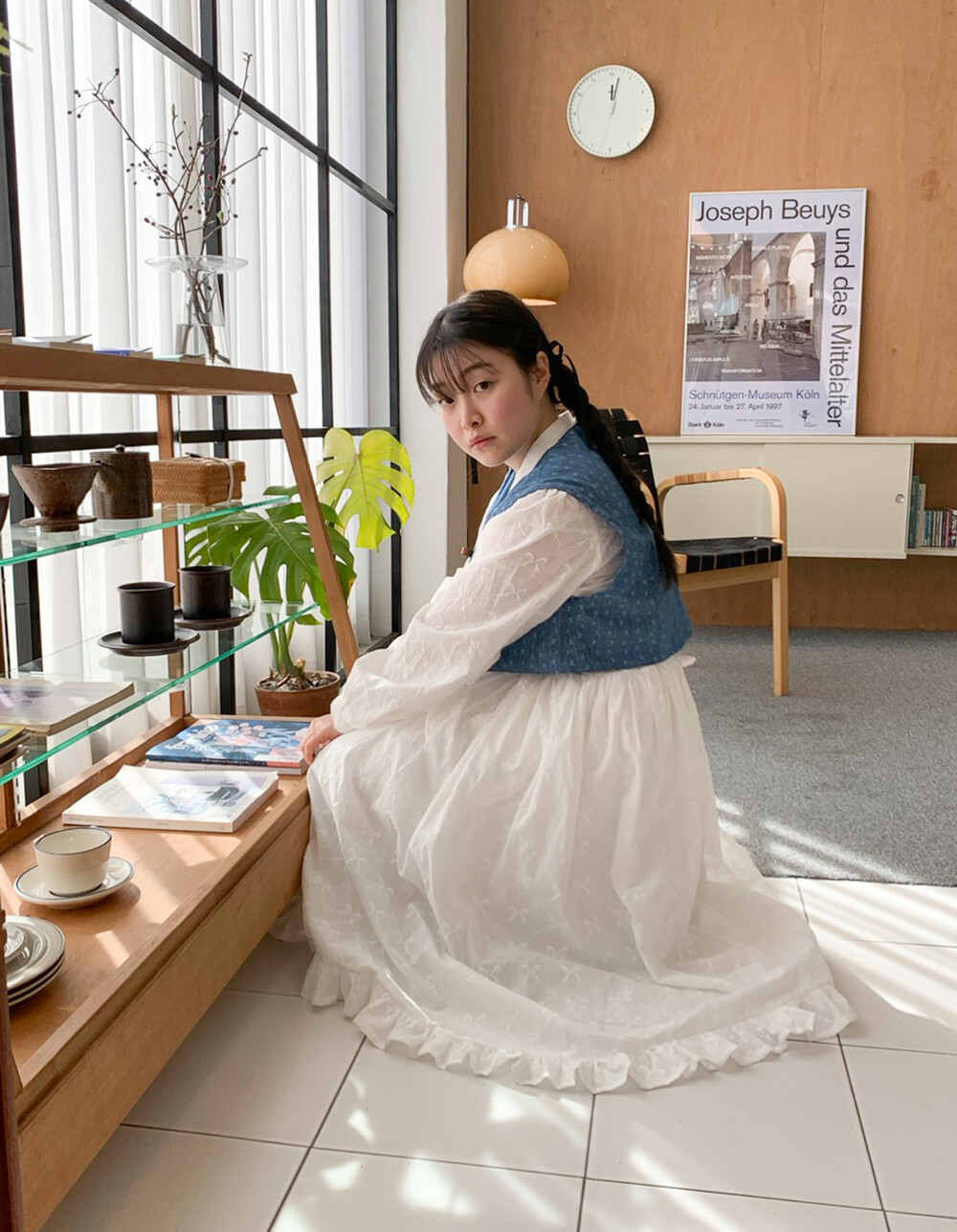 단색의 원피스에도 잘 어울리며 빈티지한 무드가 가득합니다.