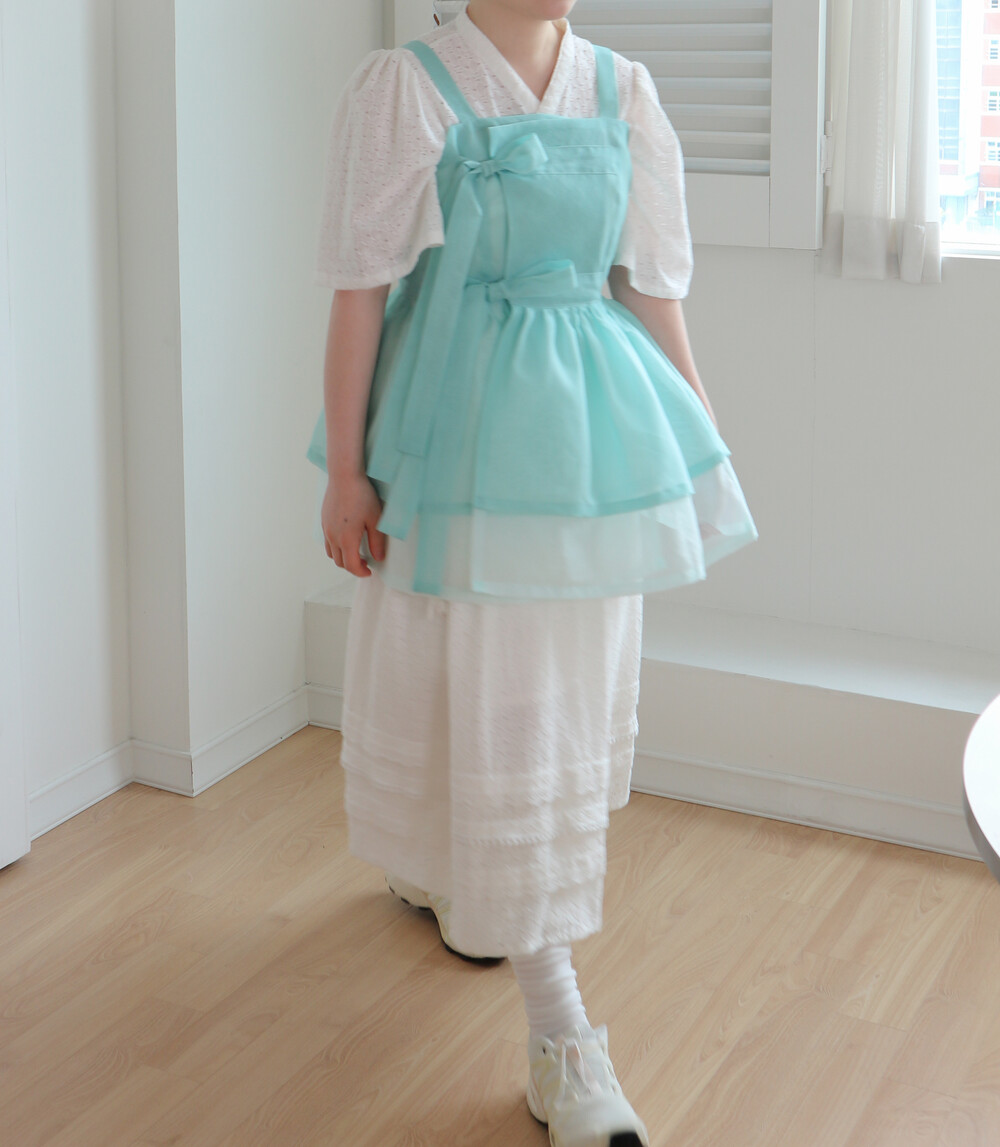앞에서 저고리 처럼 앞에서 여미는 방식으로 고름이 상의에 고정되어있으며 안정적이고