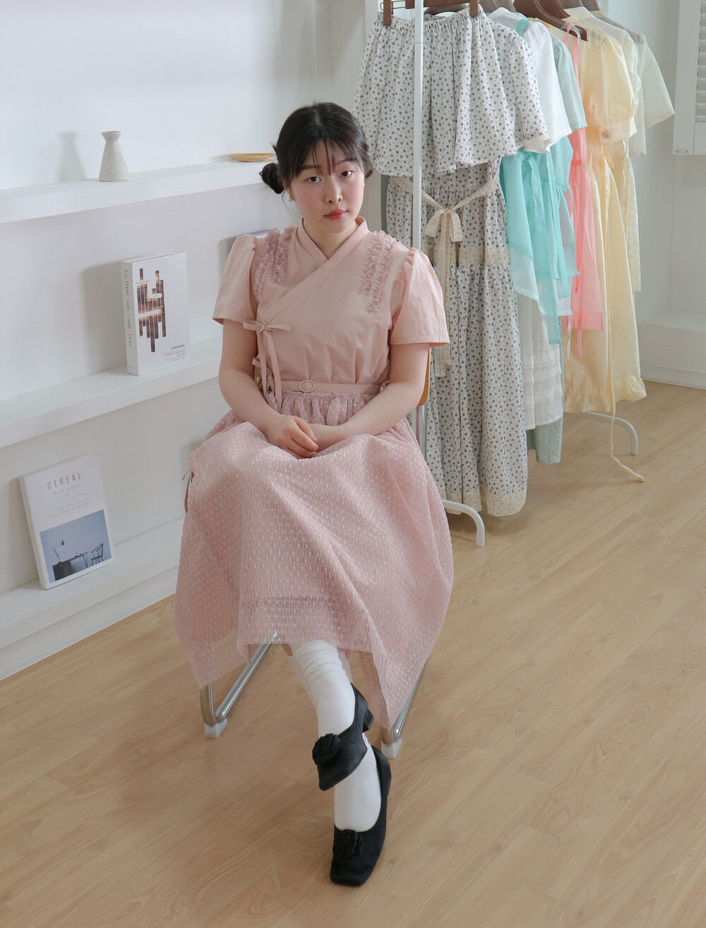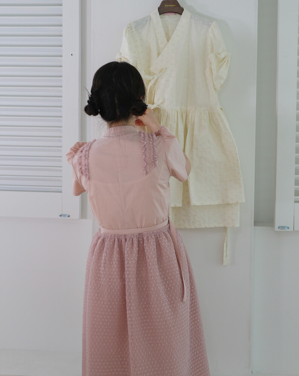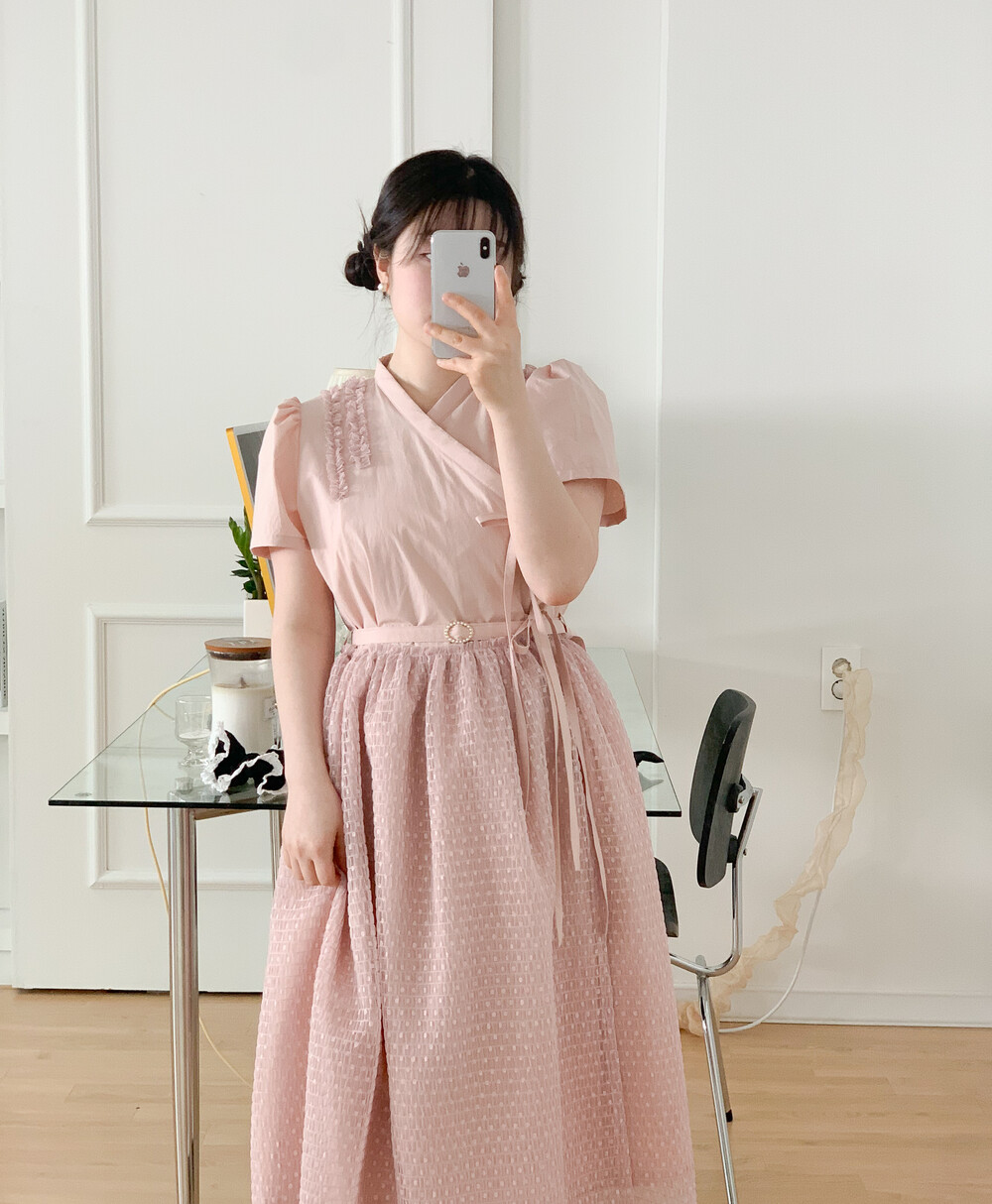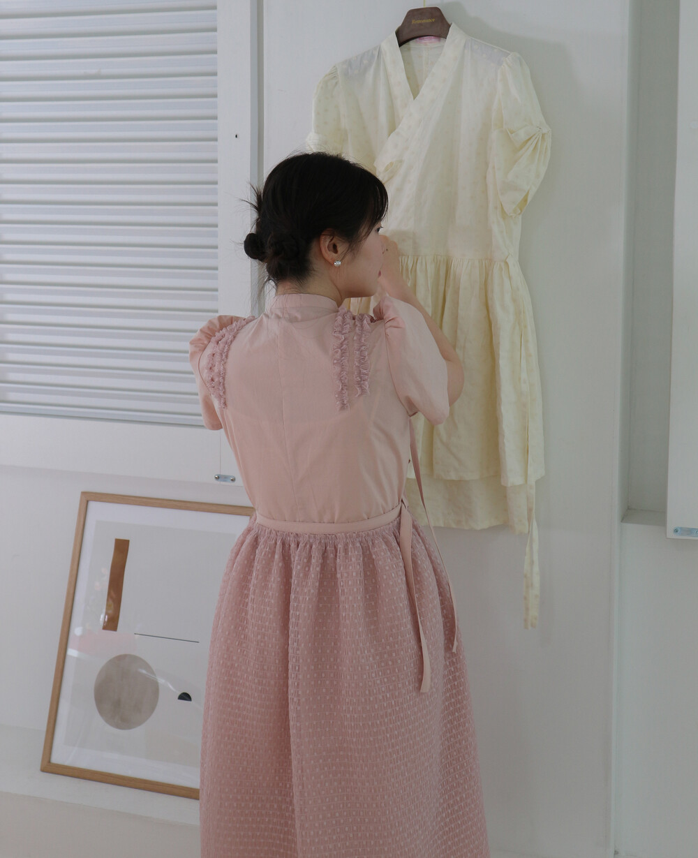 더스티 핑크 셔링 원피스는 바이오 워싱 면 원단을 베이스로 짧은 소매의 베이스 철릭을 만들고
