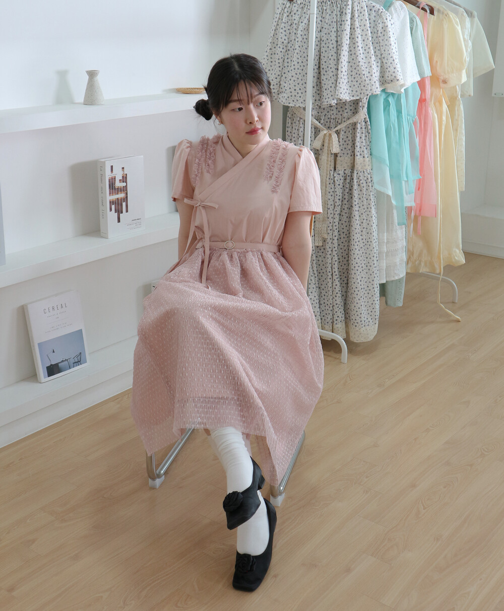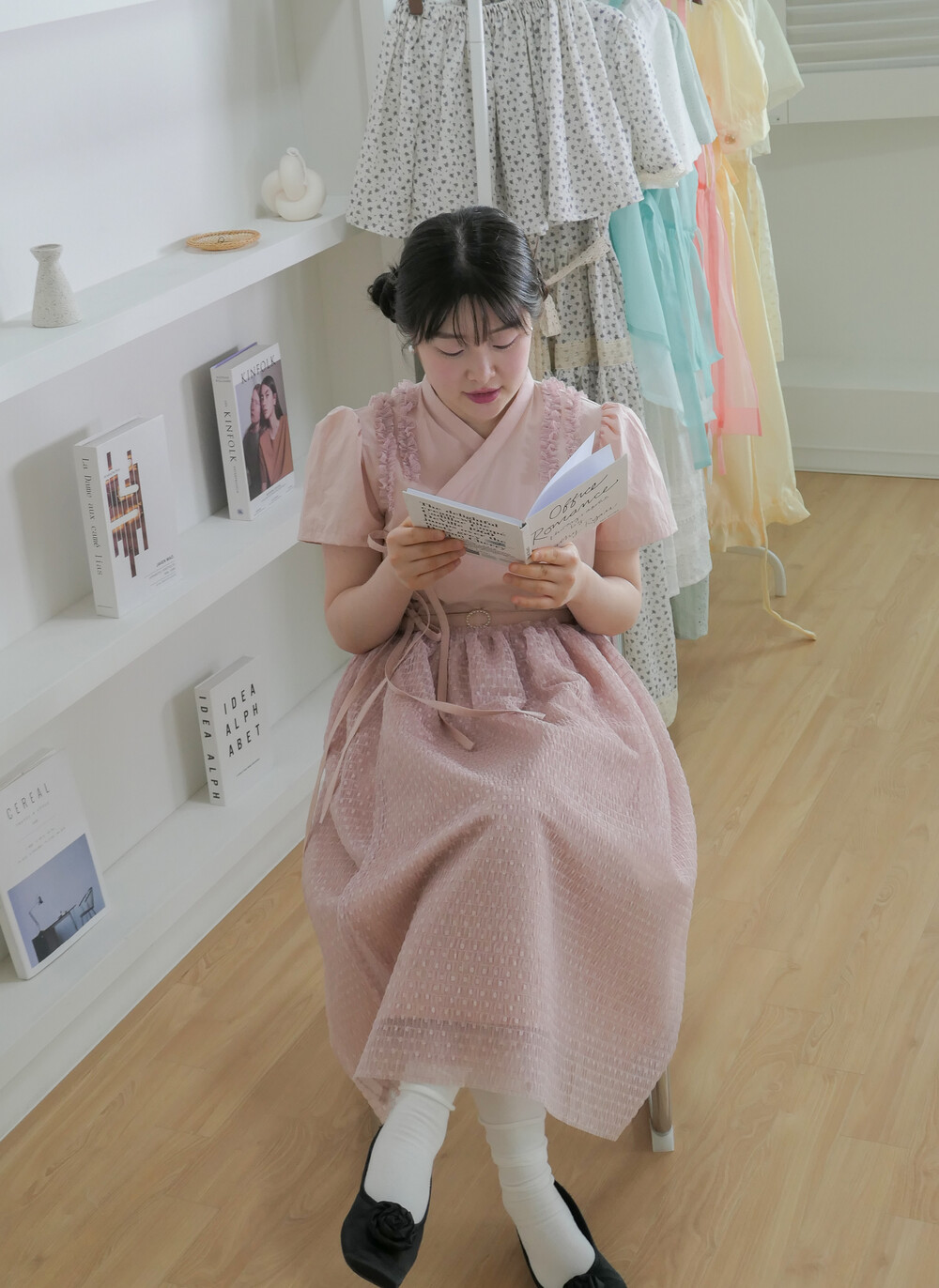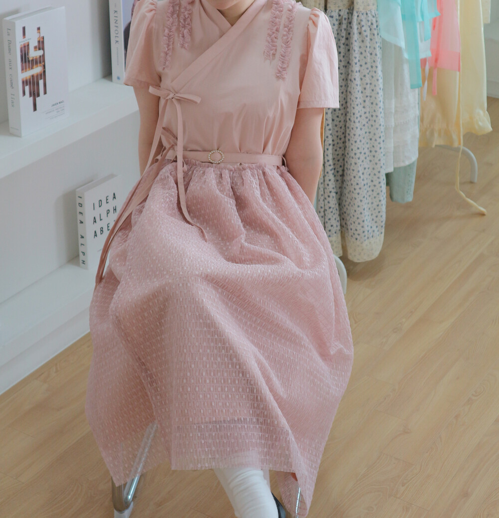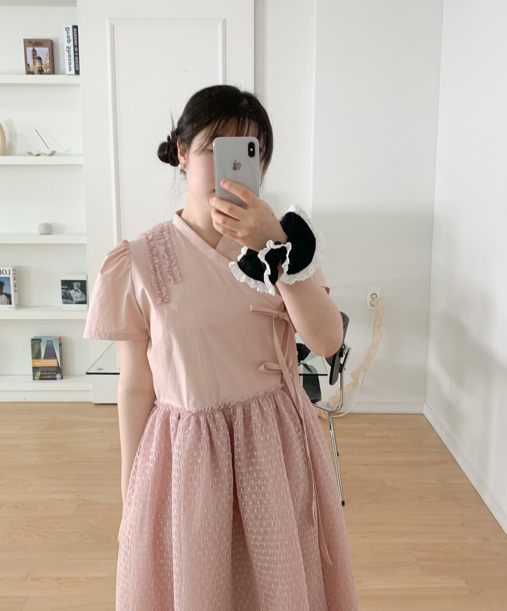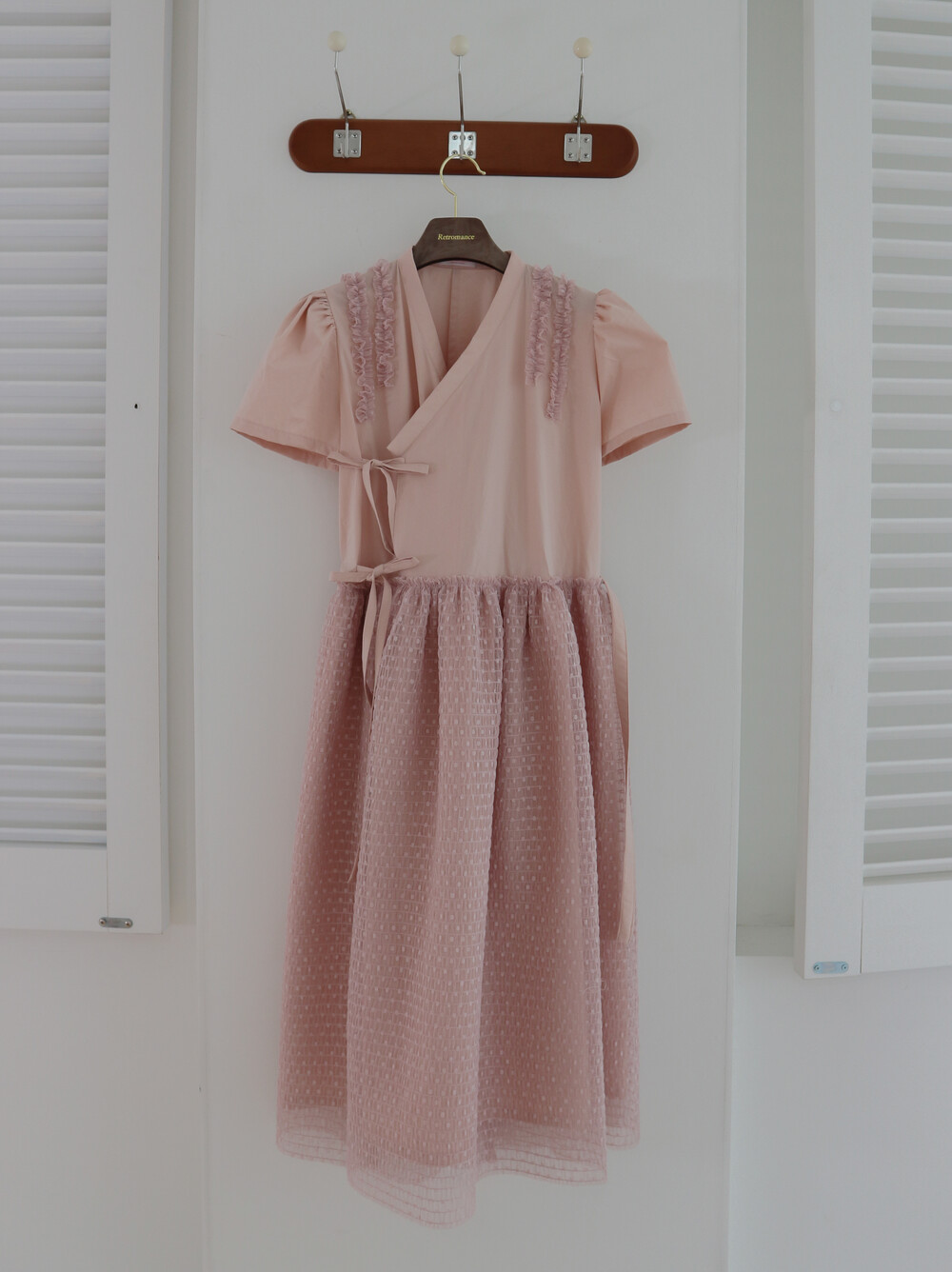 더스티 핑크 셔링 원피스는 바이오 워싱 면 원단을 베이스로 짧은 소매의 베이스 철릭을 만들고