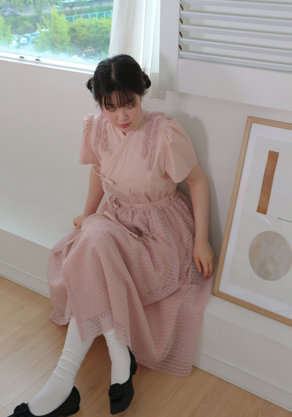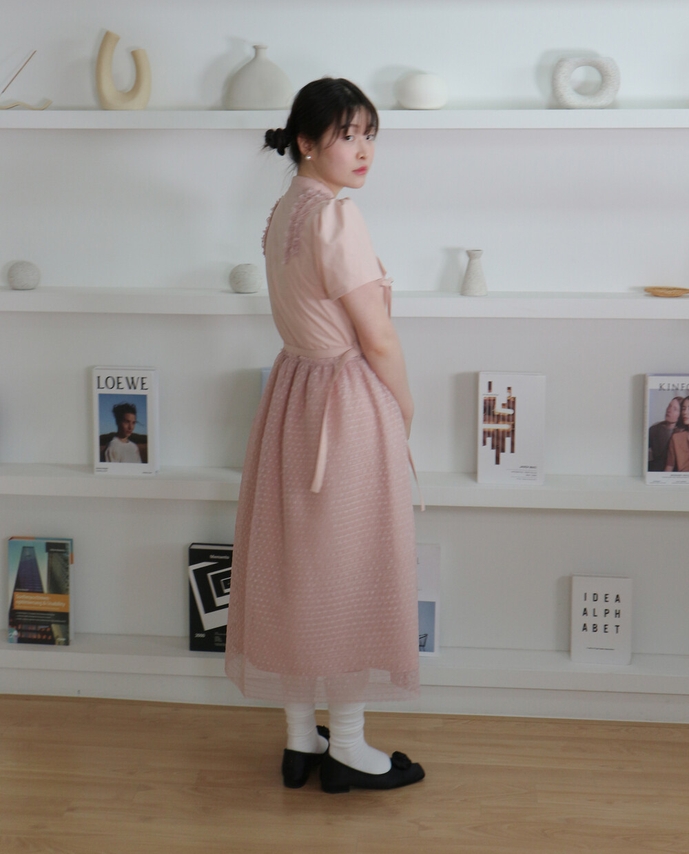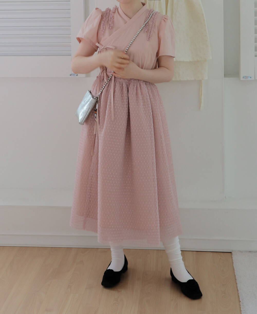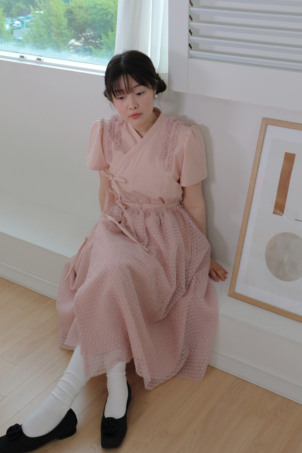차분한 더스티 핑크색의 튤(레이스)을 치마 부분에 한겹 얹어 특별함을 더하였습니다.