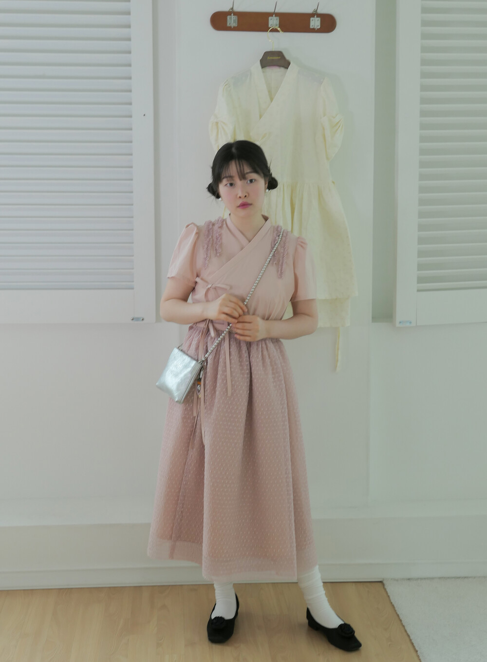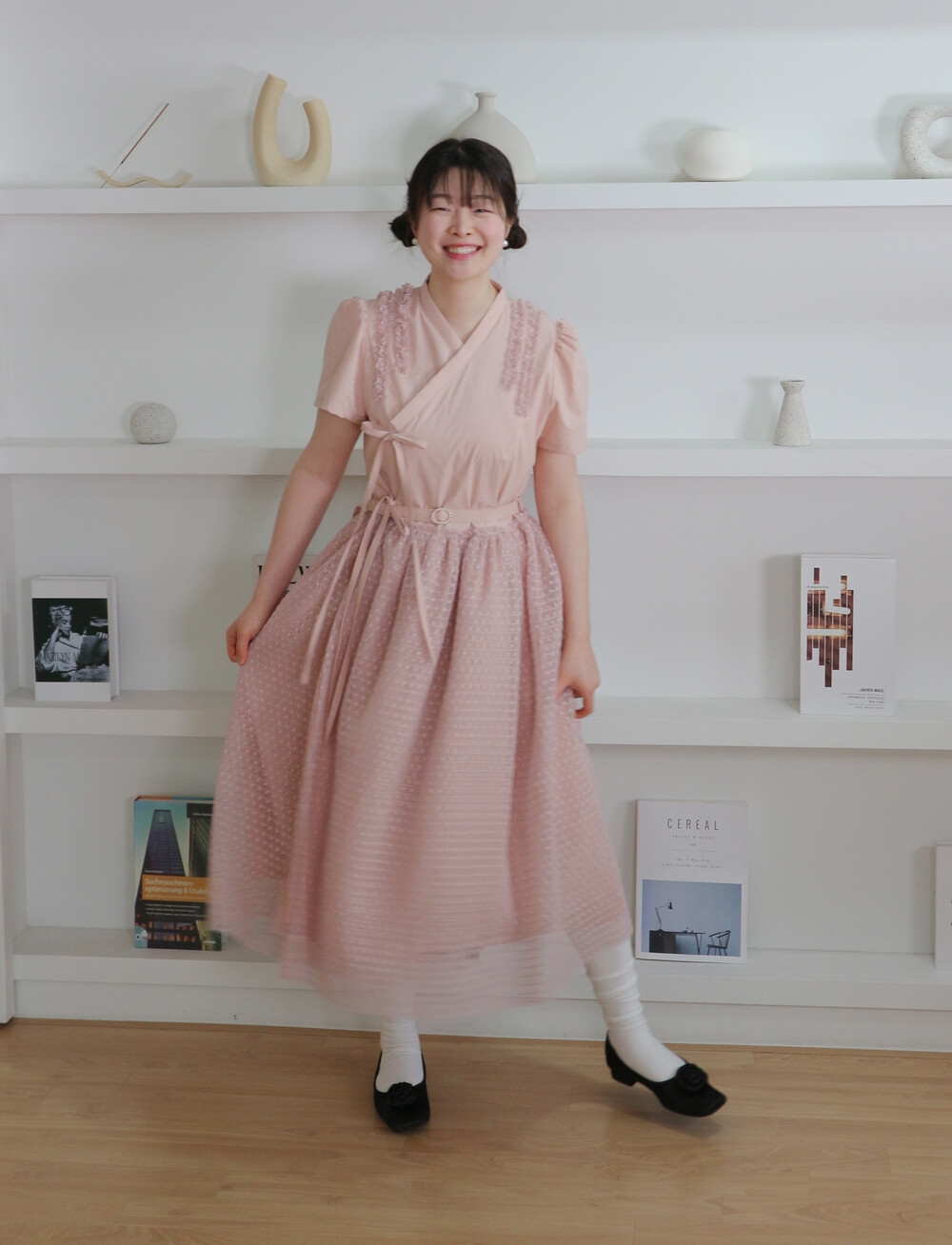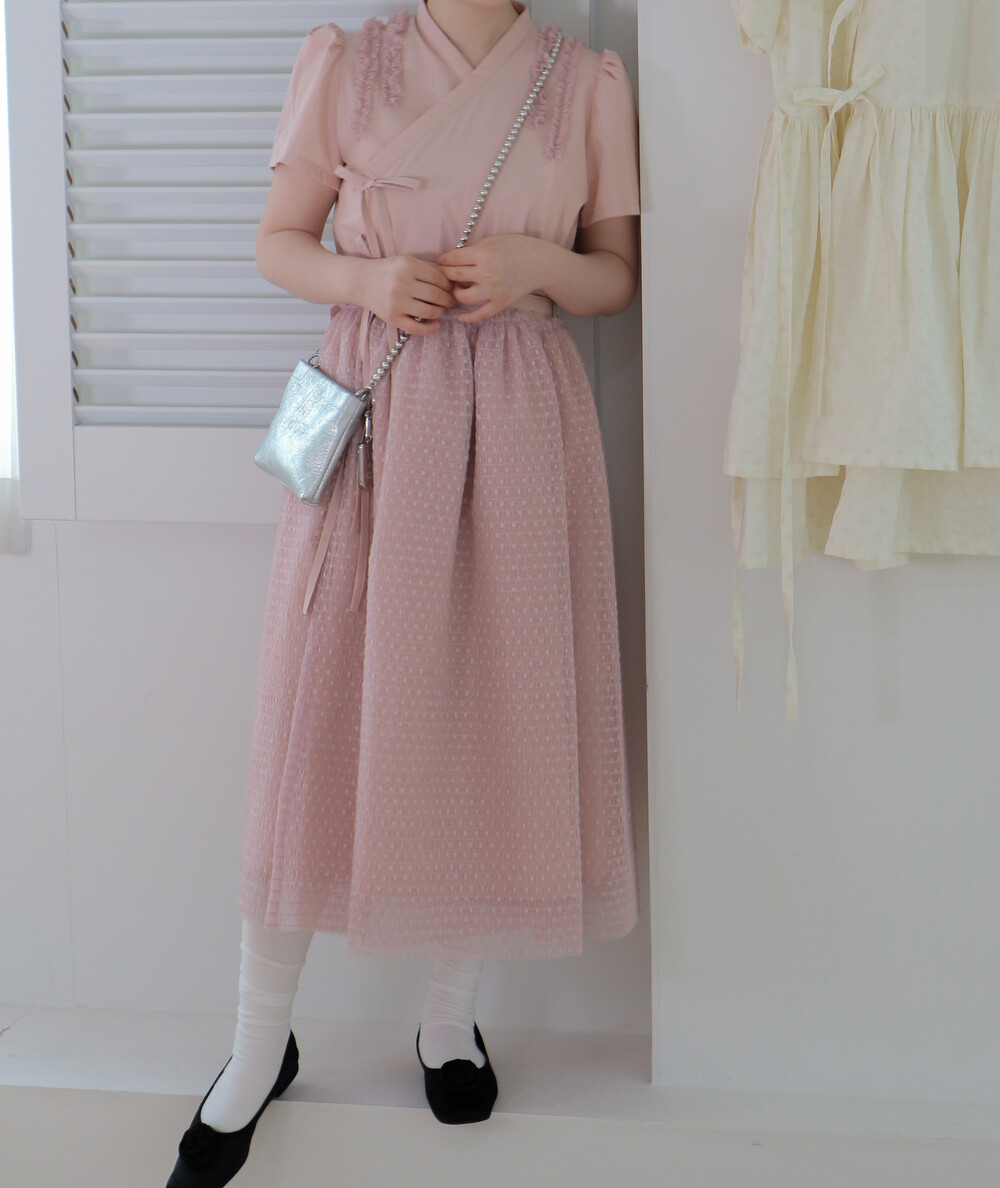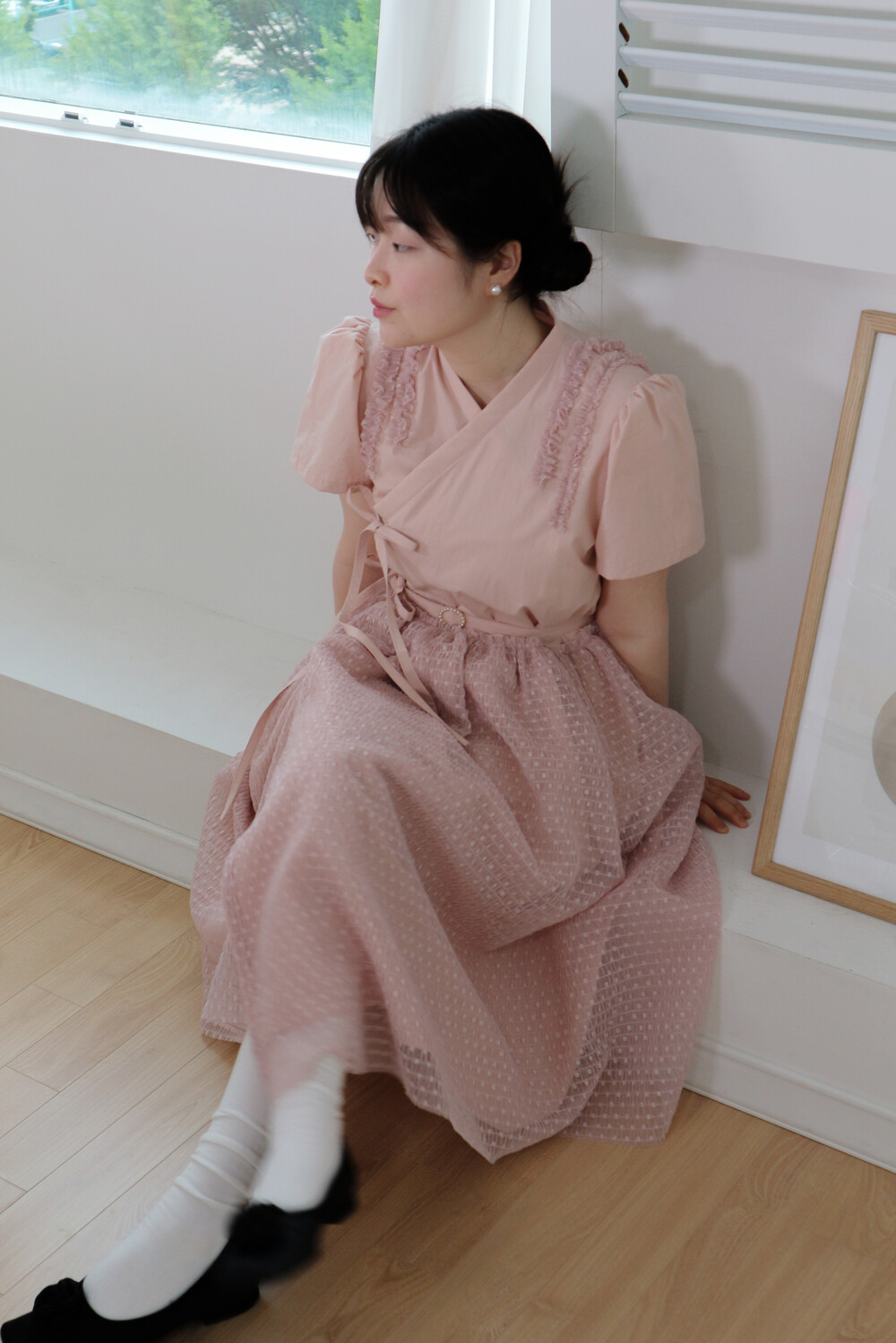 차분한 더스티 핑크색의 튤(레이스)을 치마 부분에 한겹 얹어 특별함을 더하였습니다.