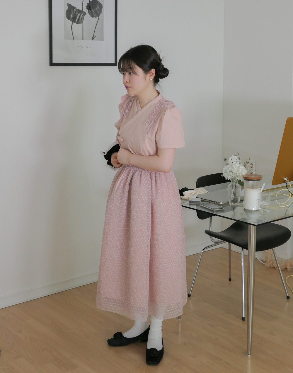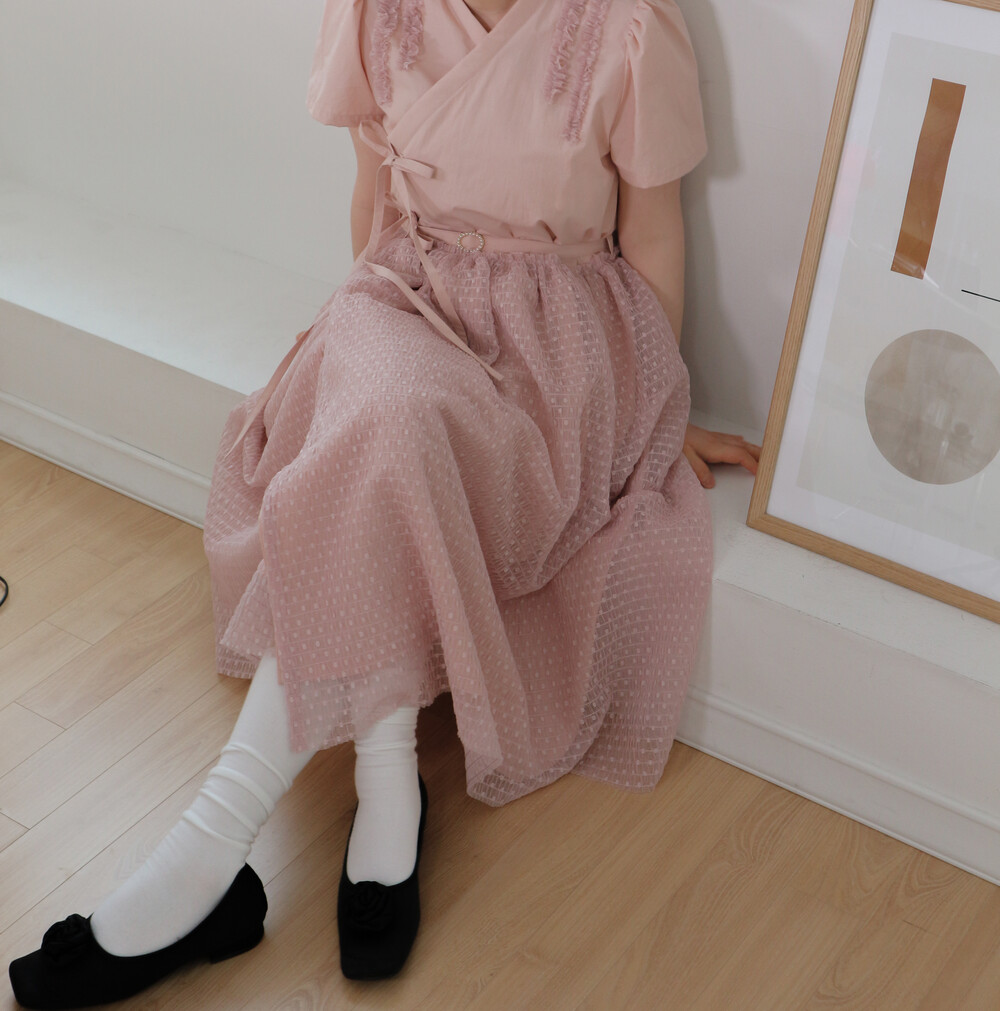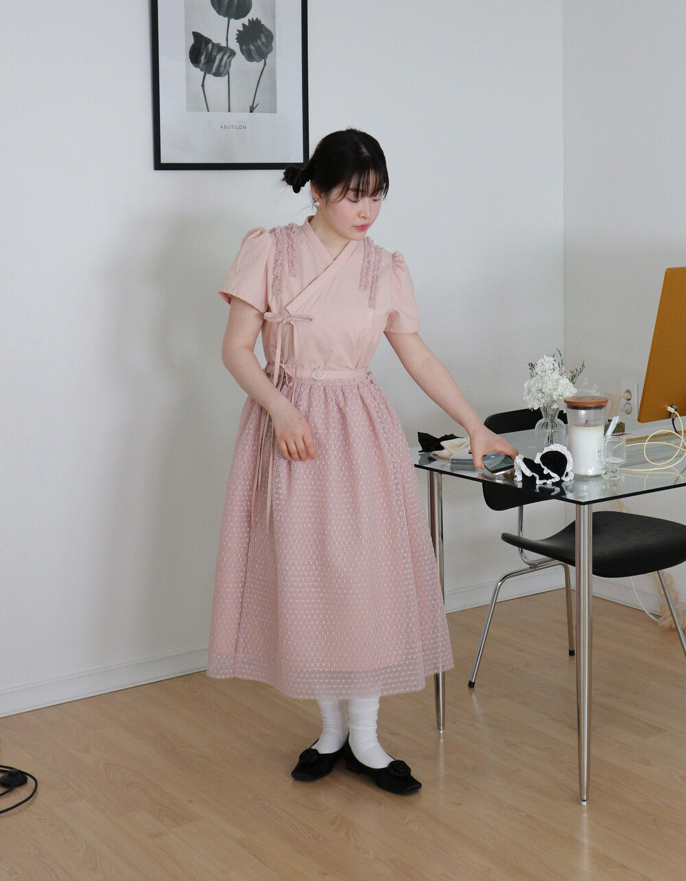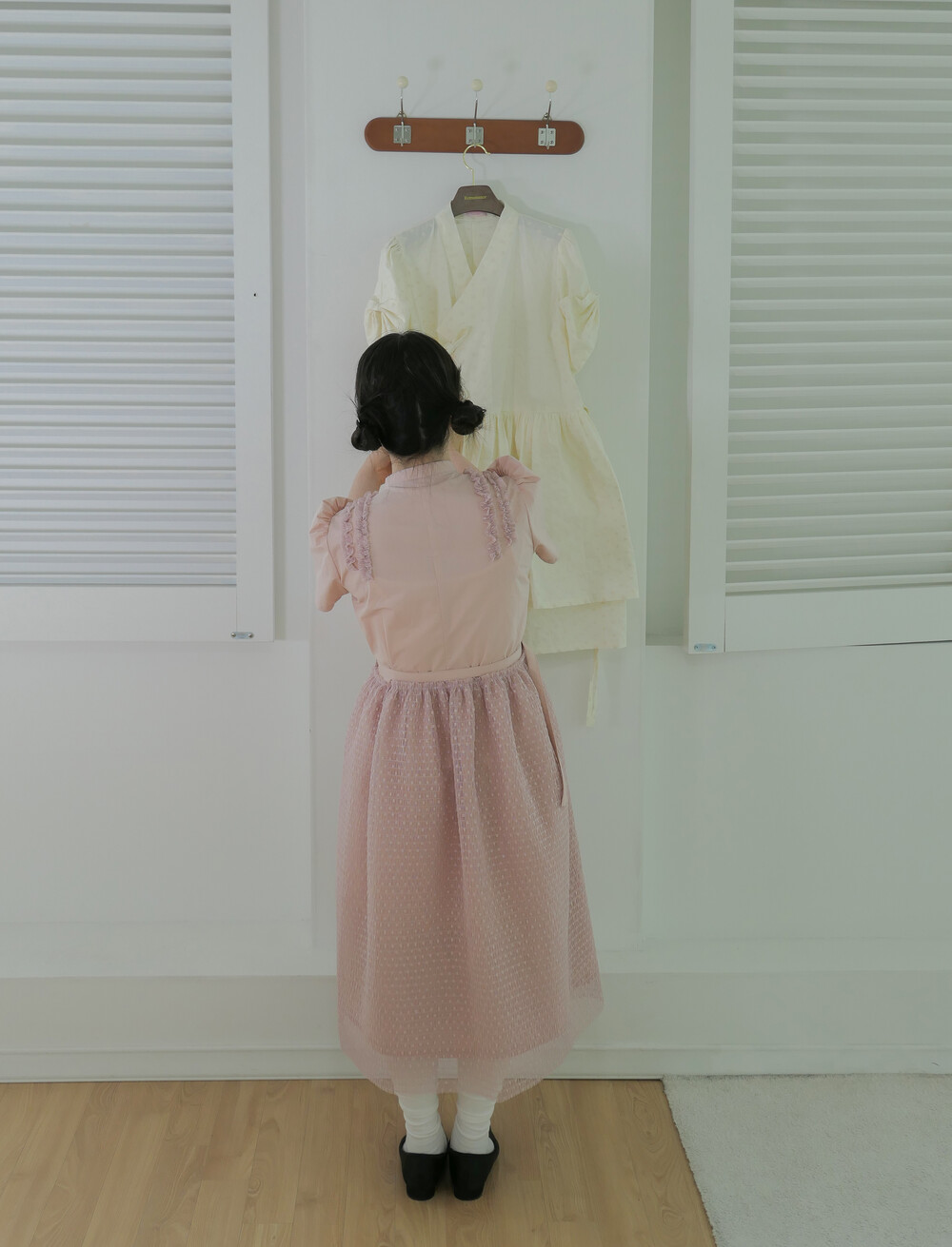 차분한 더스티 핑크색의 튤(레이스)을 치마 부분에 한겹 얹어 특별함을 더하였습니다.
