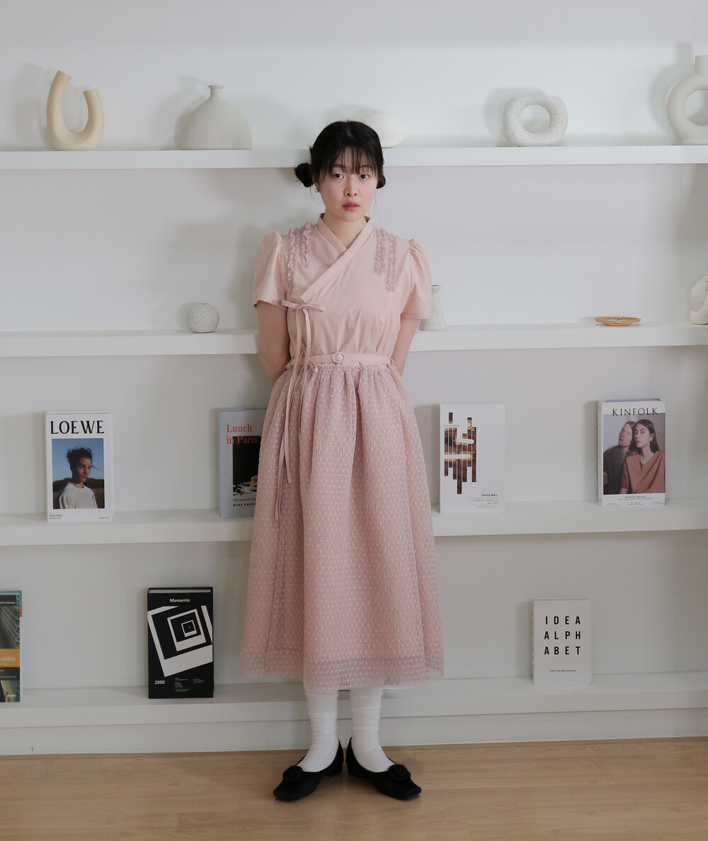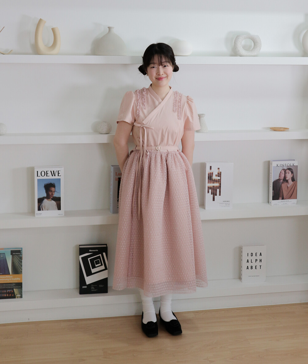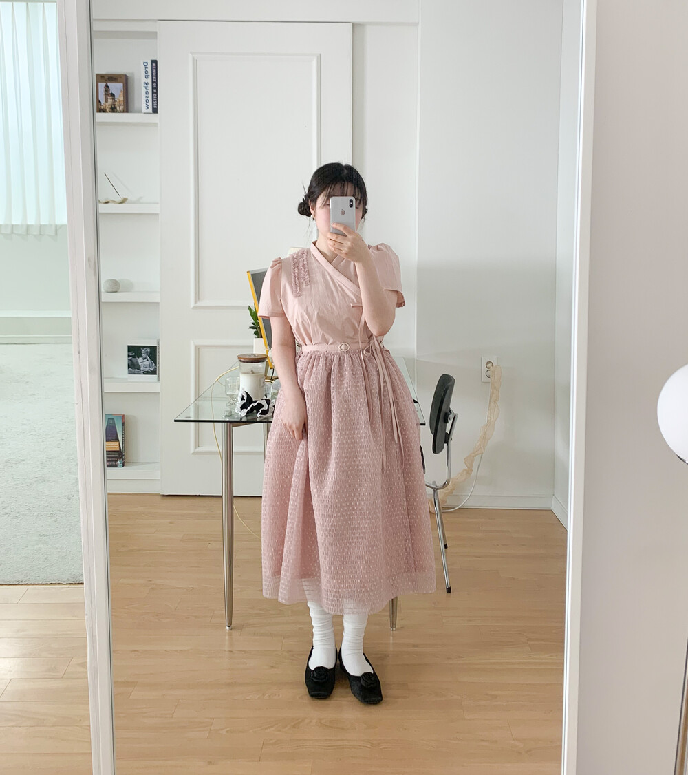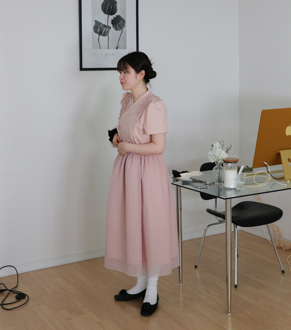 차분한 더스티 핑크색의 튤(레이스)을 치마 부분에 한겹 얹어 특별함을 더하였습니다.
