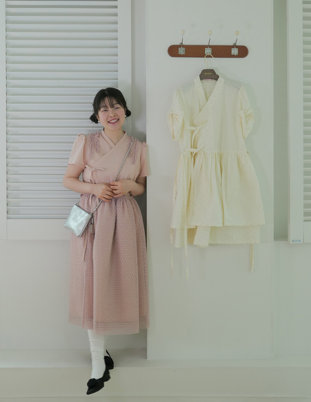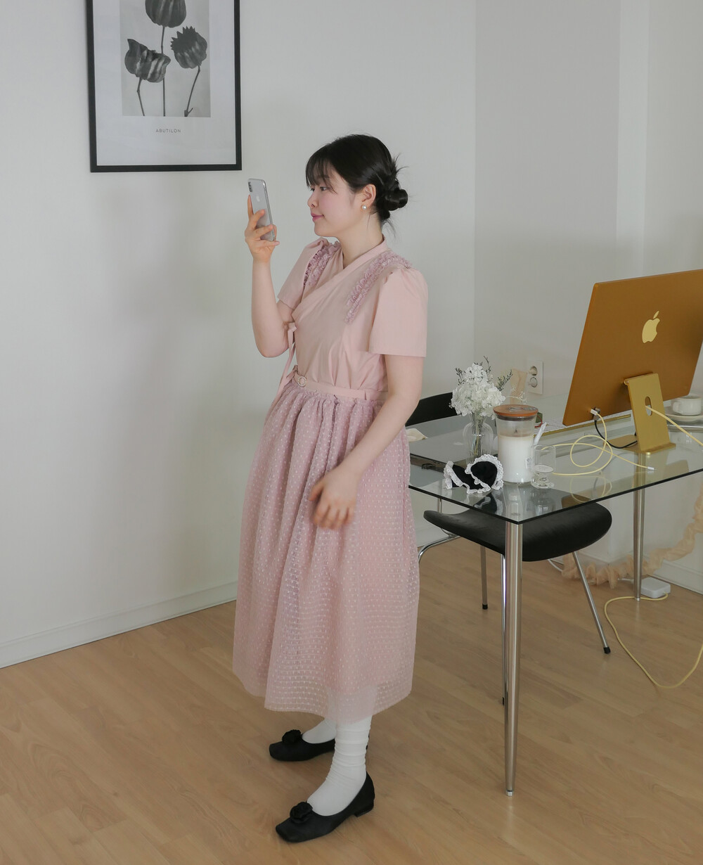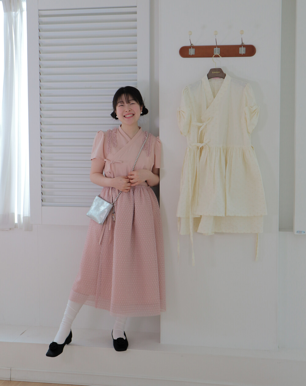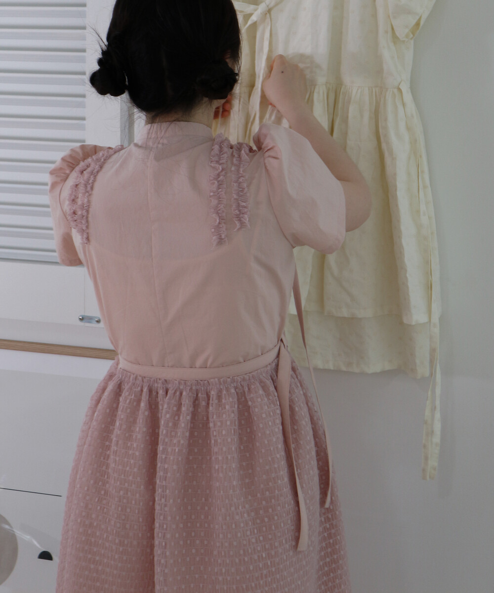 튤 원단을 작게 셔링잡아 어깨 부분에도 포인트를 주어 발레코어 느낌의 사랑스러운 원피스입니다.