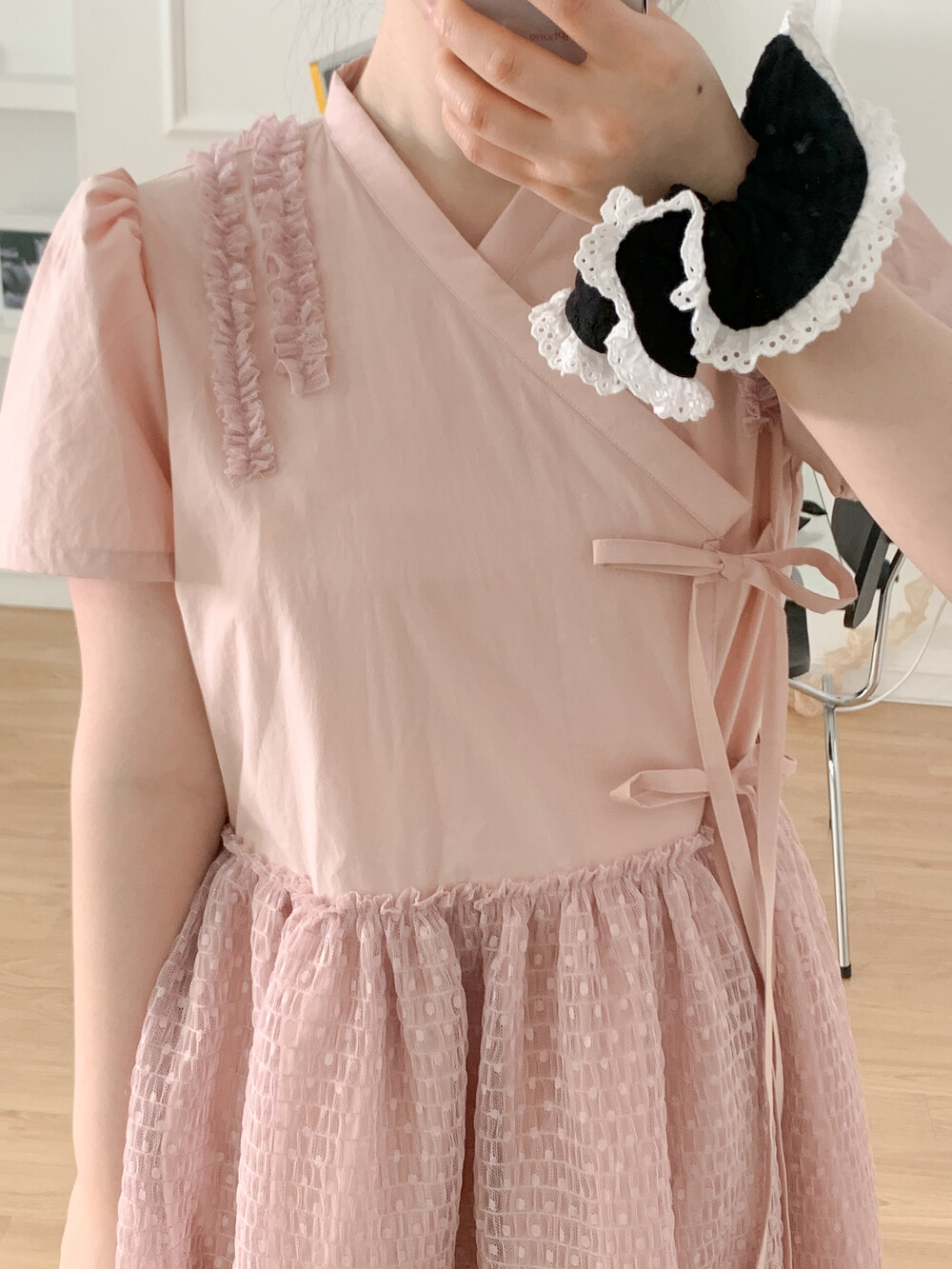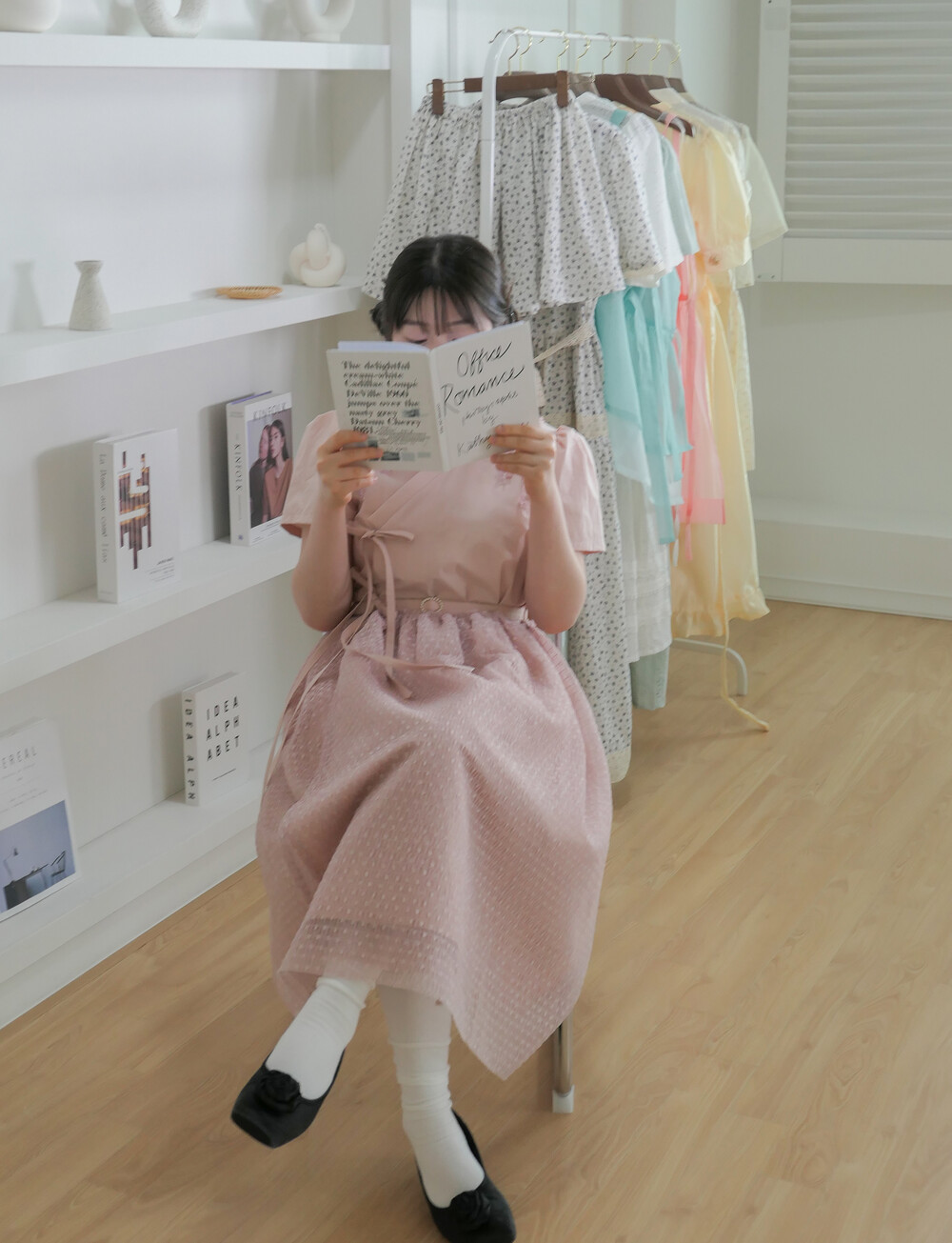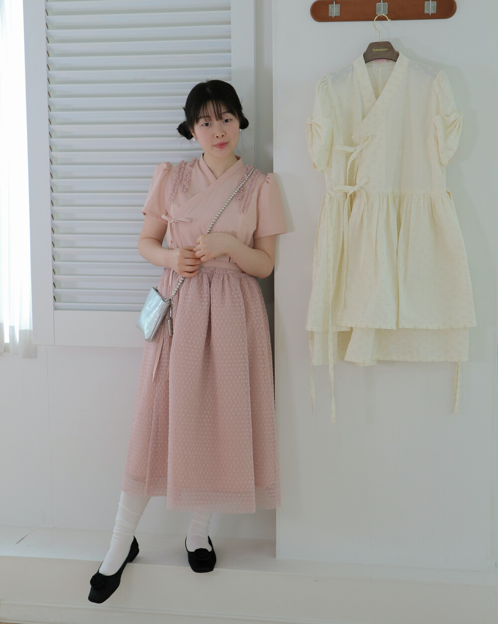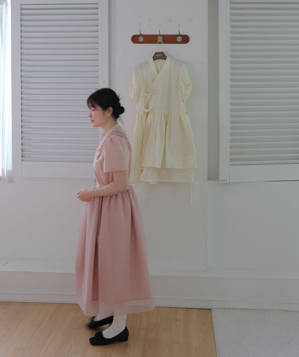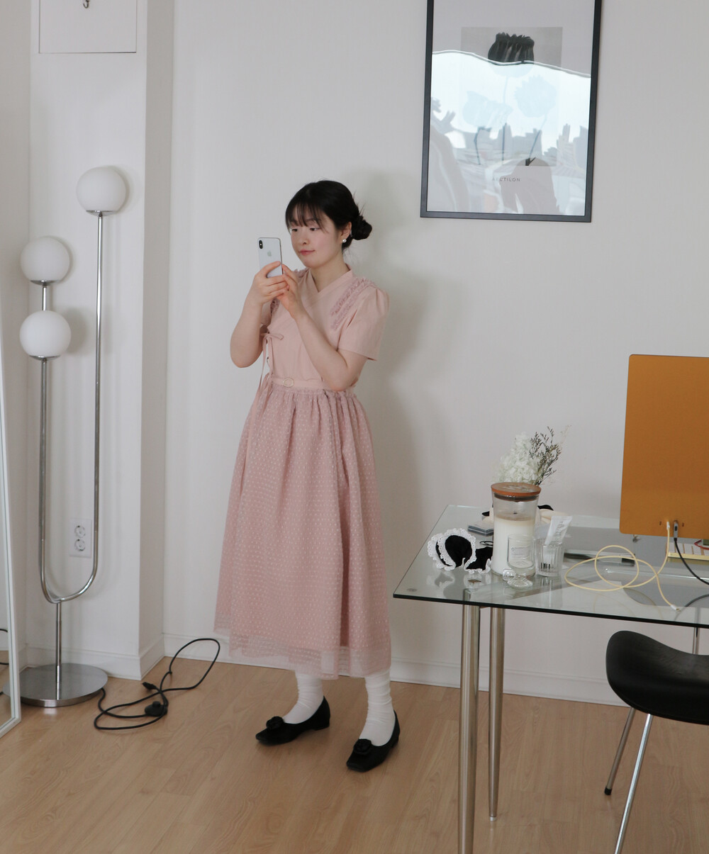 튤 원단을 작게 셔링잡아 어깨 부분에도 포인트를 주어 발레코어 느낌의 사랑스러운 원피스입니다.
