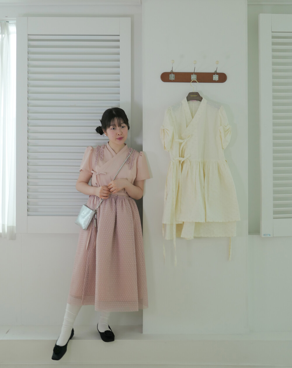 화사한 색감에 리본 자수 프릴 등 사랑스러운 디테일을 가득 넣어 레트로맨스만의 무드로