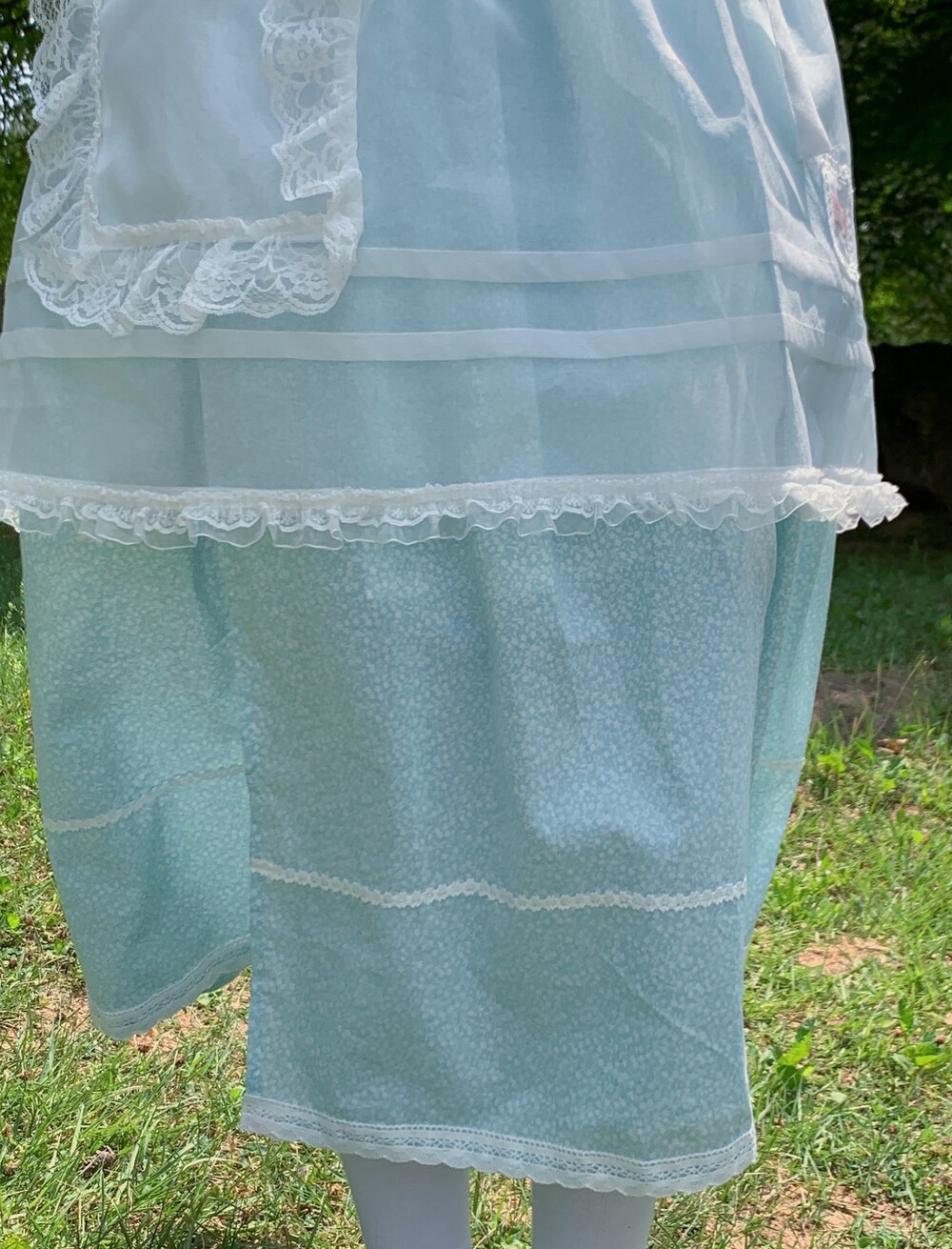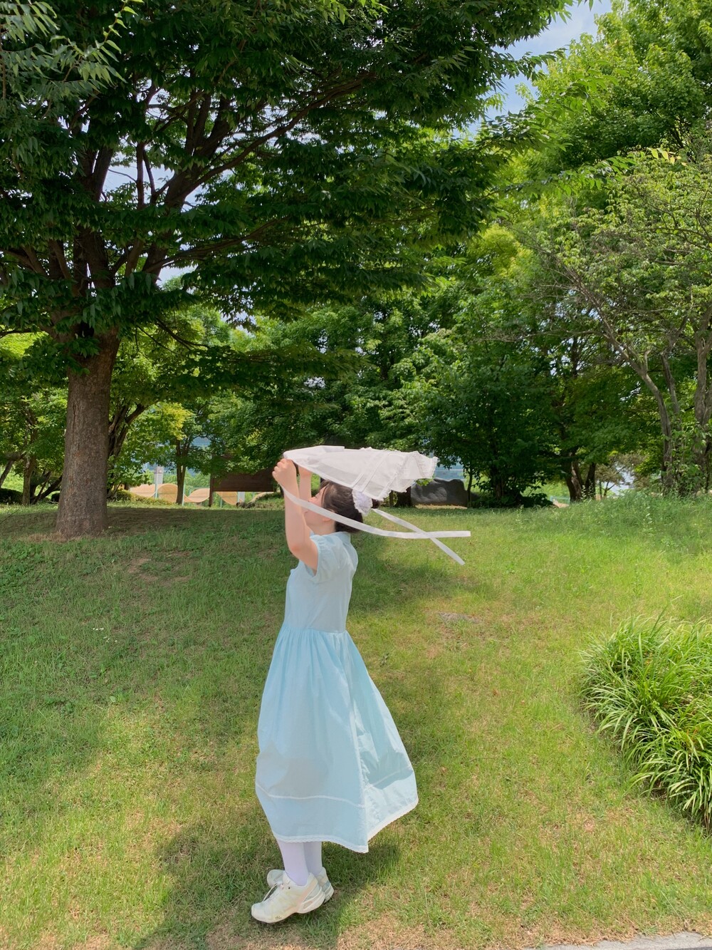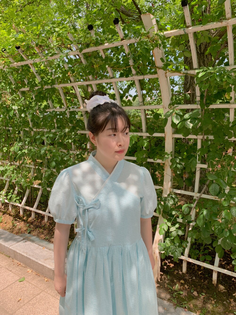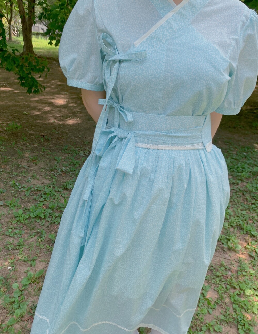 화이트 레이스로 여름여름하게 포인트를 주었고, 스커트 밑단 레이스가 원단을 더욱 사랑스럽게 만들어줍니다.