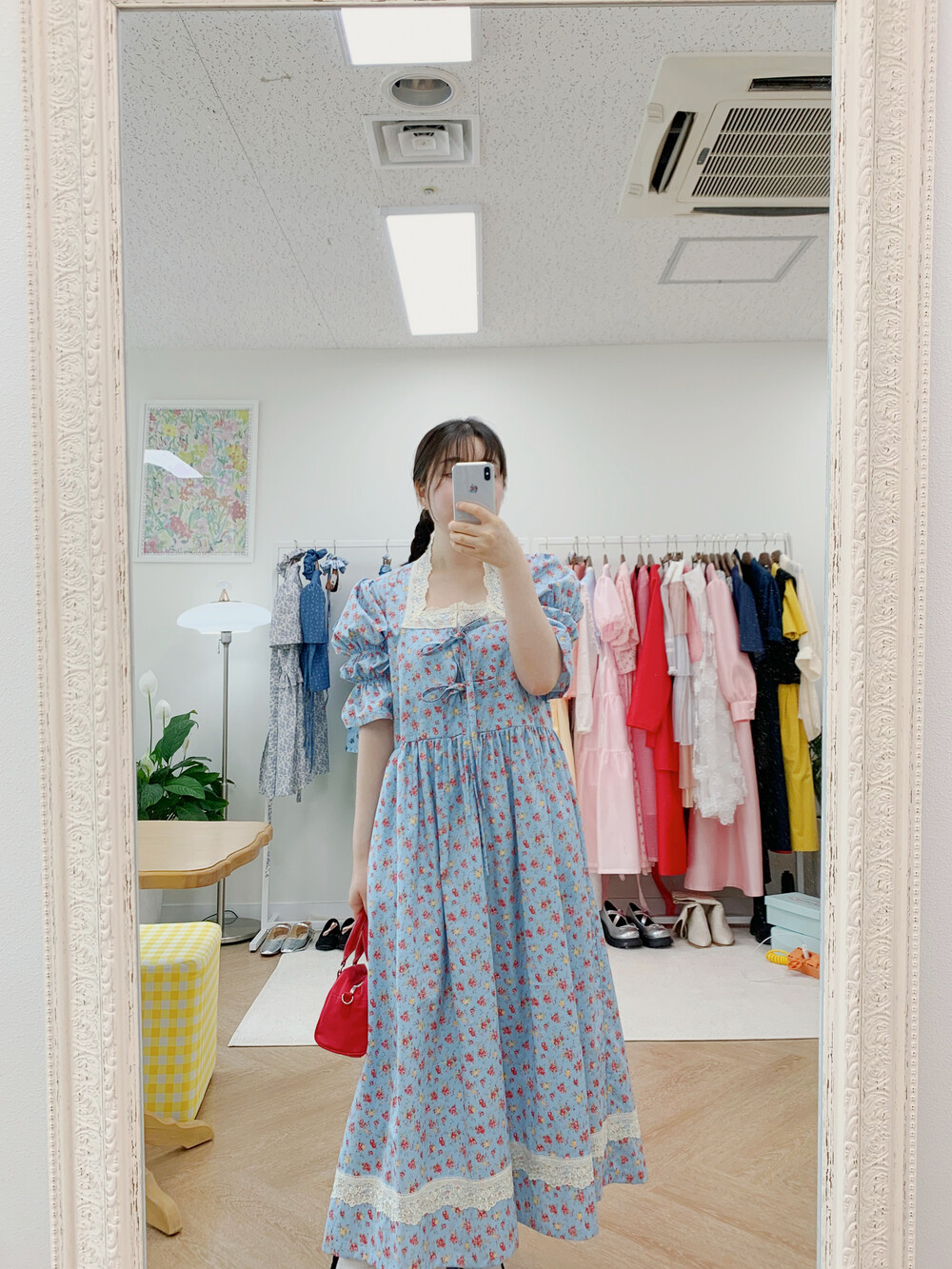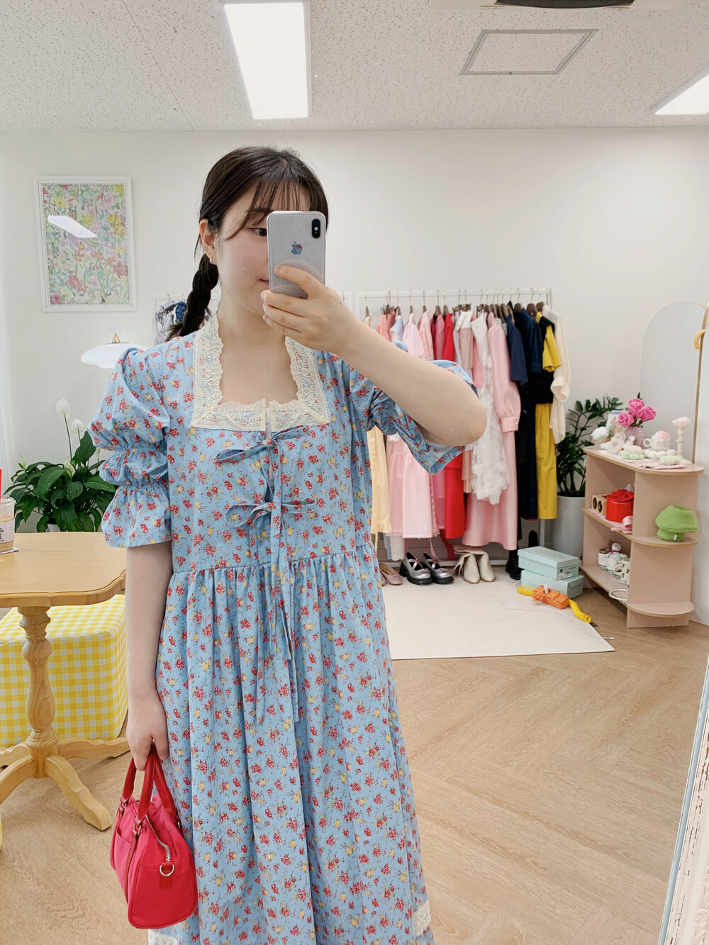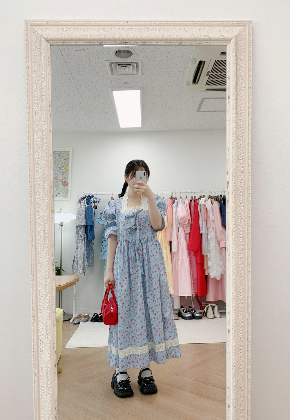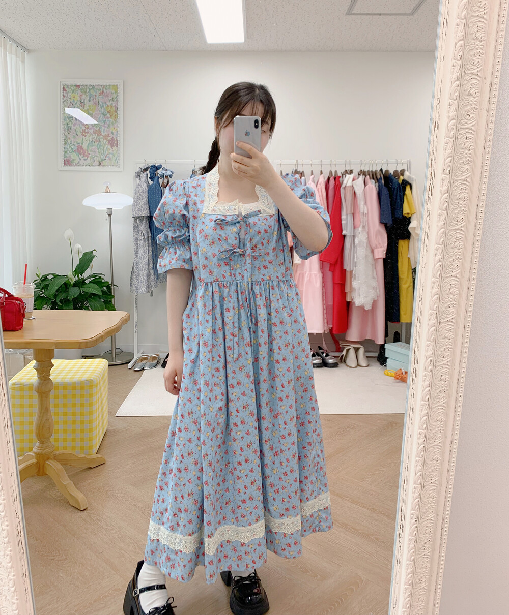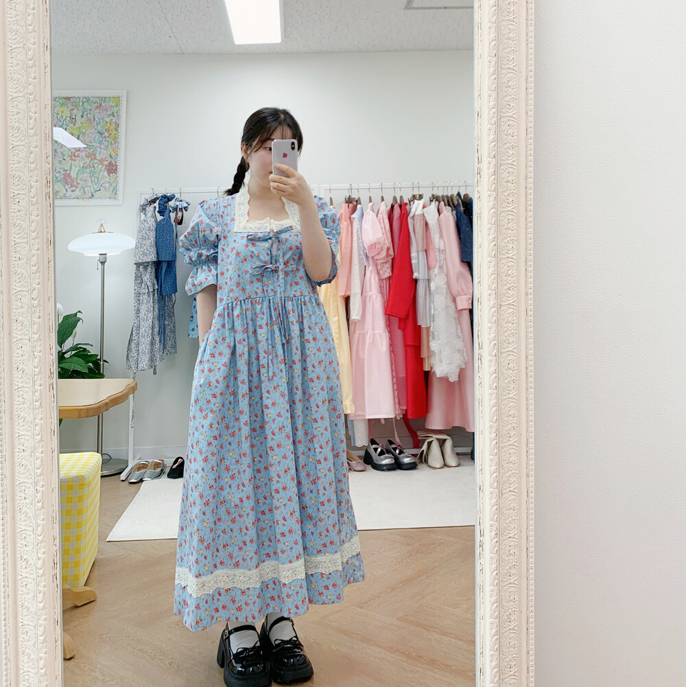 빈티지 블루 플라워 원피스+체크헤어슈슈