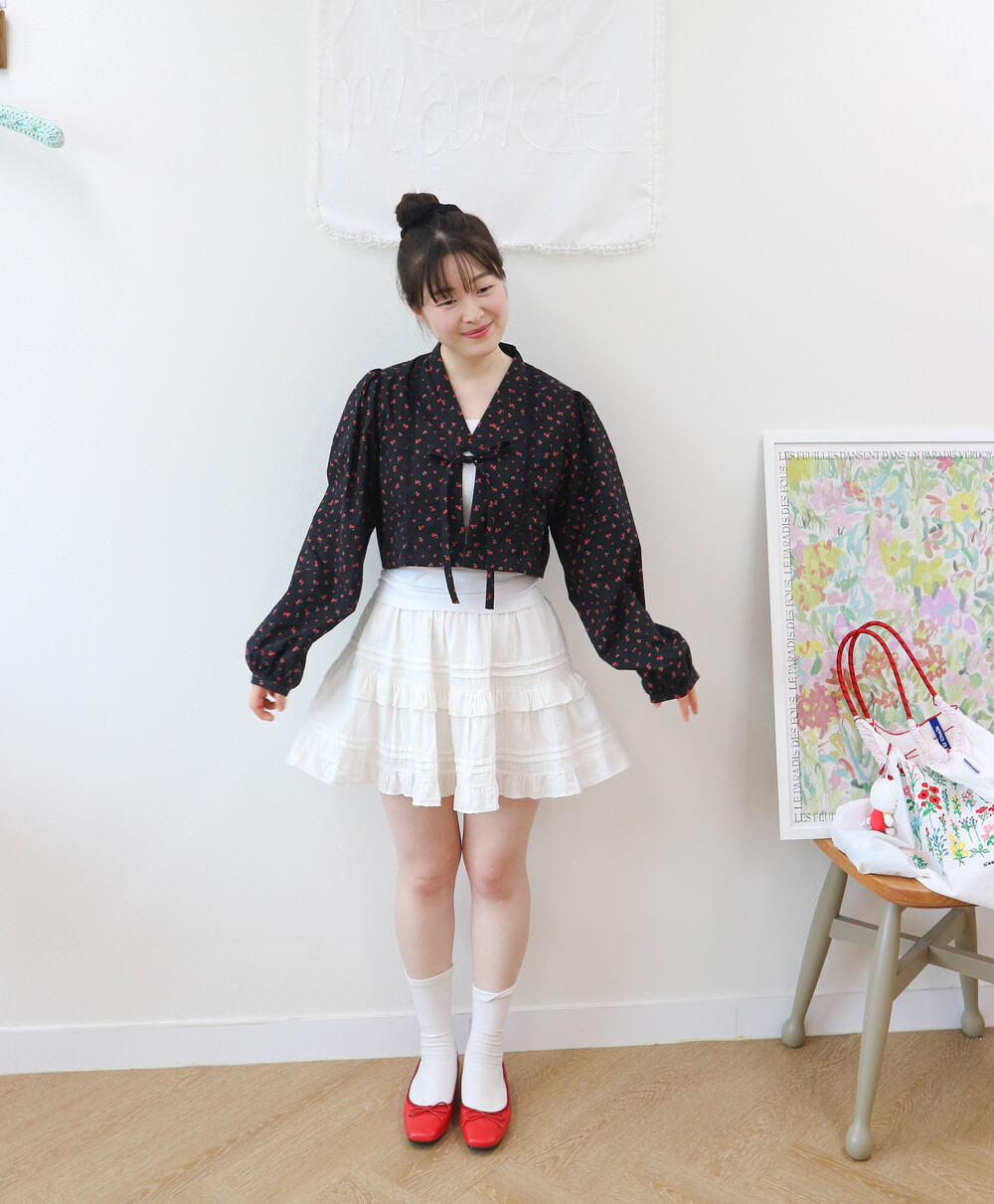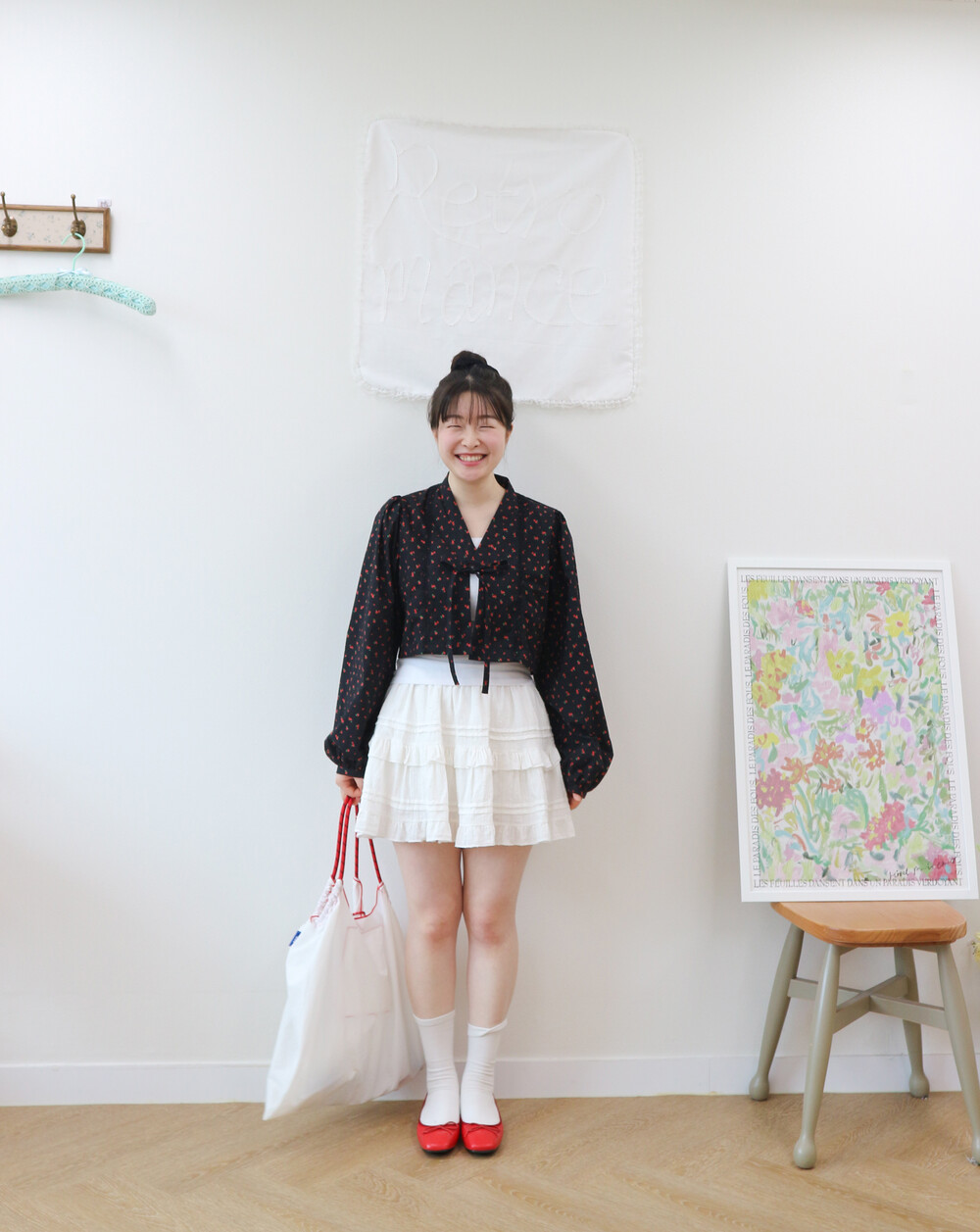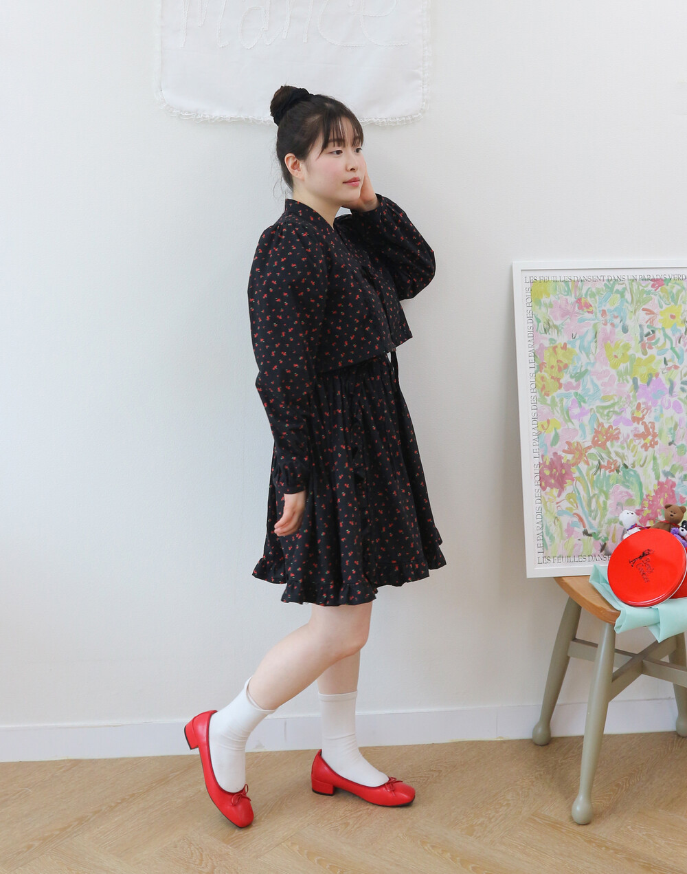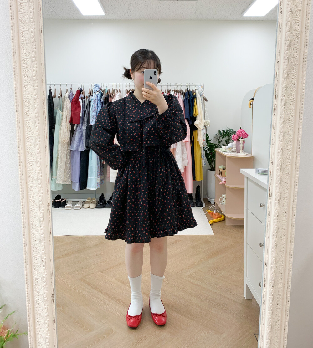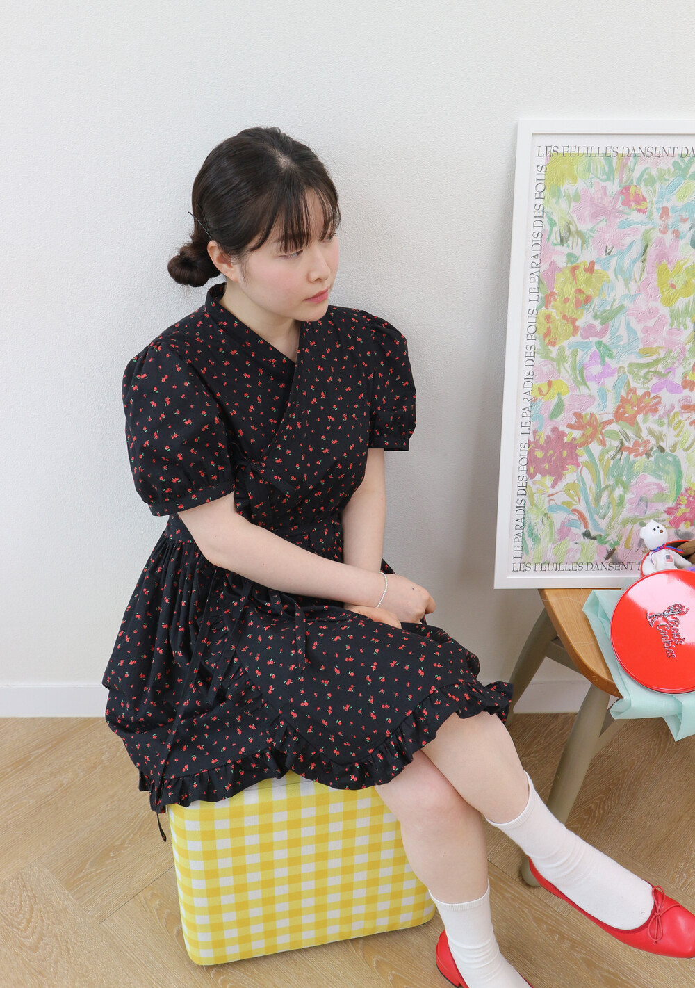 프릴 디테일이 상의 여밈단 끝을 따라 치마 까지 이어지도록 제작하여 디테일을 더하고 풍성한