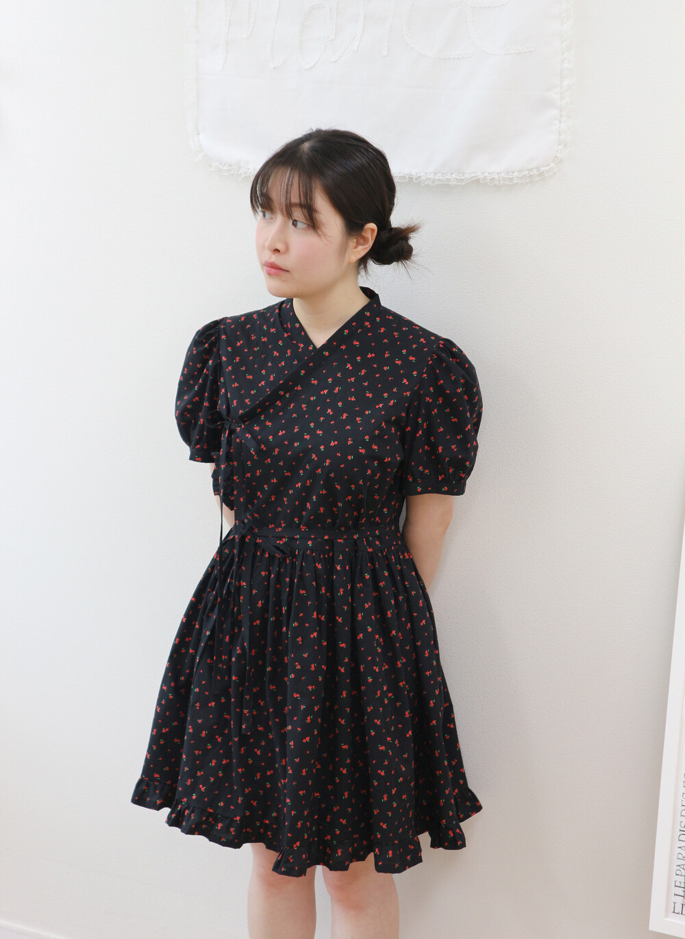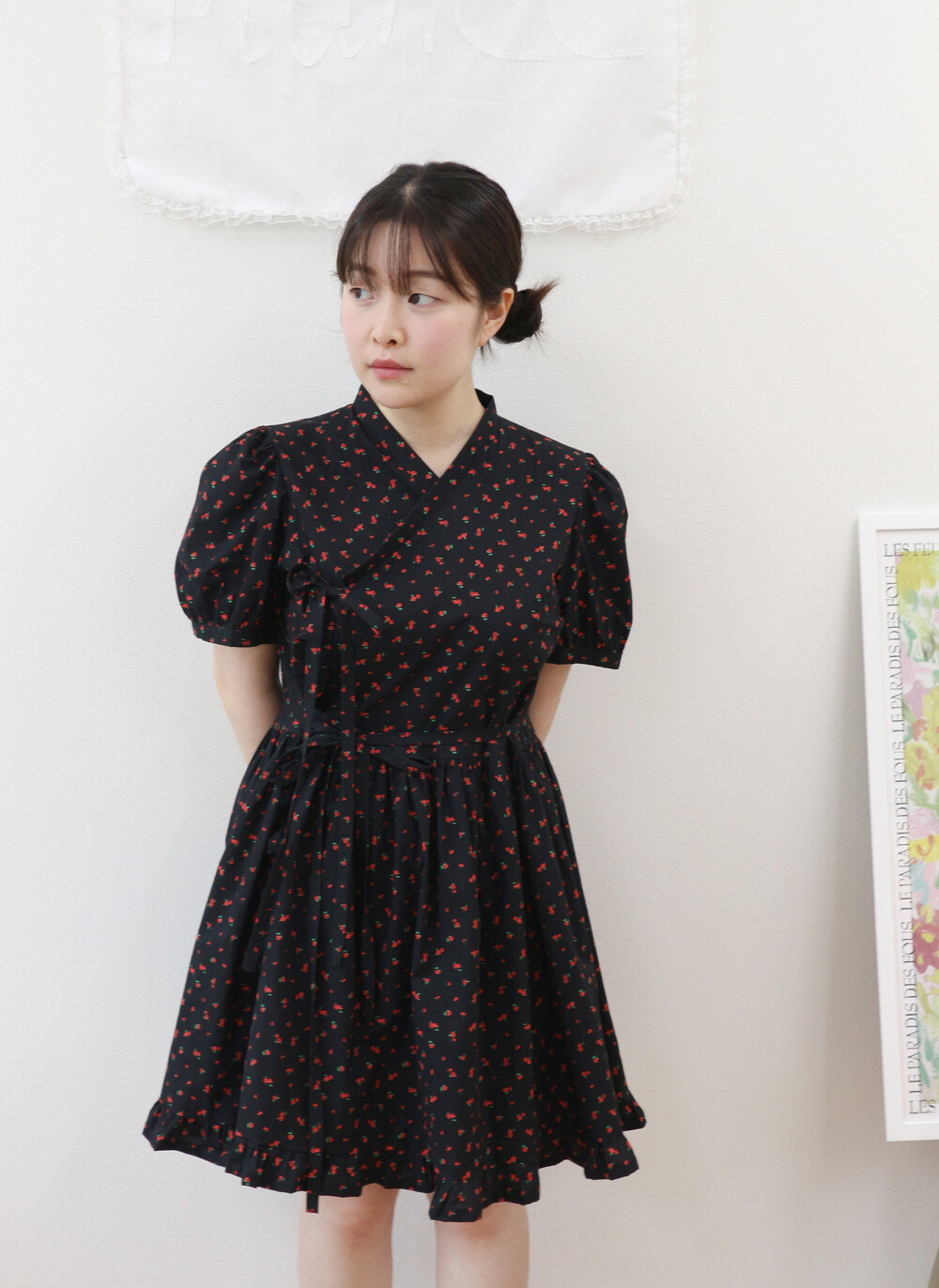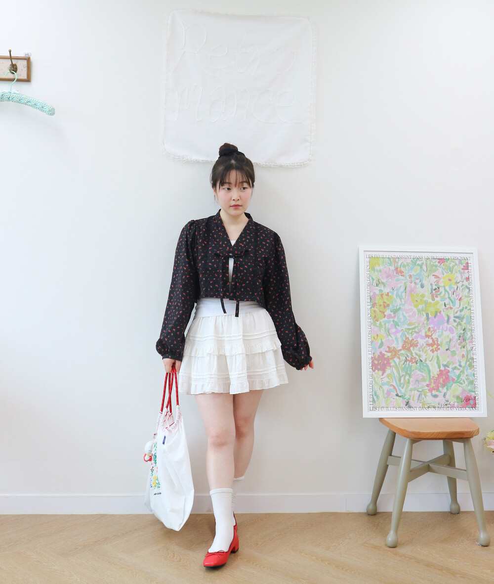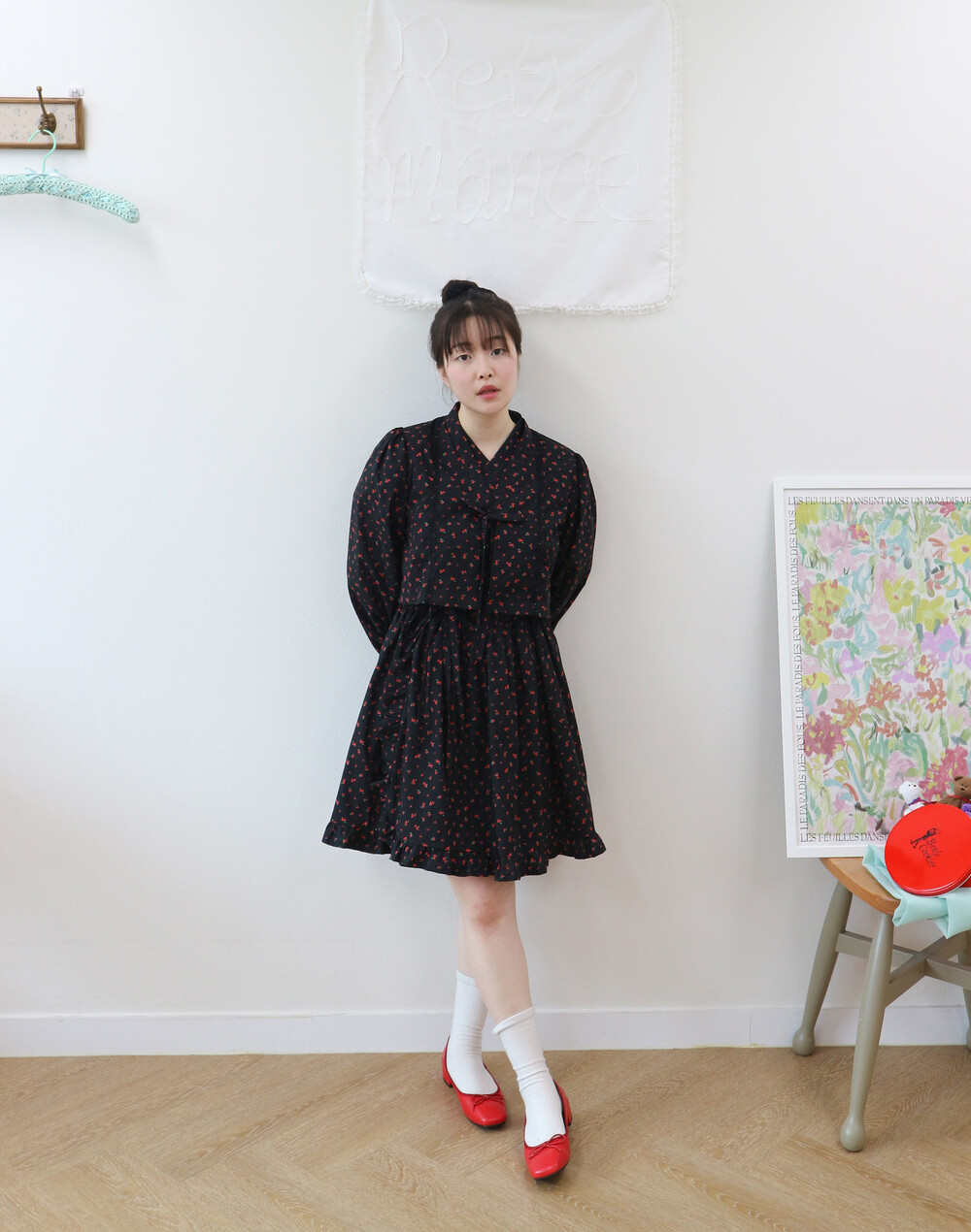 프릴 디테일이 상의 여밈단 끝을 따라 치마 까지 이어지도록 제작하여 디테일을 더하고 풍성한