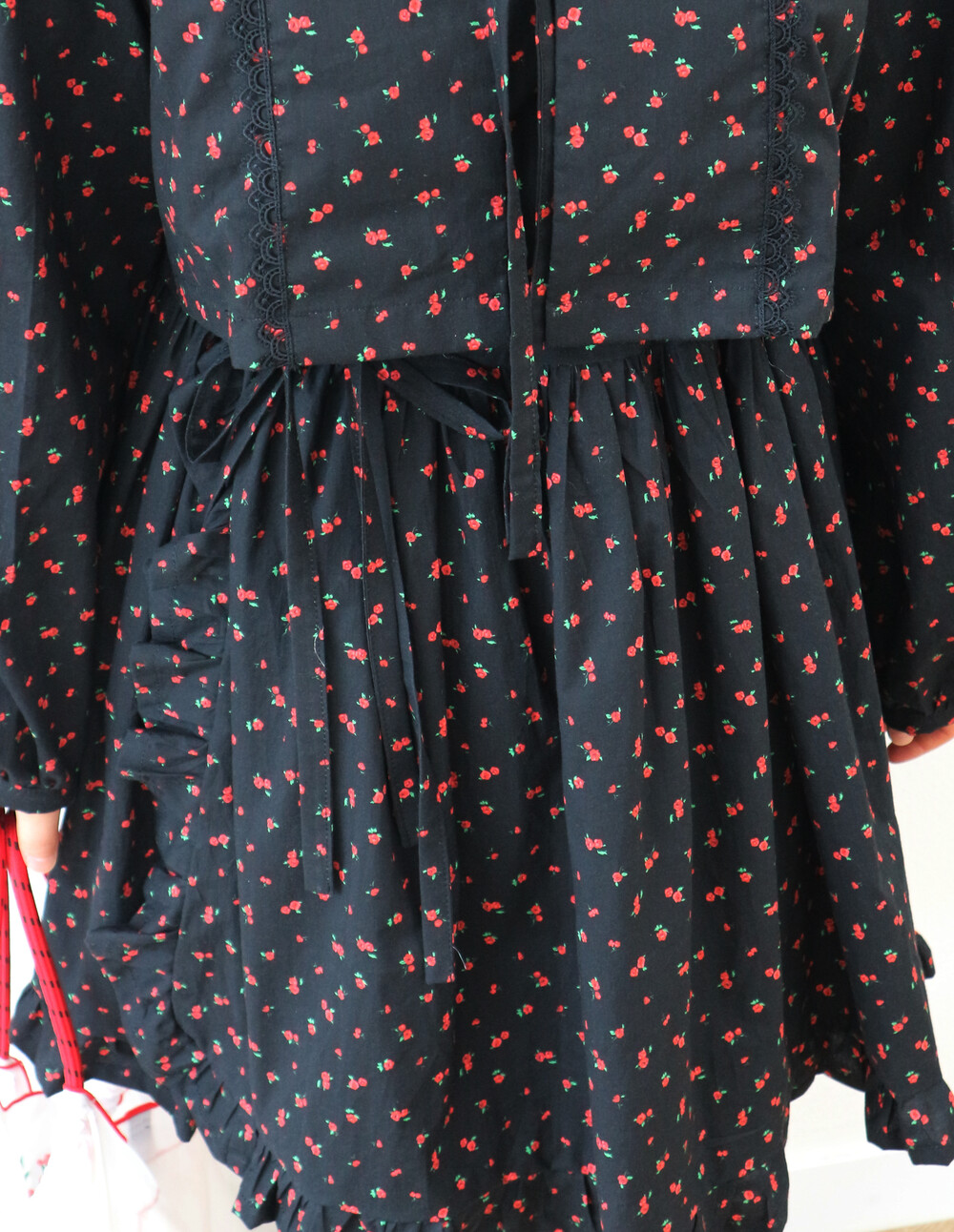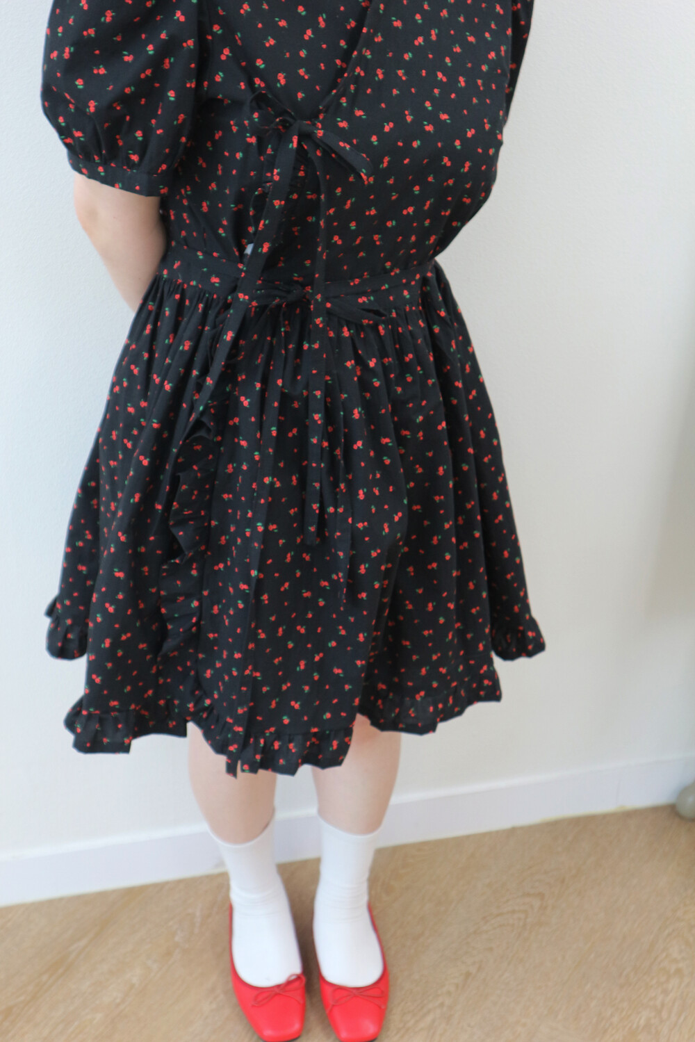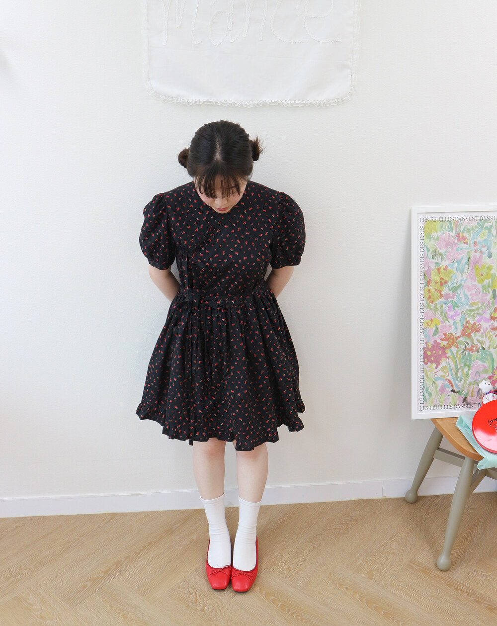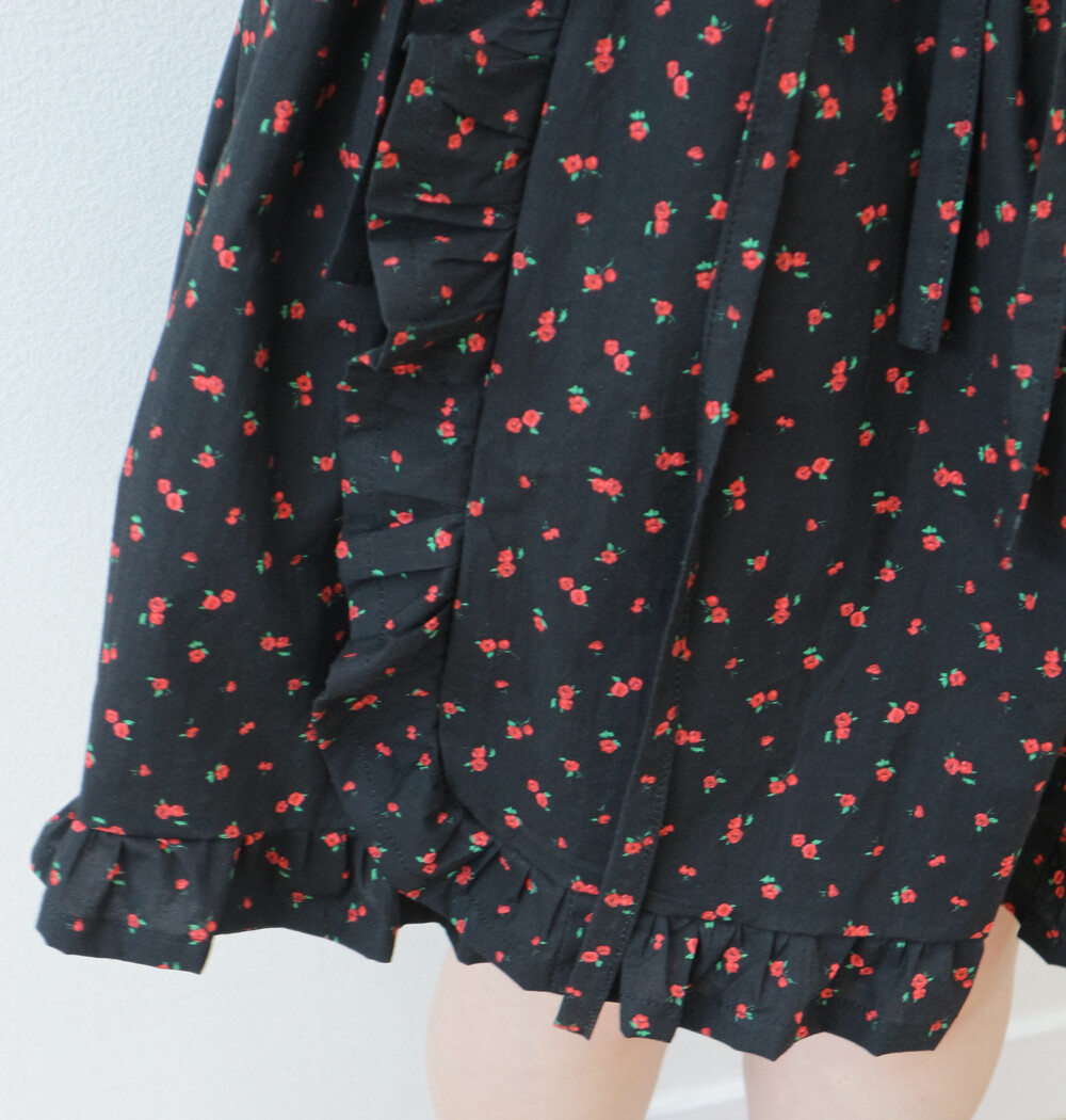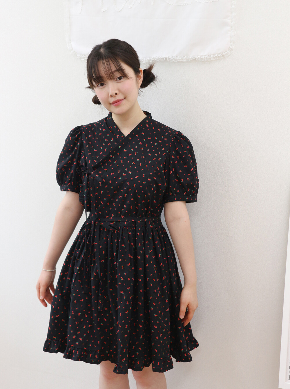 프릴 디테일이 상의 여밈단 끝을 따라 치마 까지 이어지도록 제작하여 디테일을 더하고 풍성한