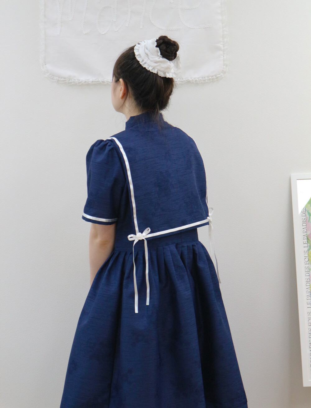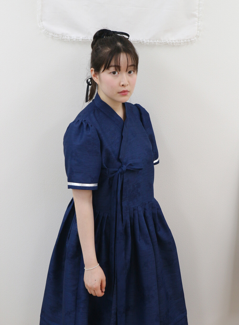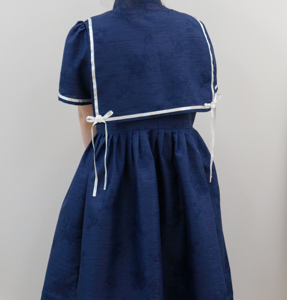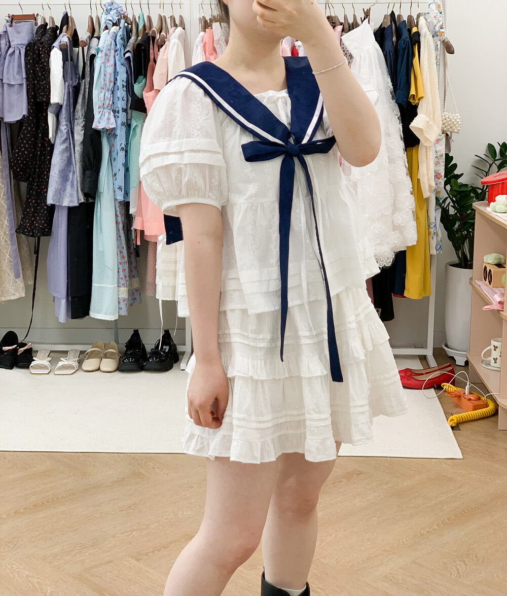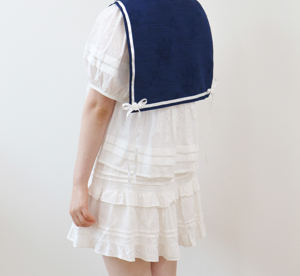 짧게 제작된 소매길이에 광택이 있는 화이트 리본으로 라인을 두르고, 주름을 작게 잡아 치마를 연결하였습니다.