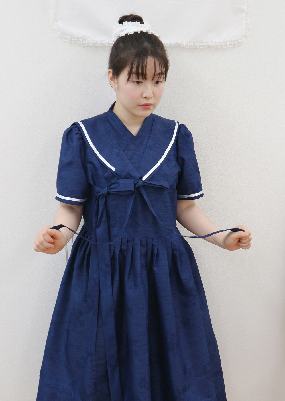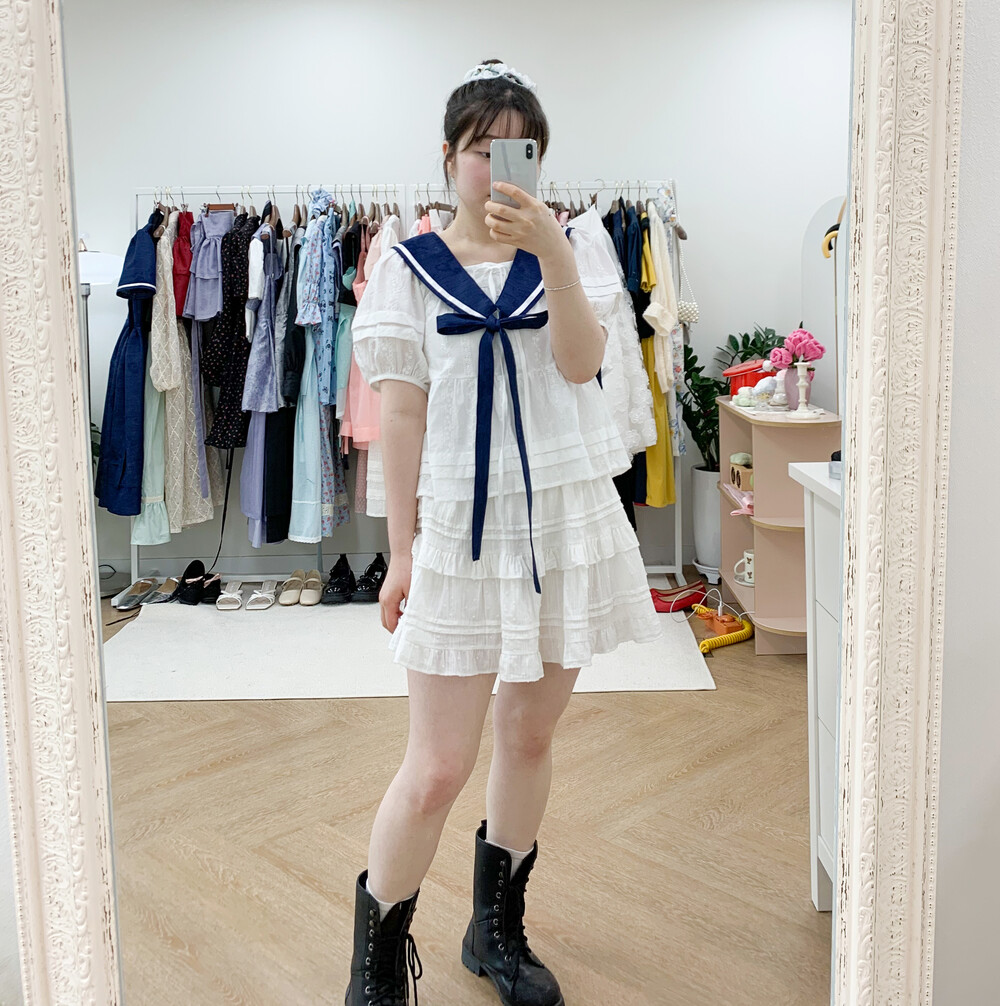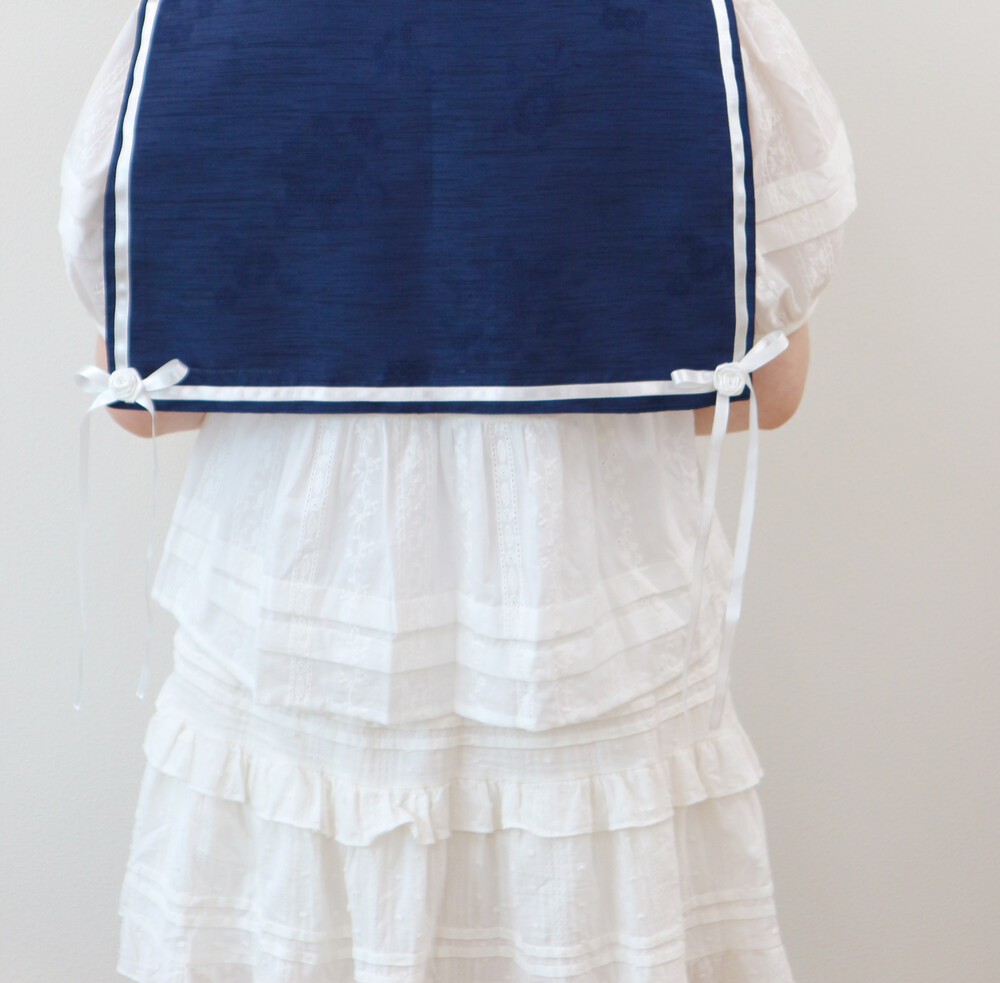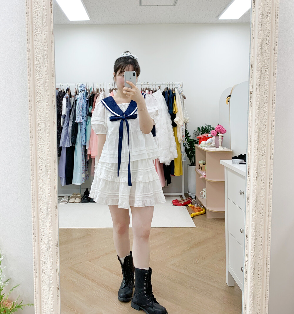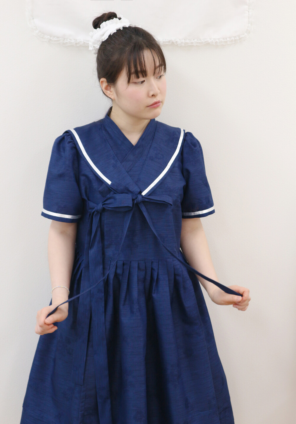 짧게 제작된 소매길이에 광택이 있는 화이트 리본으로 라인을 두르고, 주름을 작게 잡아 치마를 연결하였습니다.