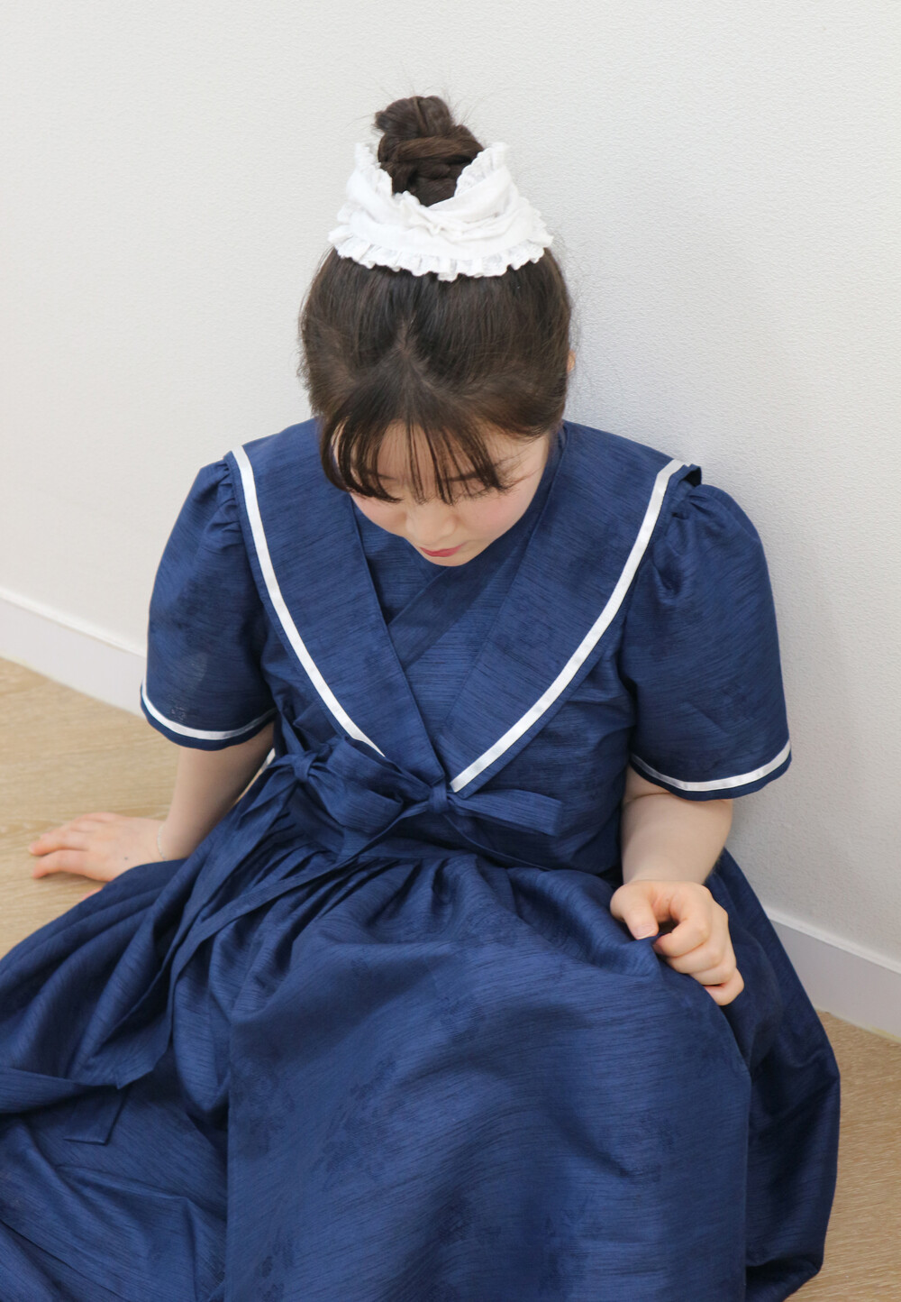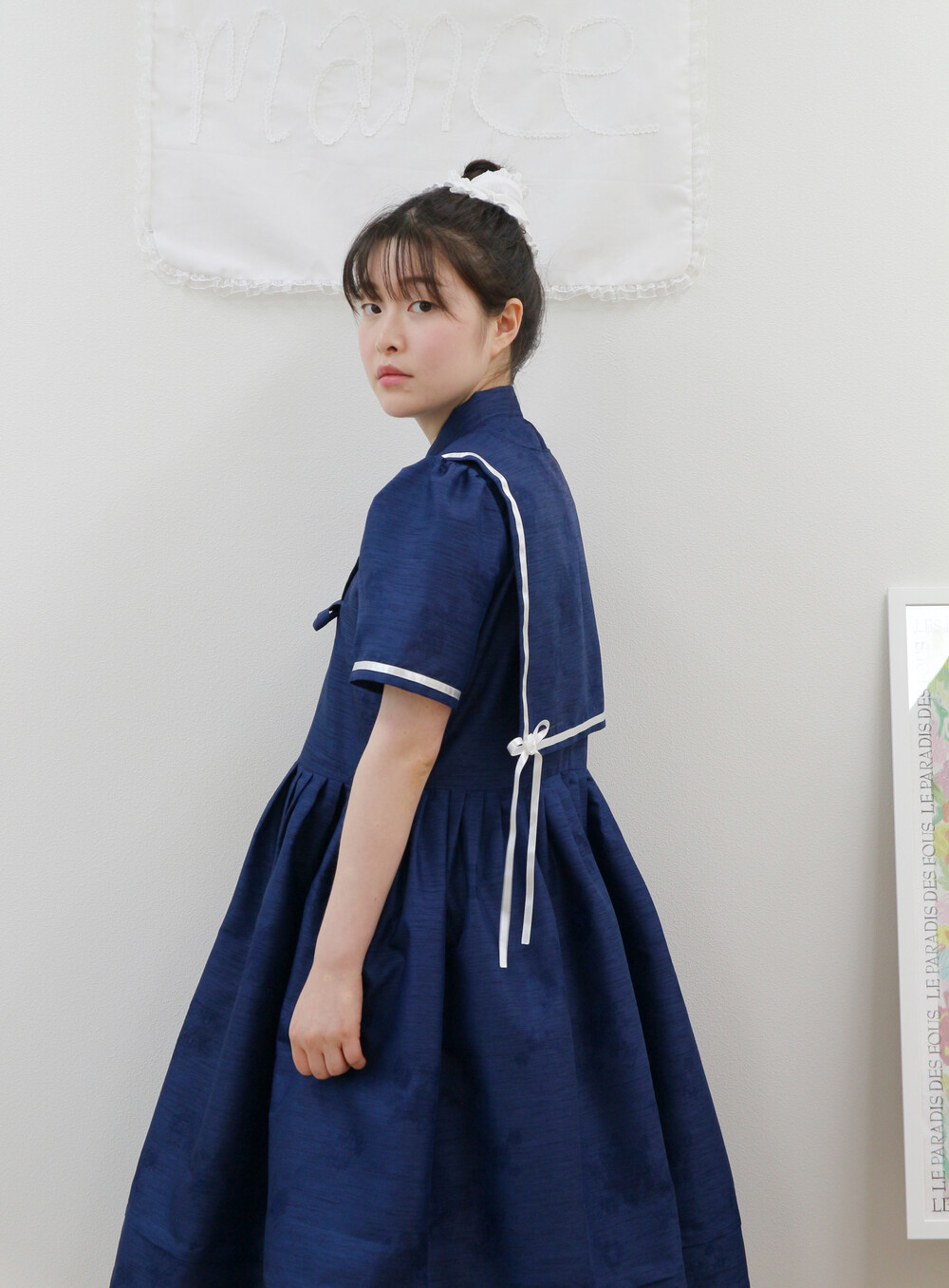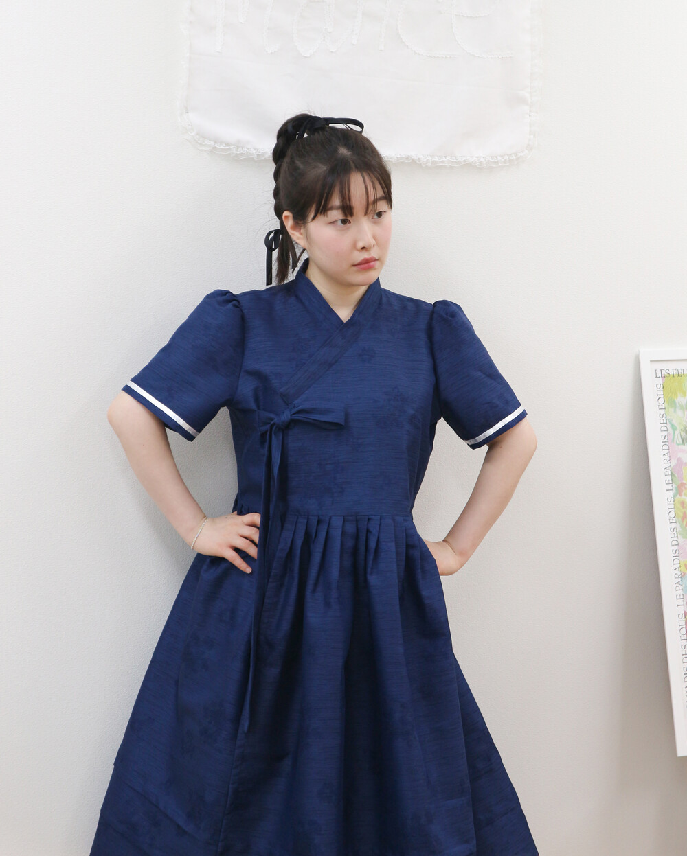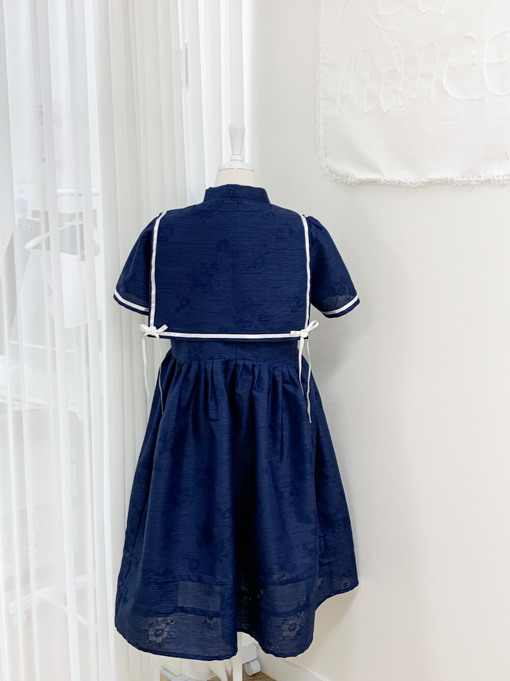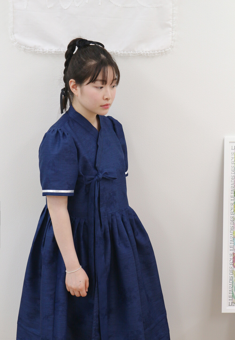 짧게 제작된 소매길이에 광택이 있는 화이트 리본으로 라인을 두르고, 주름을 작게 잡아 치마를 연결하였습니다.