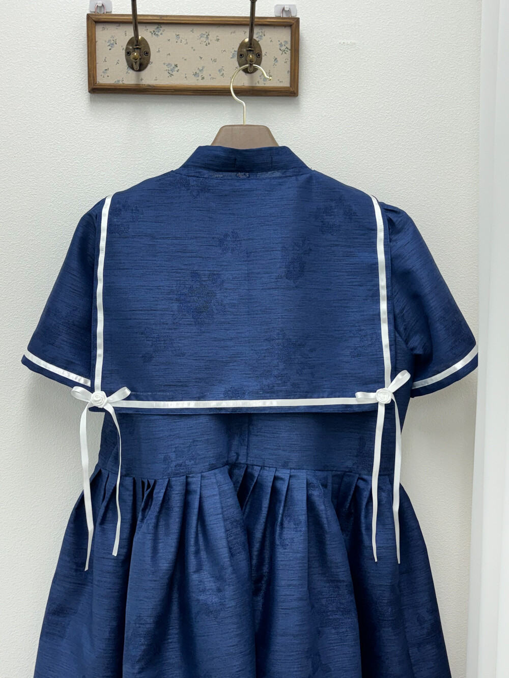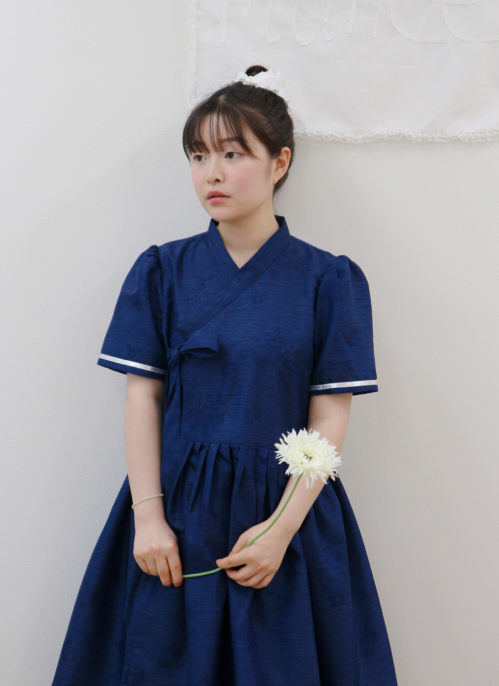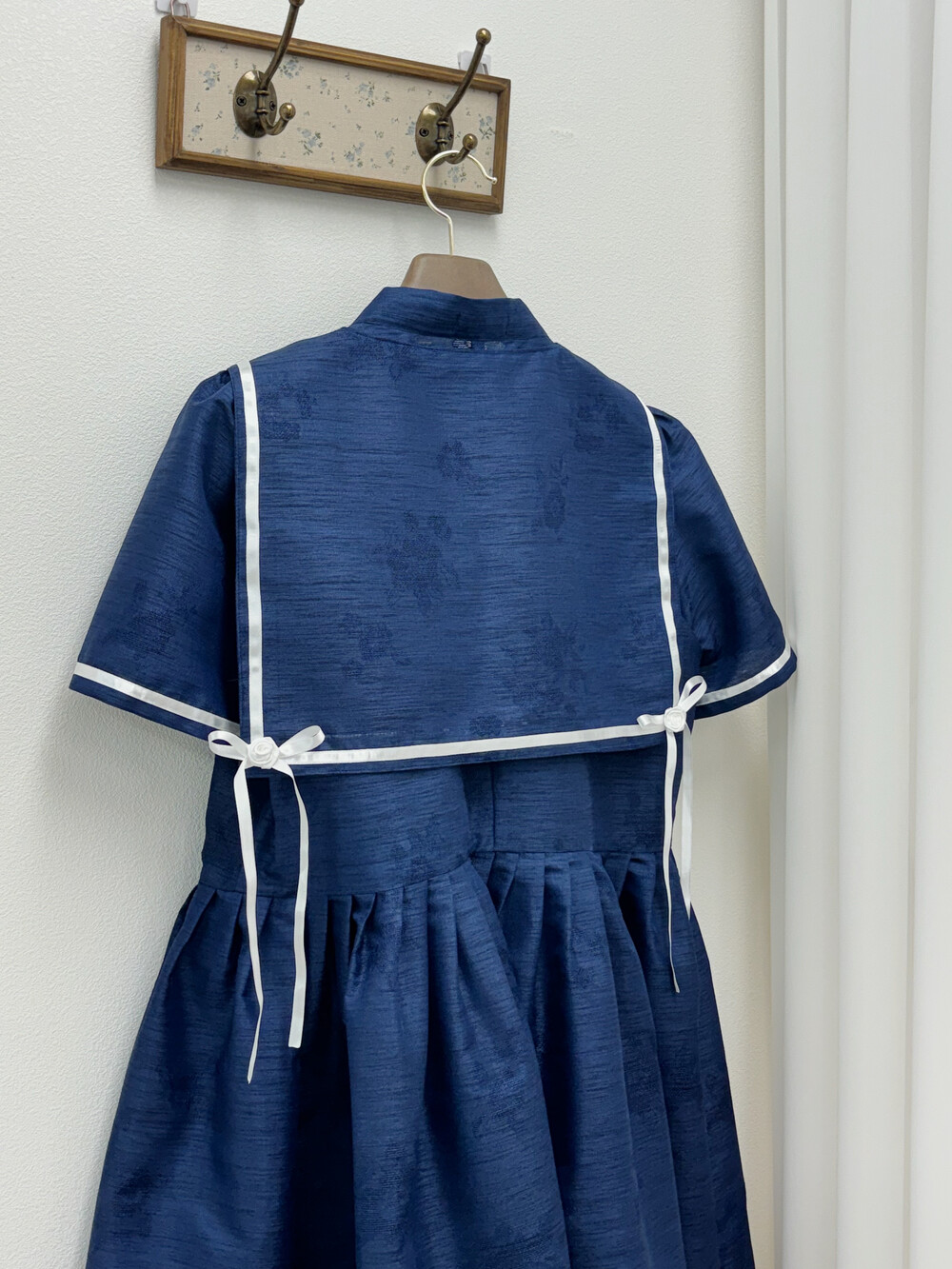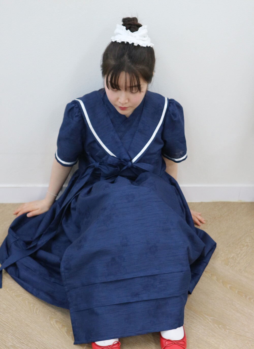 짧게 제작된 소매길이에 광택이 있는 화이트 리본으로 라인을 두르고, 주름을 작게 잡아 치마를 연결하였습니다.