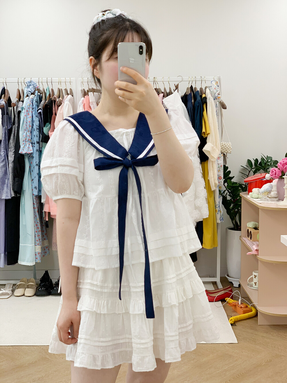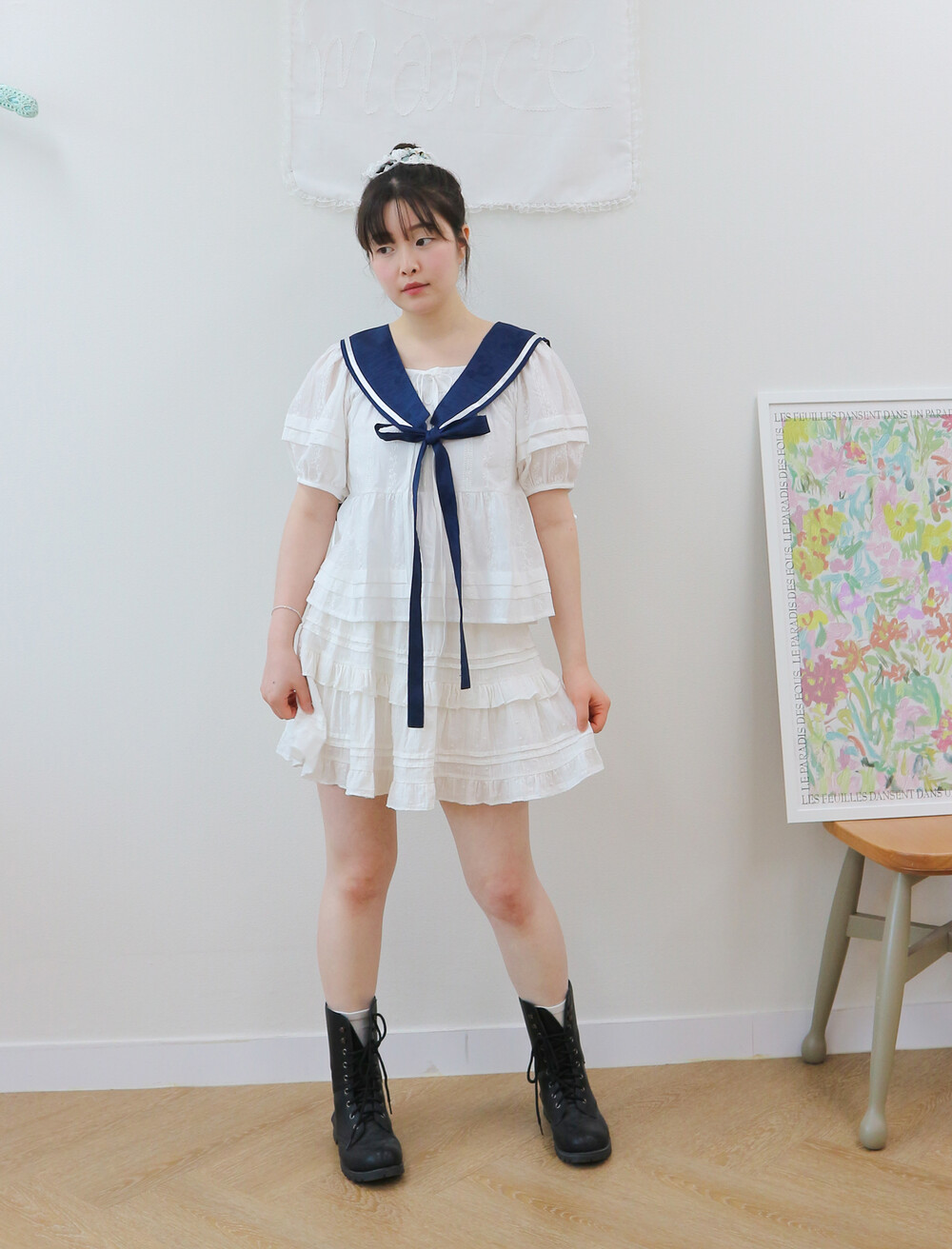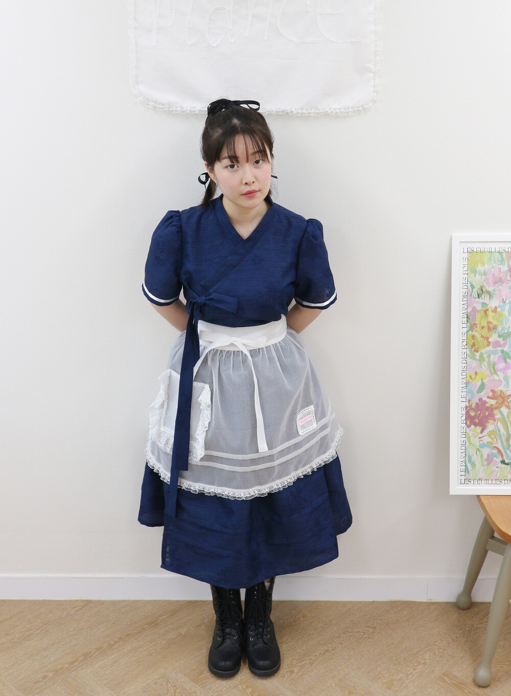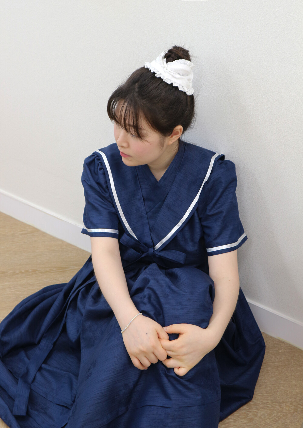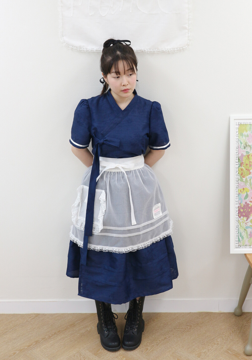 짧게 제작된 소매길이에 광택이 있는 화이트 리본으로 라인을 두르고, 주름을 작게 잡아 치마를 연결하였습니다.