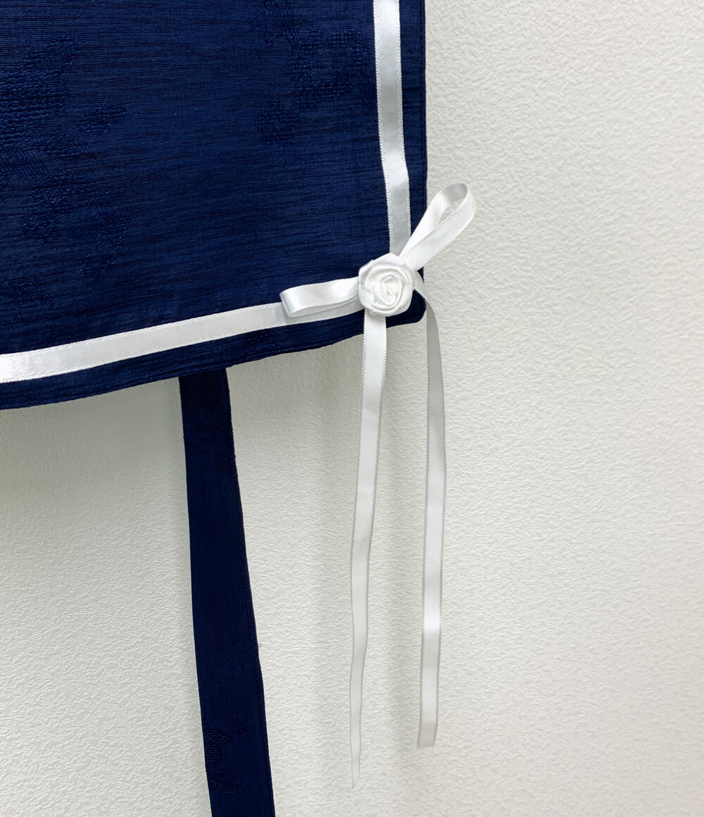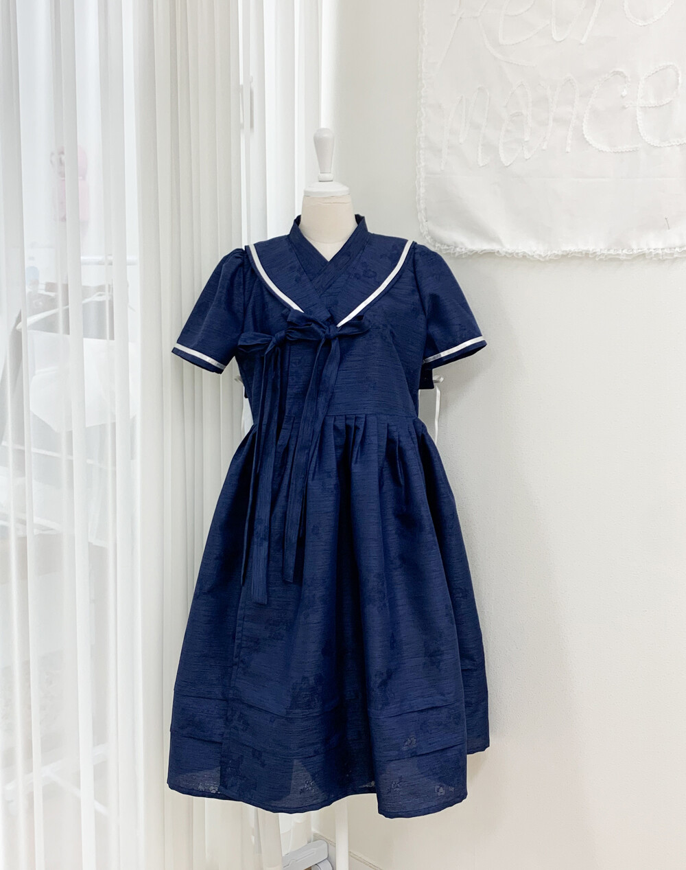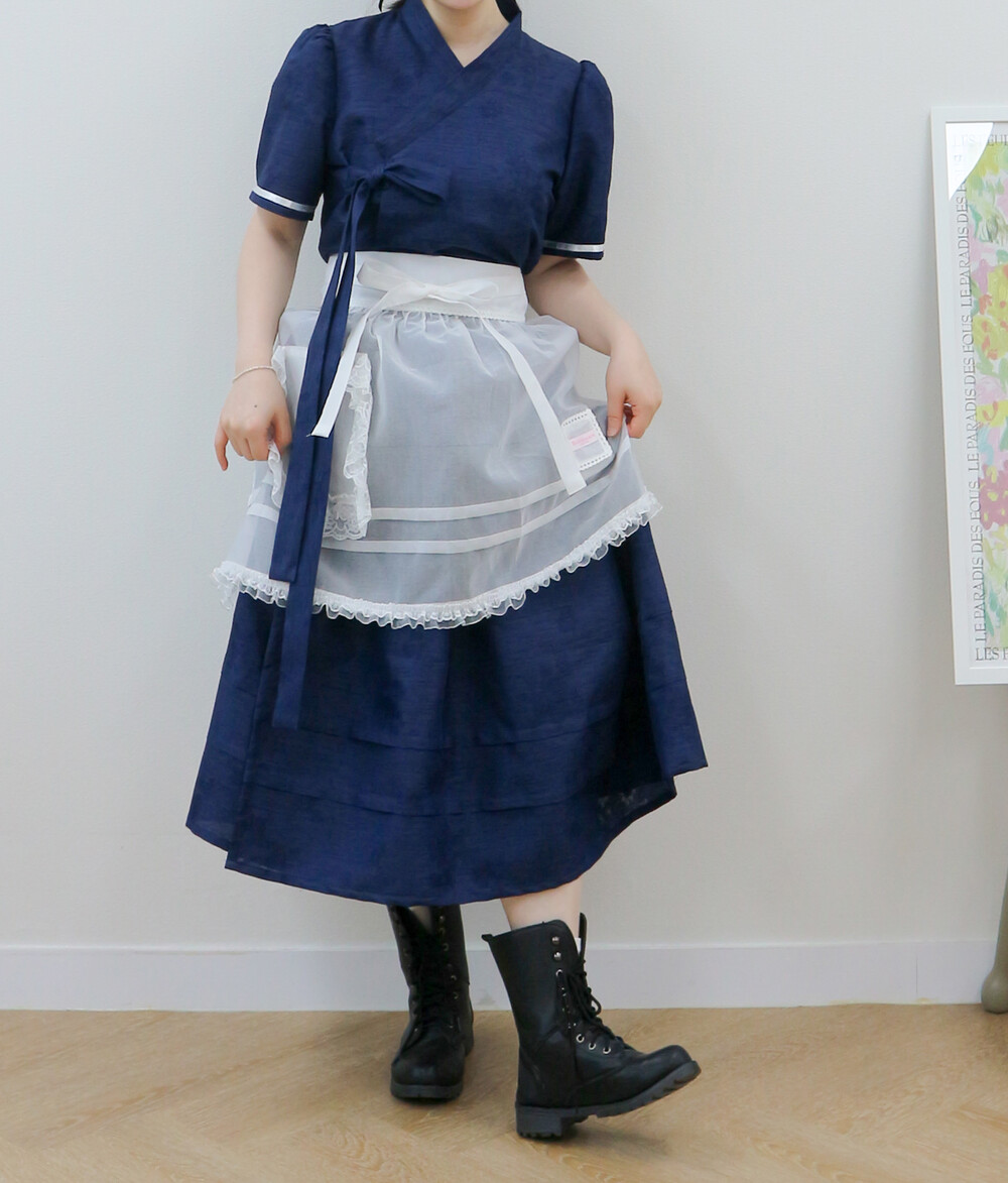 마린 철릭 원피스는 한복 화섬 원단을 사용하여, 크로셰 같이 직조된 꽃패턴이 있으며 여러 실이 믹스되어