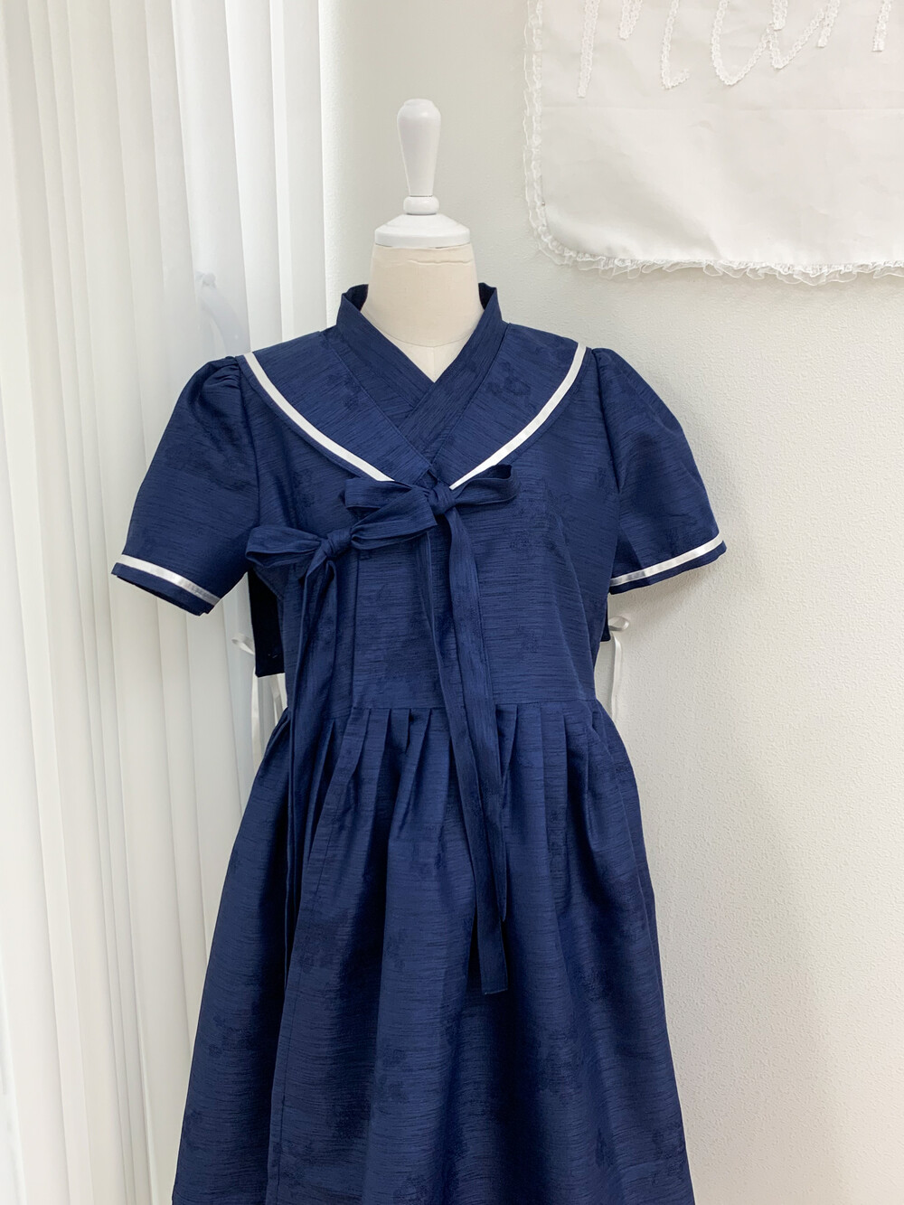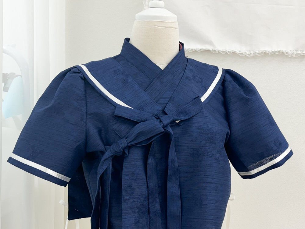 여름하면 떠오르는 시원한 무드의 마린룩을 모티브로 철릭 원피스와 사랑스러운 리본 등걸이 배자입니다.