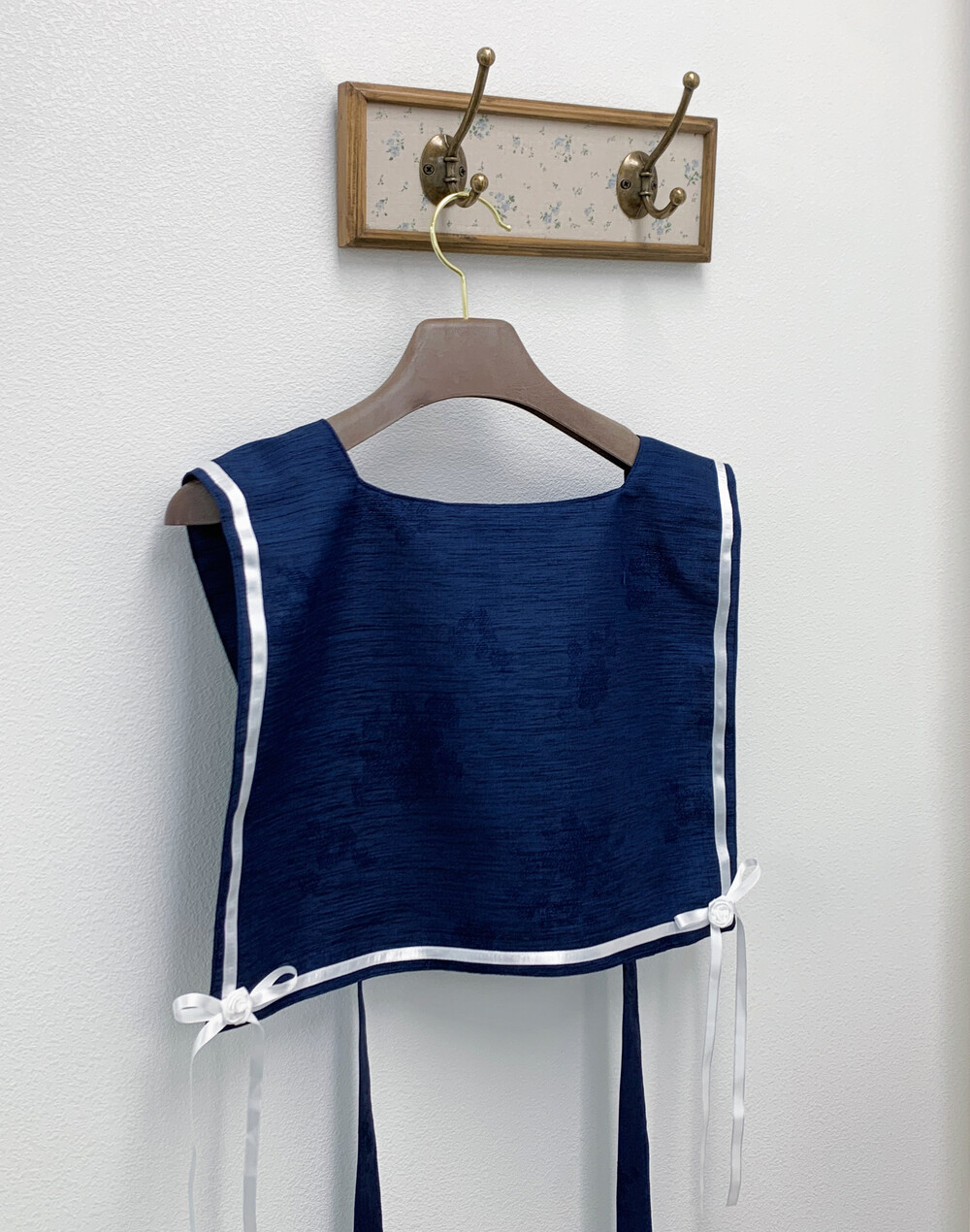 등걸이 배자의 형태로 제작이 되었으며 광택이 있는 화이트 리본으로 라인을 따라서 둘러주었습니다.