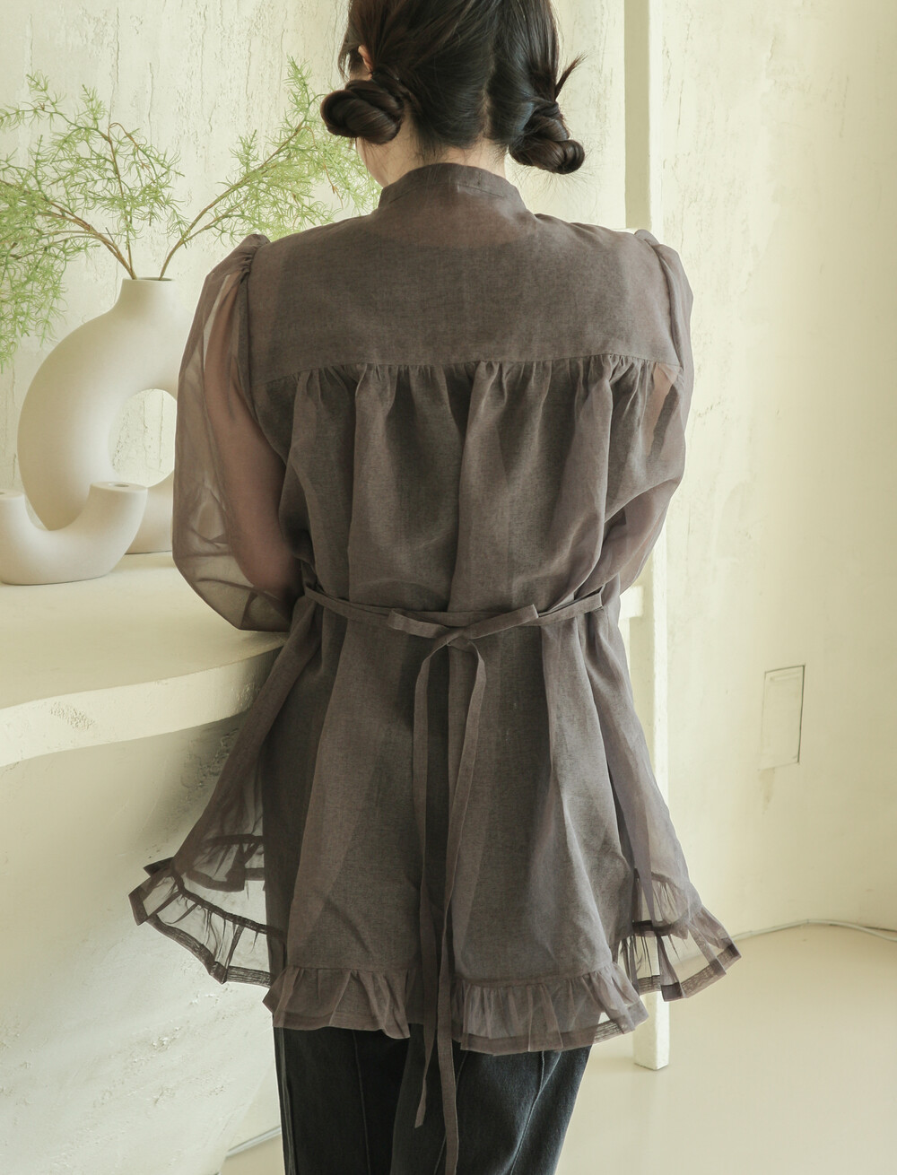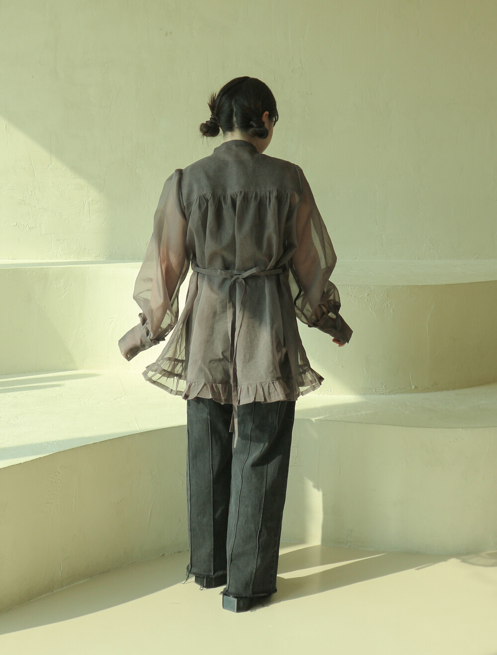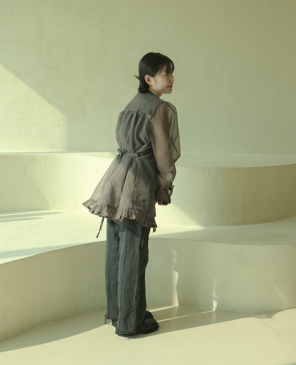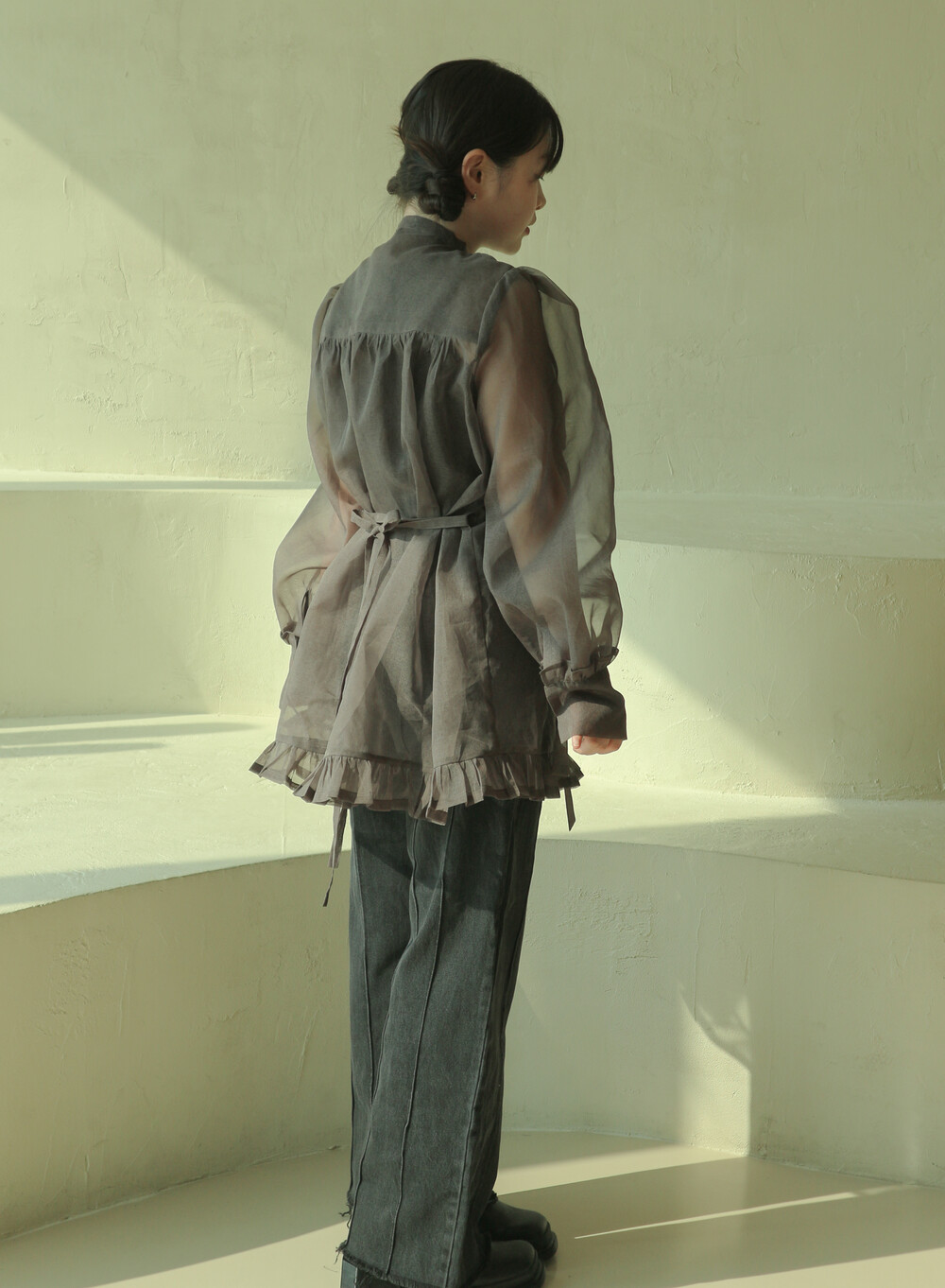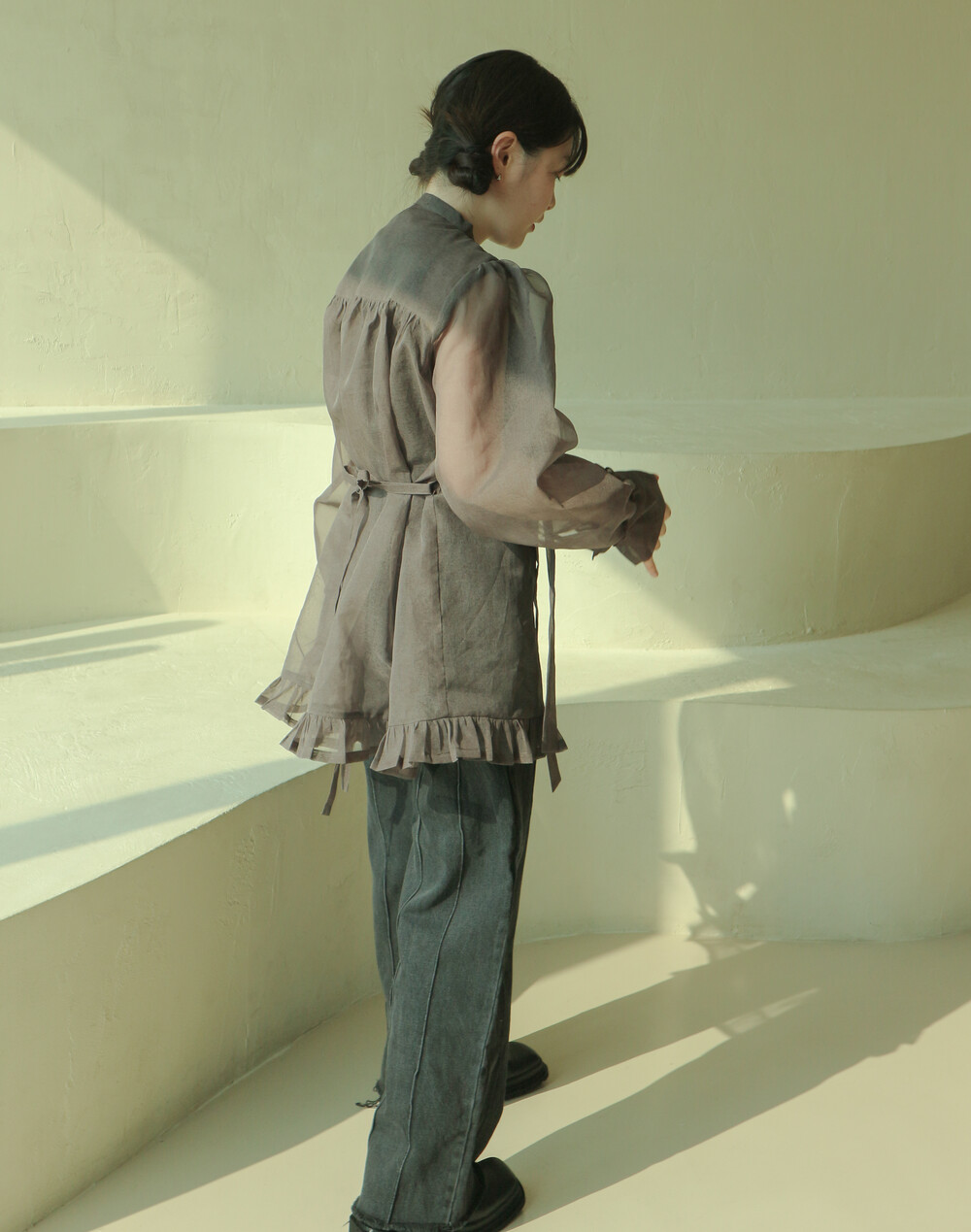 아랫단과 소맷단 커프스 위쪽으로 프릴을 잡아 장식하여 포인트를 주었습니다.
