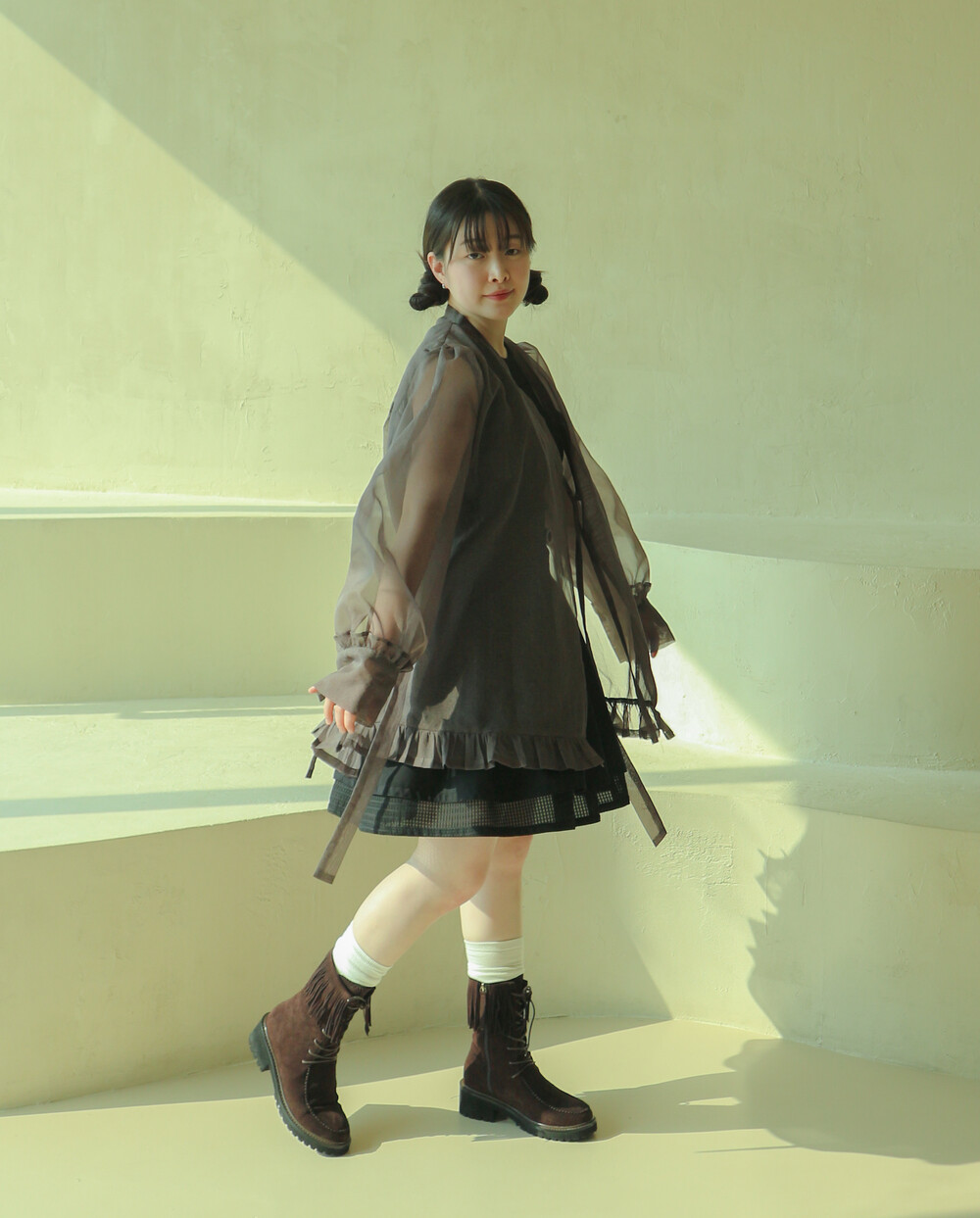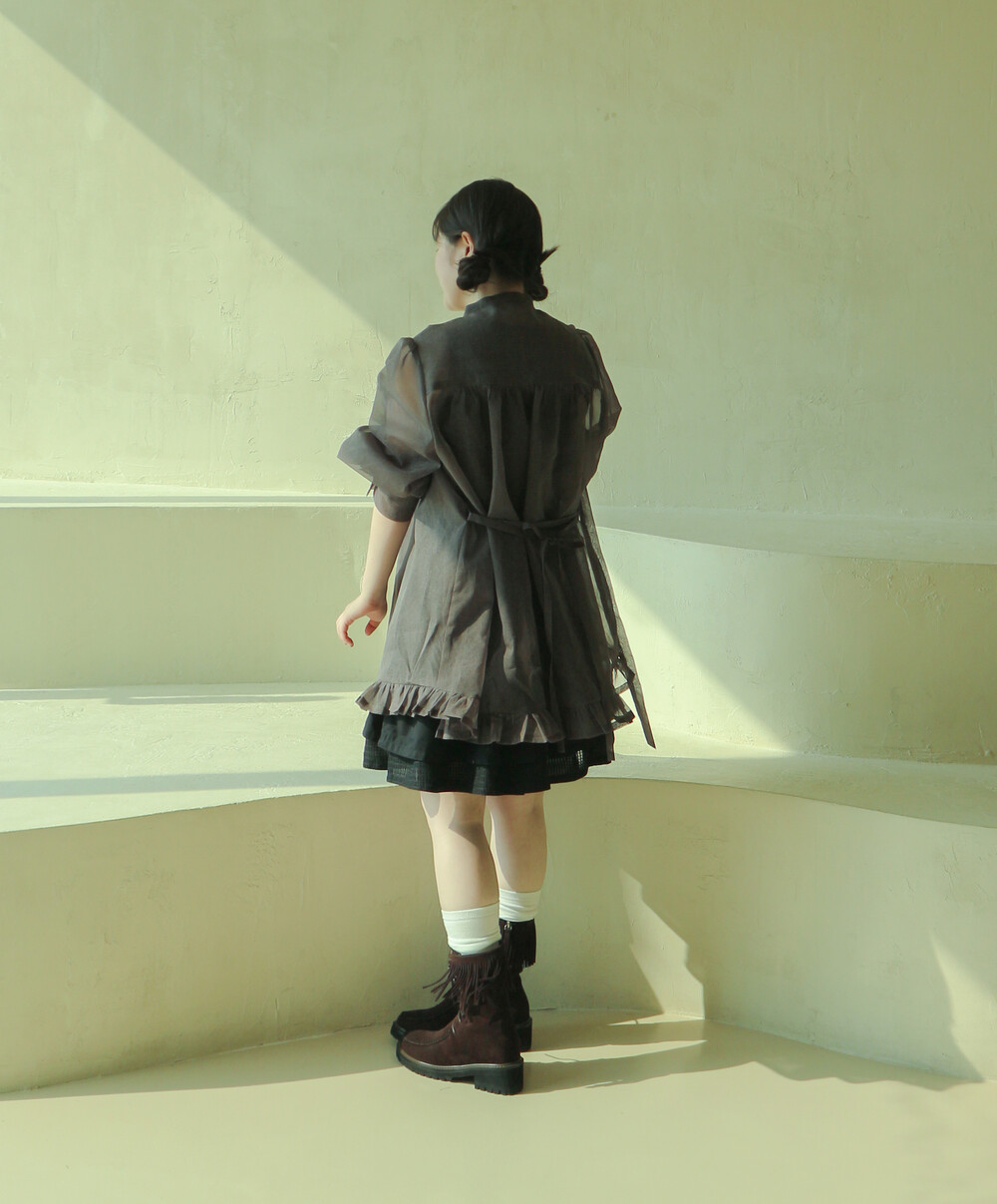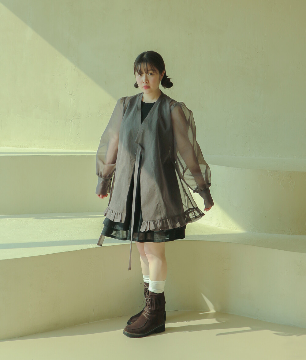 독특한 질감의 격자 무늬 안감으로 밑단을 길게 나오게 하여 포인트를 주었습니다.