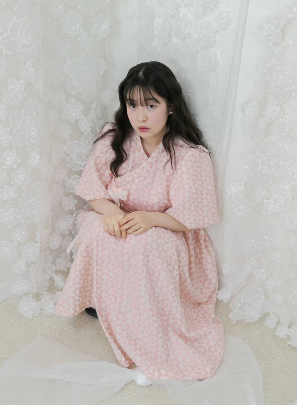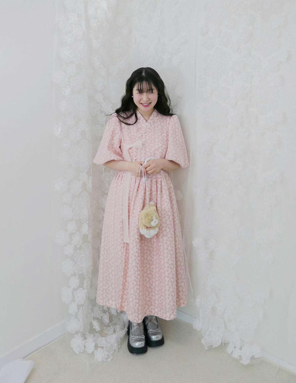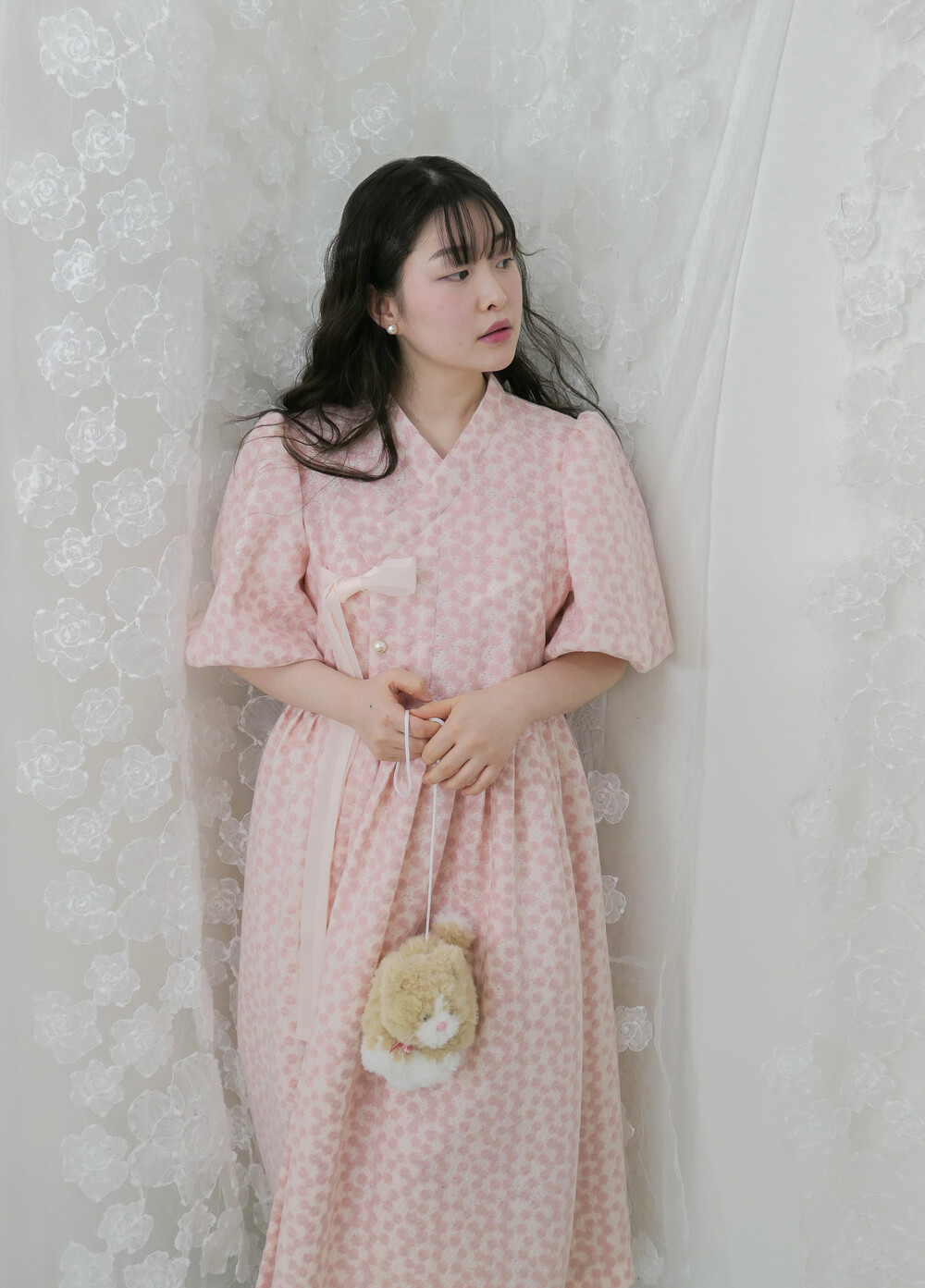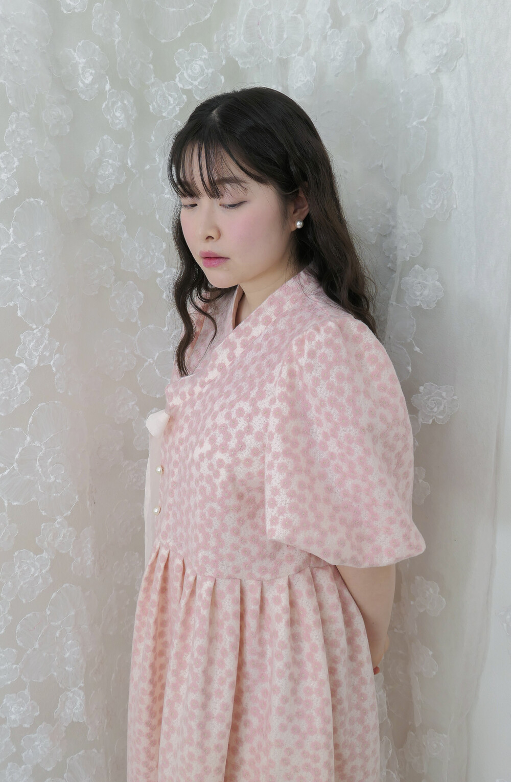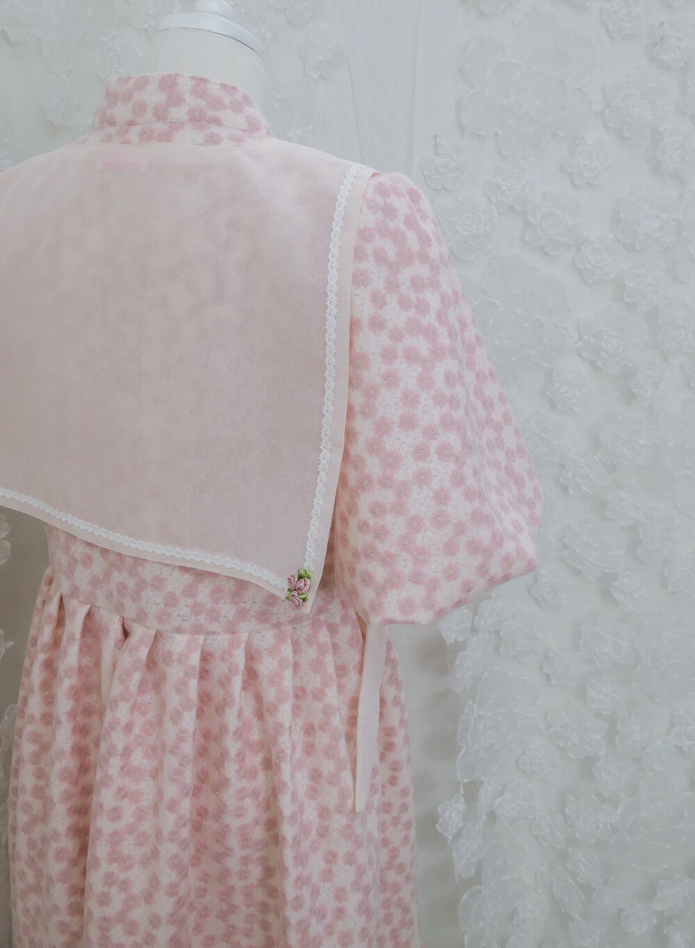 눈꽃 핑크 철릭원피스의 도톰한 소재와 등걸이 배자의 얇은소재가 믹스되어