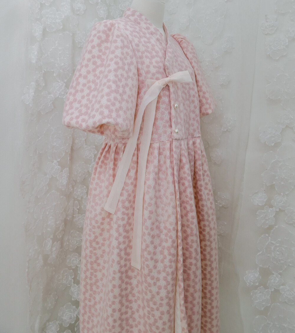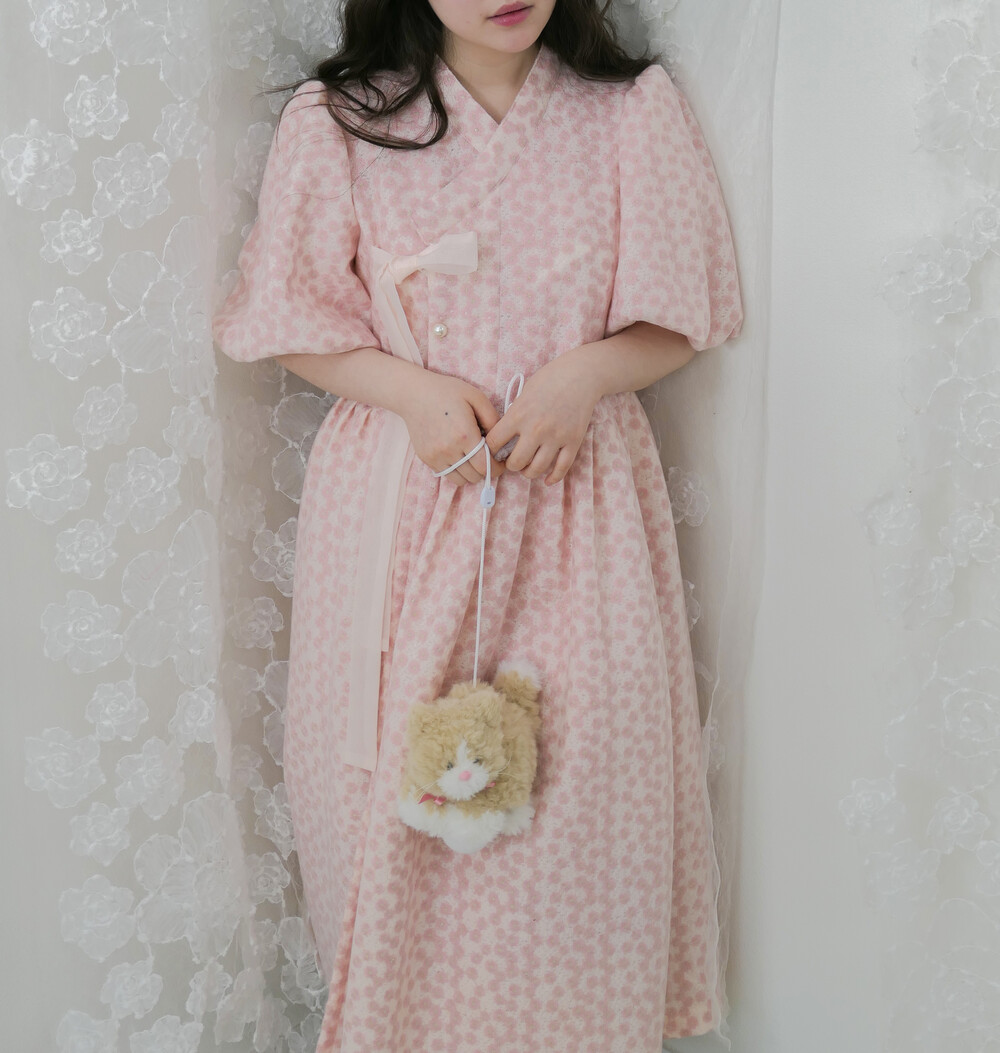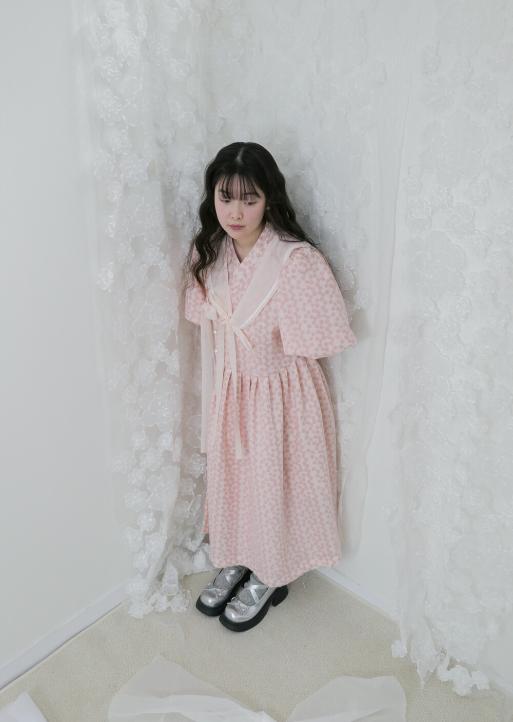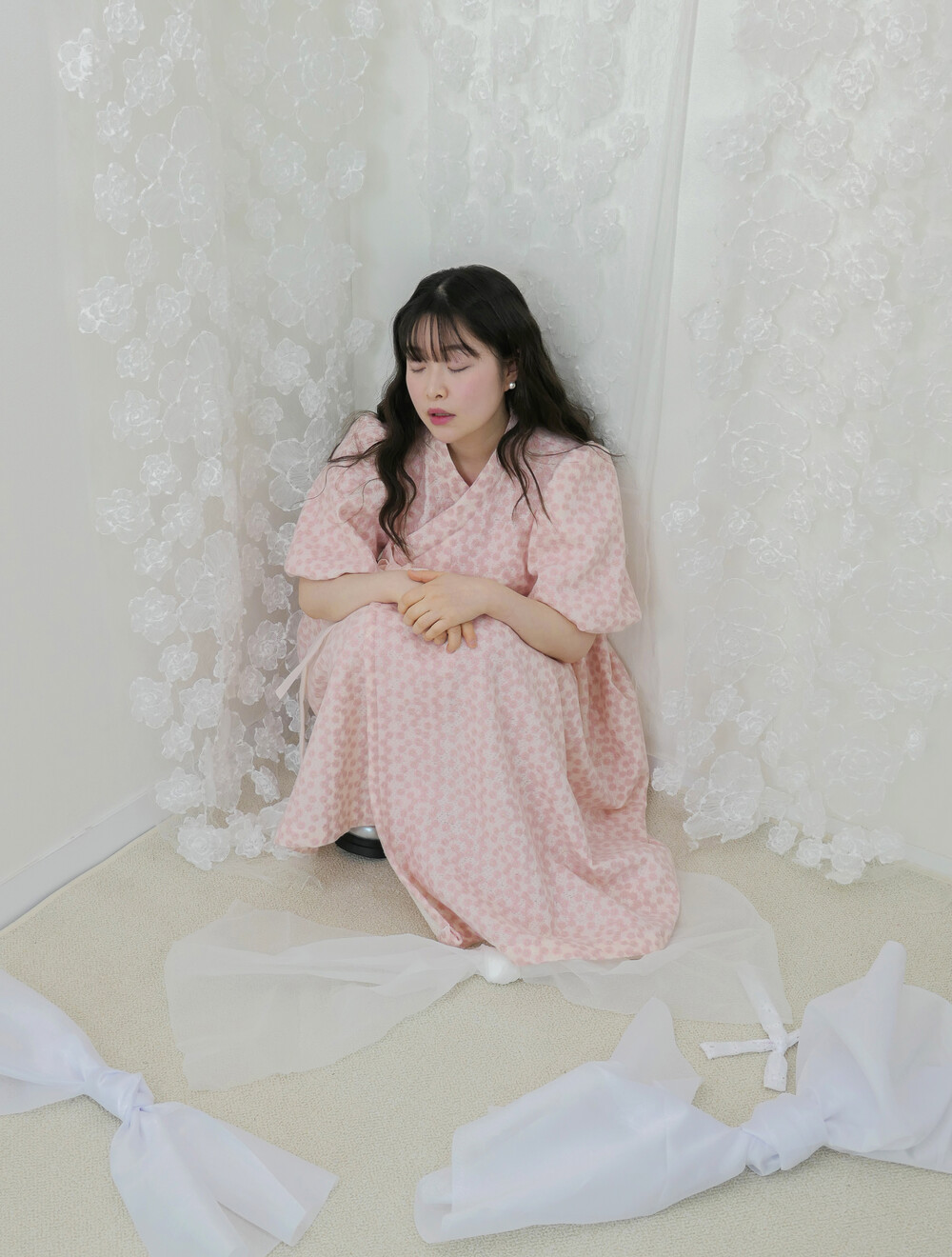 눈꽃 핑크 철릭원피스의 도톰한 소재와 등걸이 배자의 얇은소재가 믹스되어