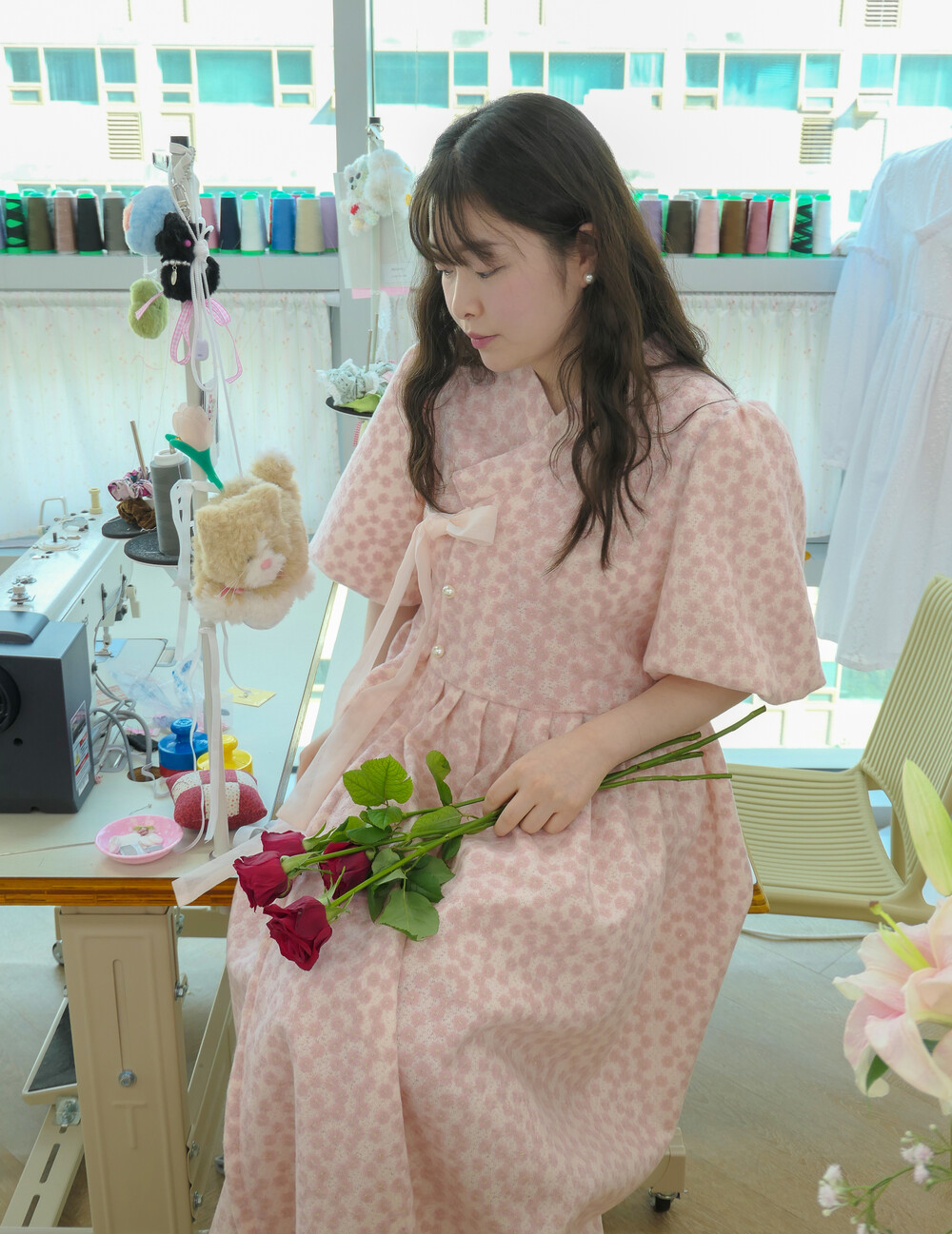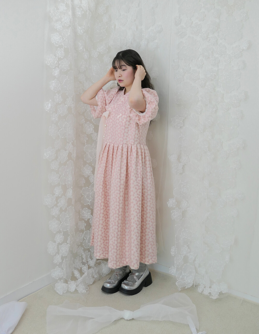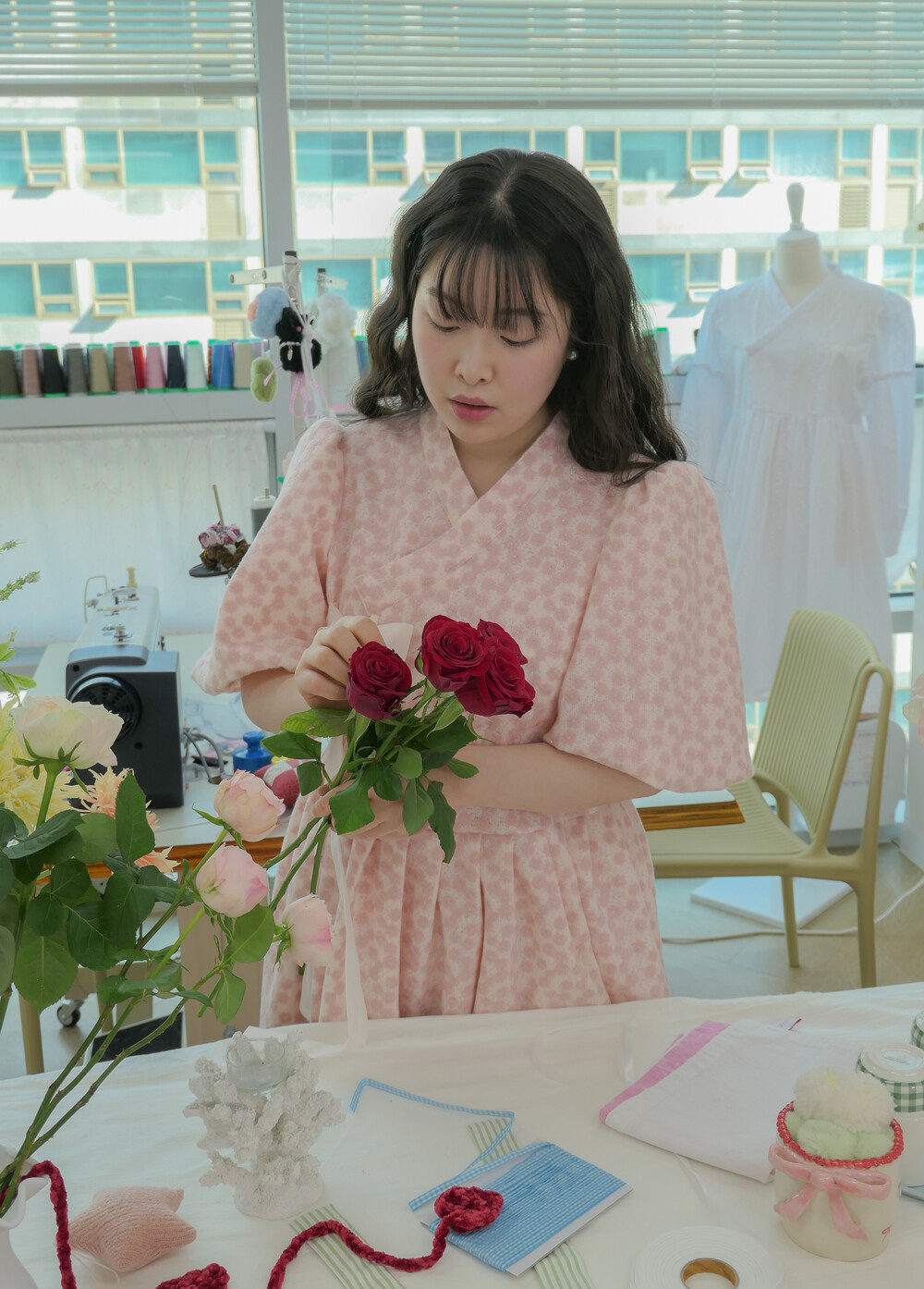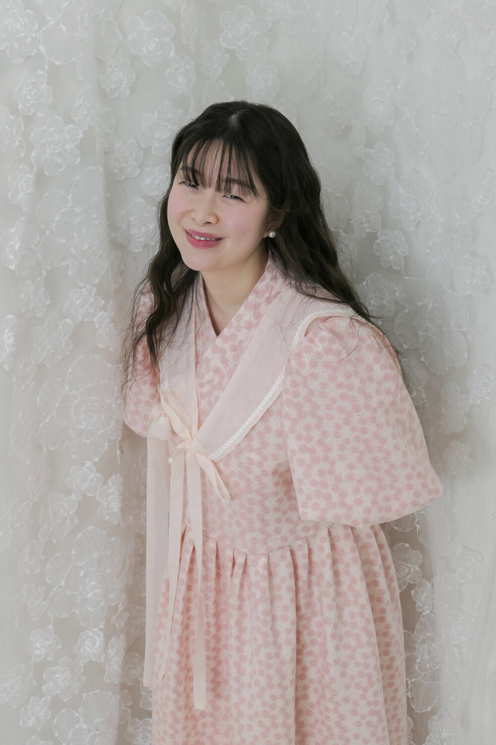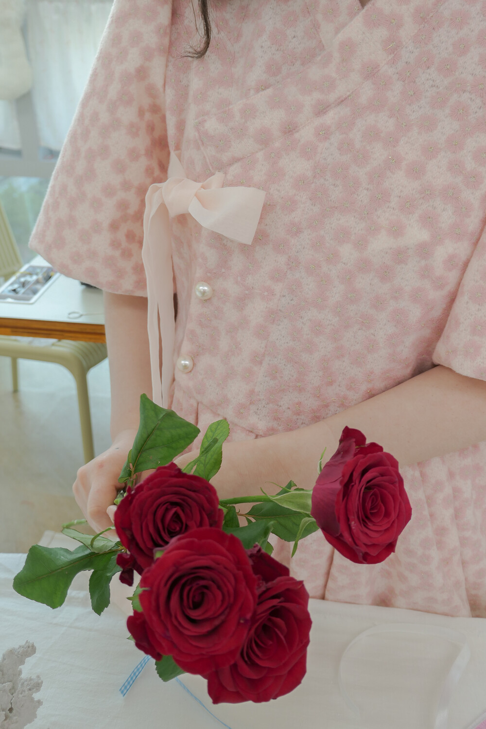 눈꽃 핑크 철릭원피스의 도톰한 소재와 등걸이 배자의 얇은소재가 믹스되어