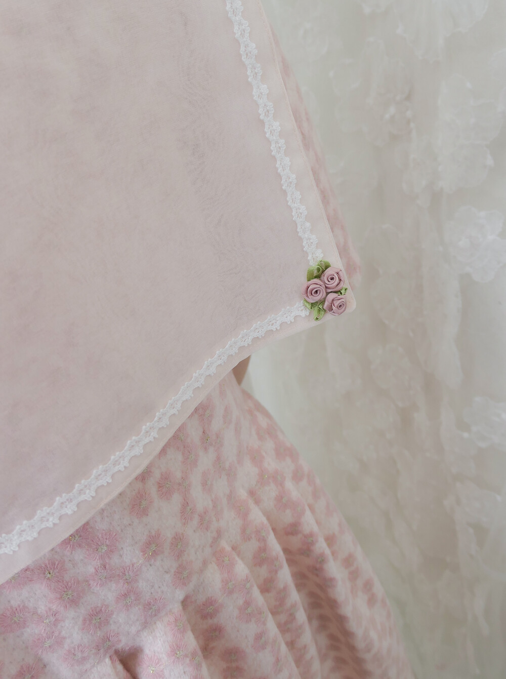 등걸이 배자는 연한 피치 핑크색 노방으로 제작이 되었으며, 형태를 따라 작은 레이스로