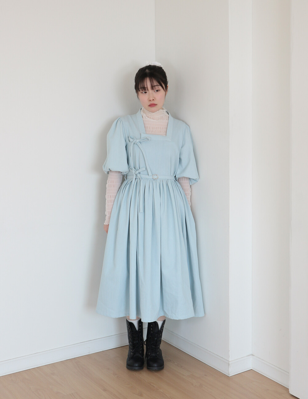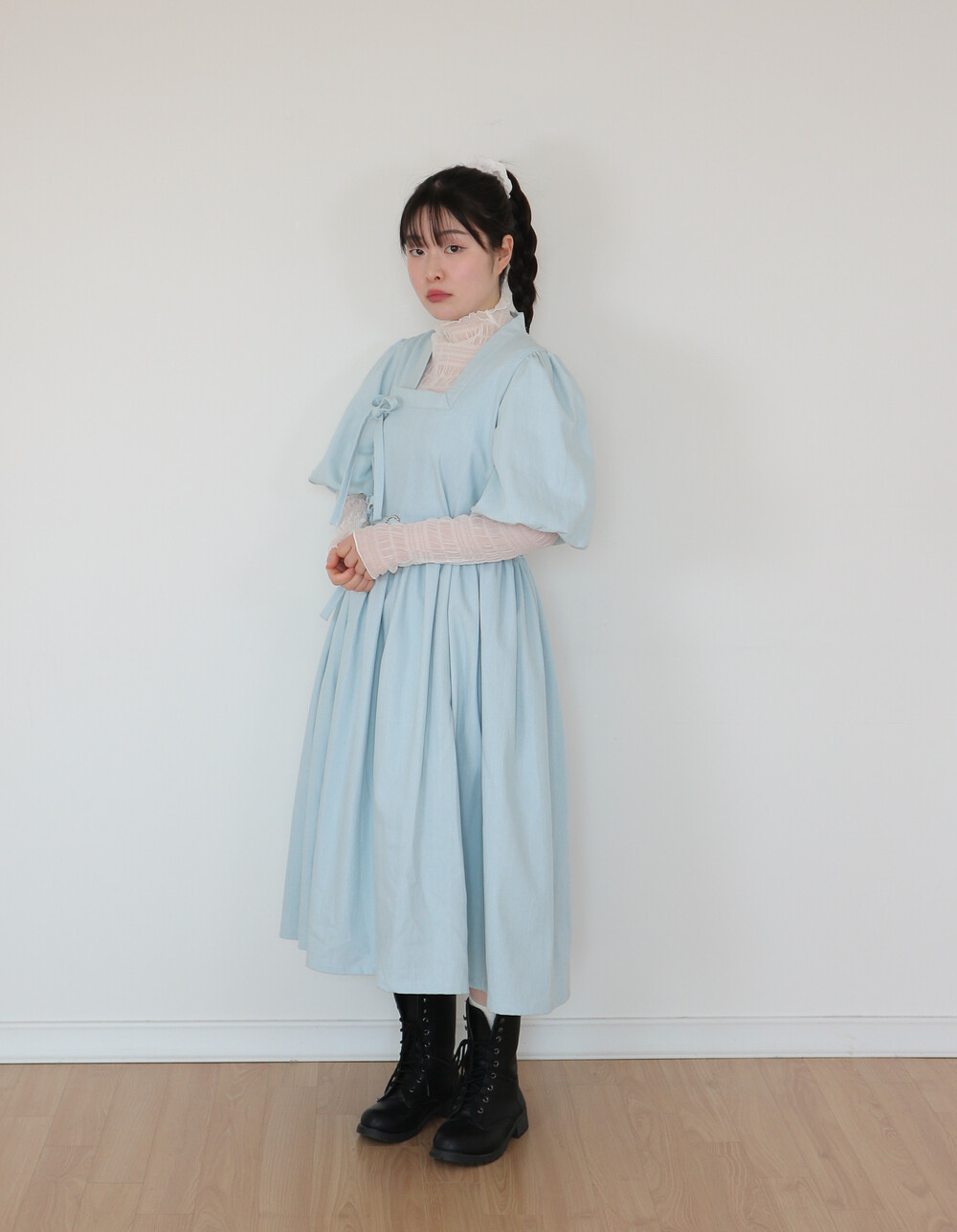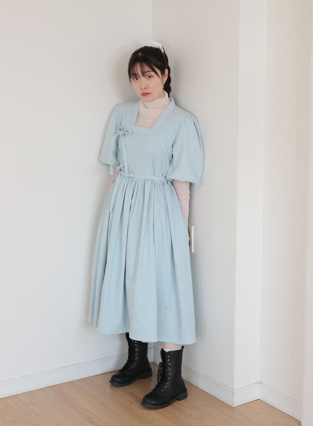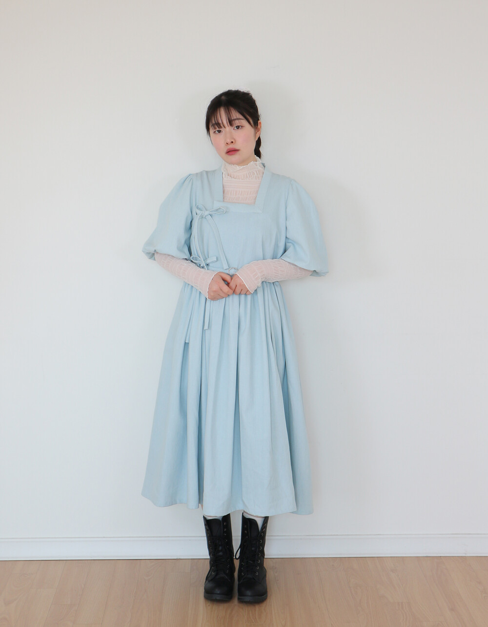 봄에 입기 좋은 연청 원피스는 기존의 청 원단보다 가벼운 소재로 제작되어 클래식하면서도 데일리하게 입을 수 있는 한복 원피스입니다.