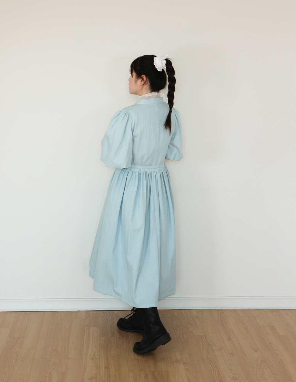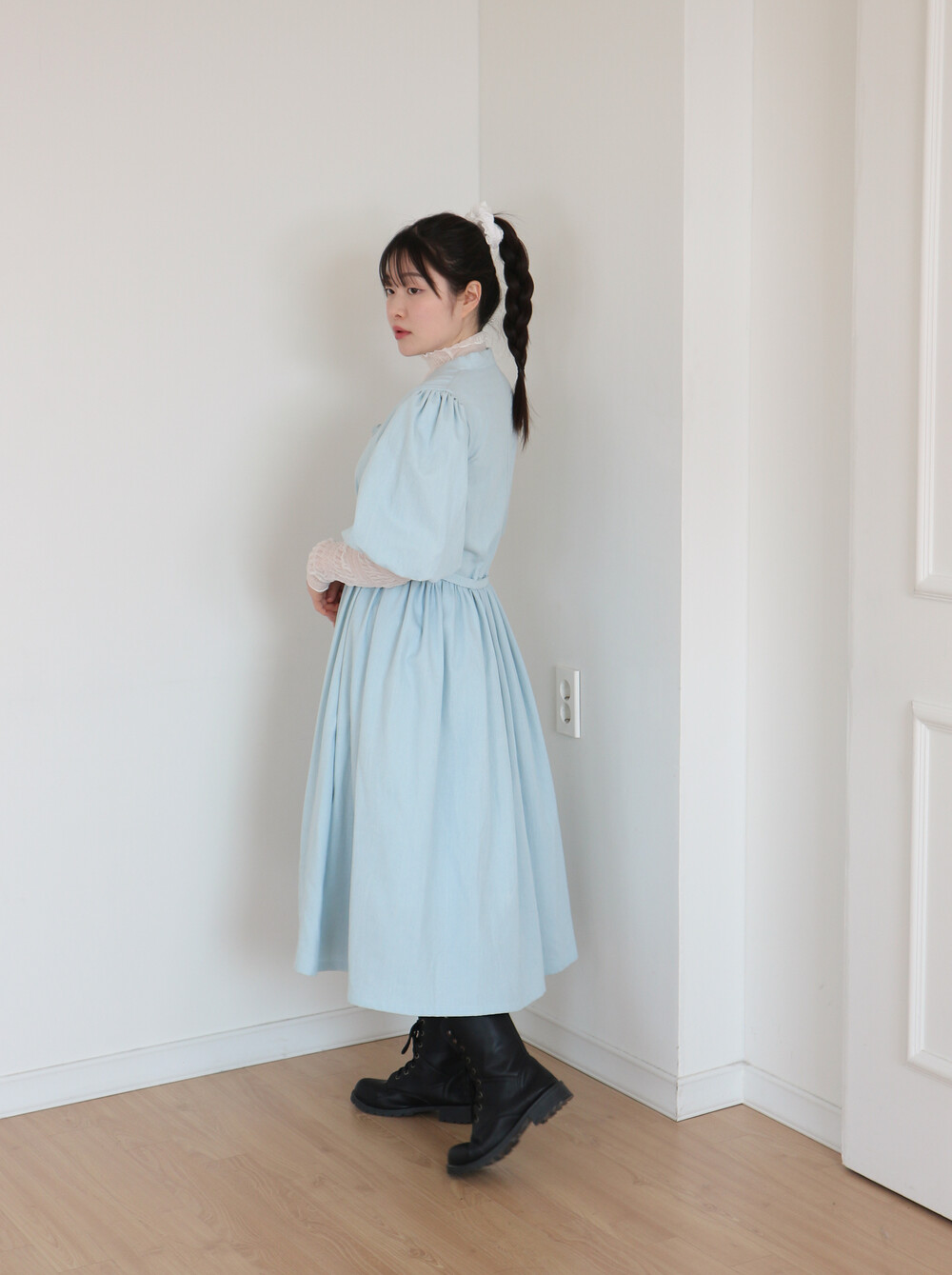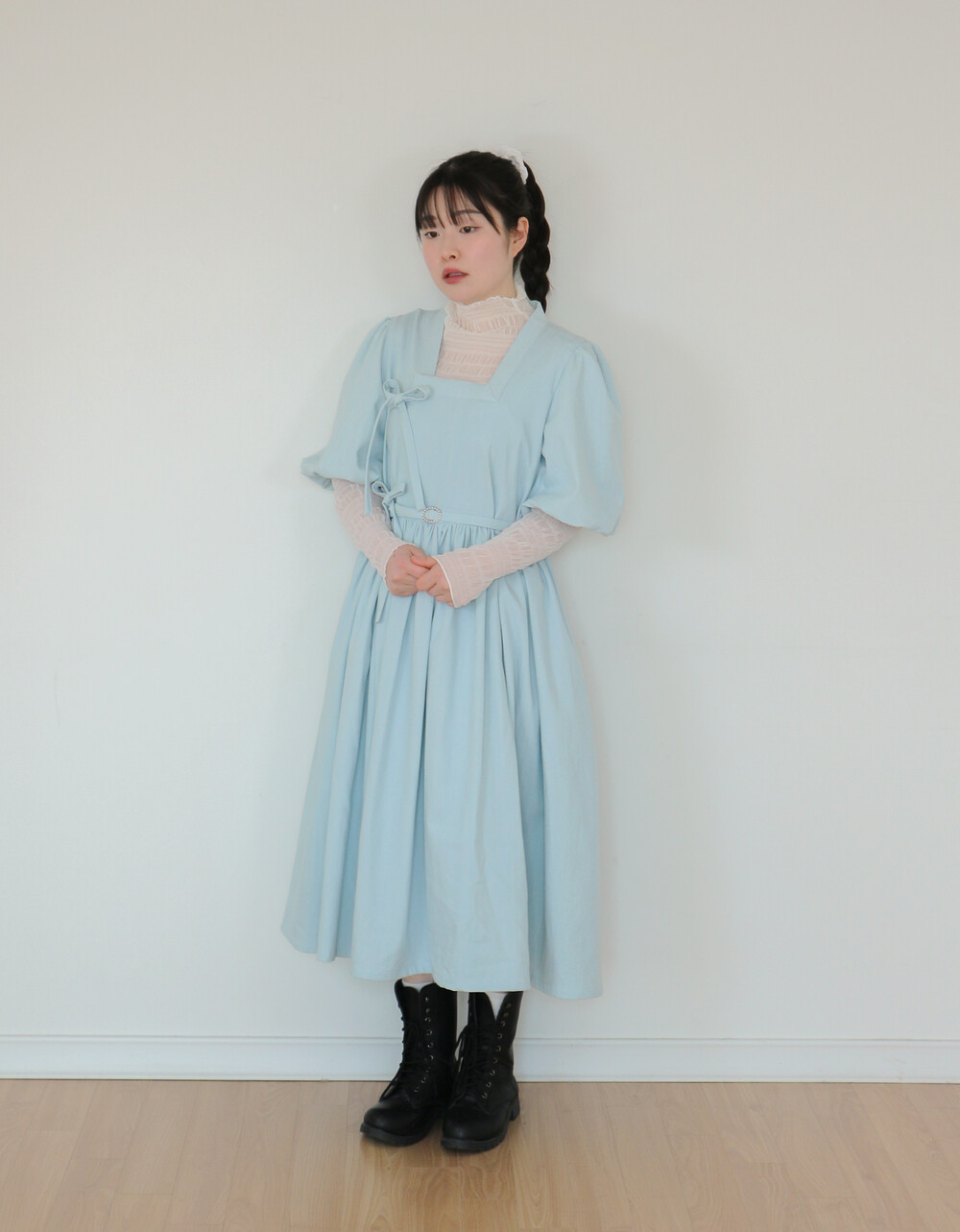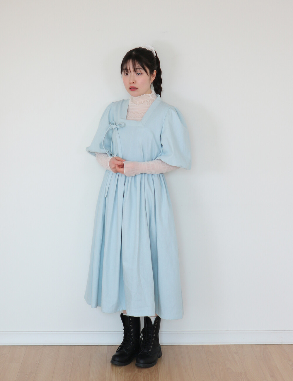 봄에 입기 좋은 연청 원피스는 기존의 청 원단보다 가벼운 소재로 제작되어 클래식하면서도 데일리하게 입을 수 있는 한복 원피스입니다.
