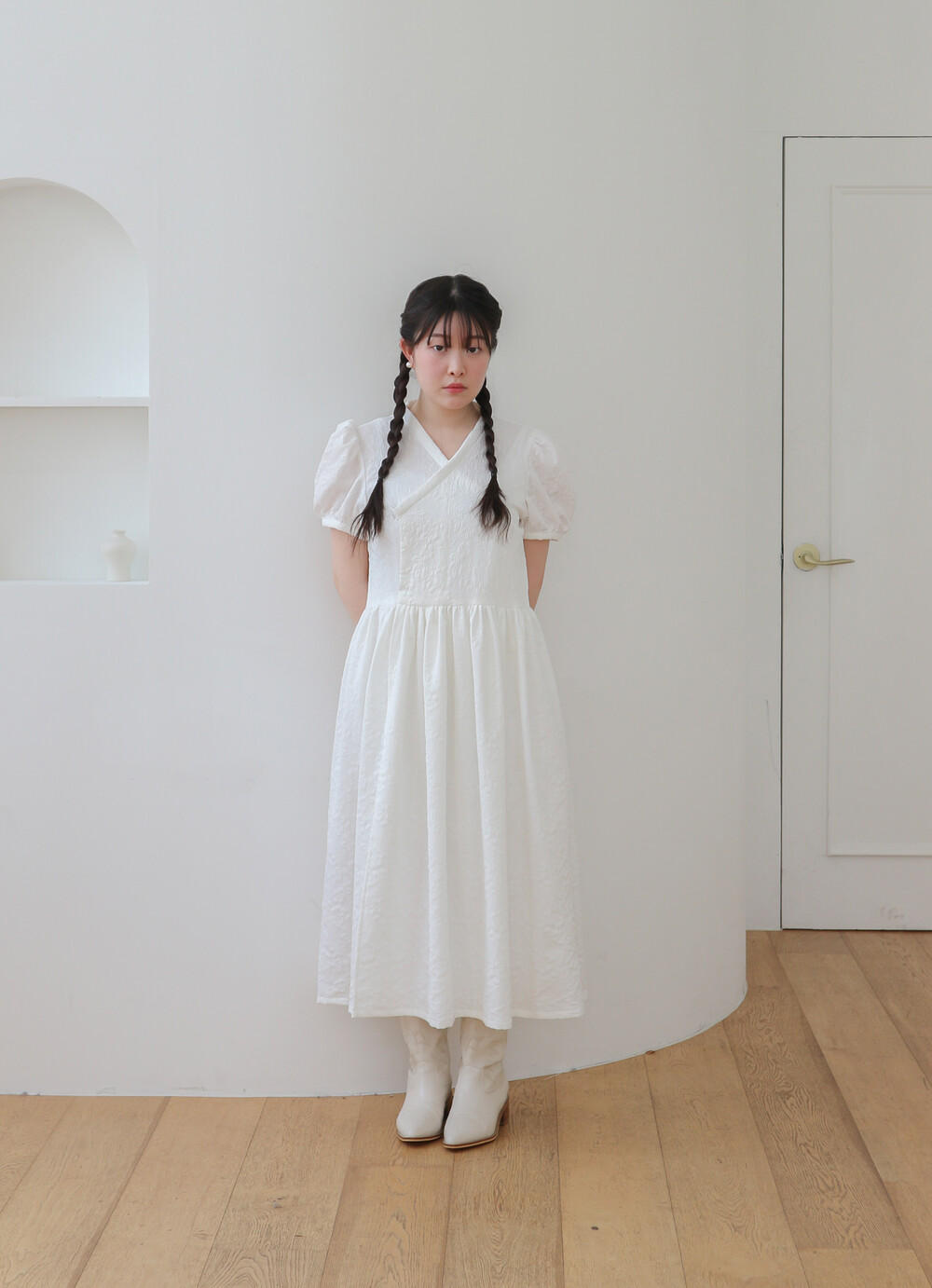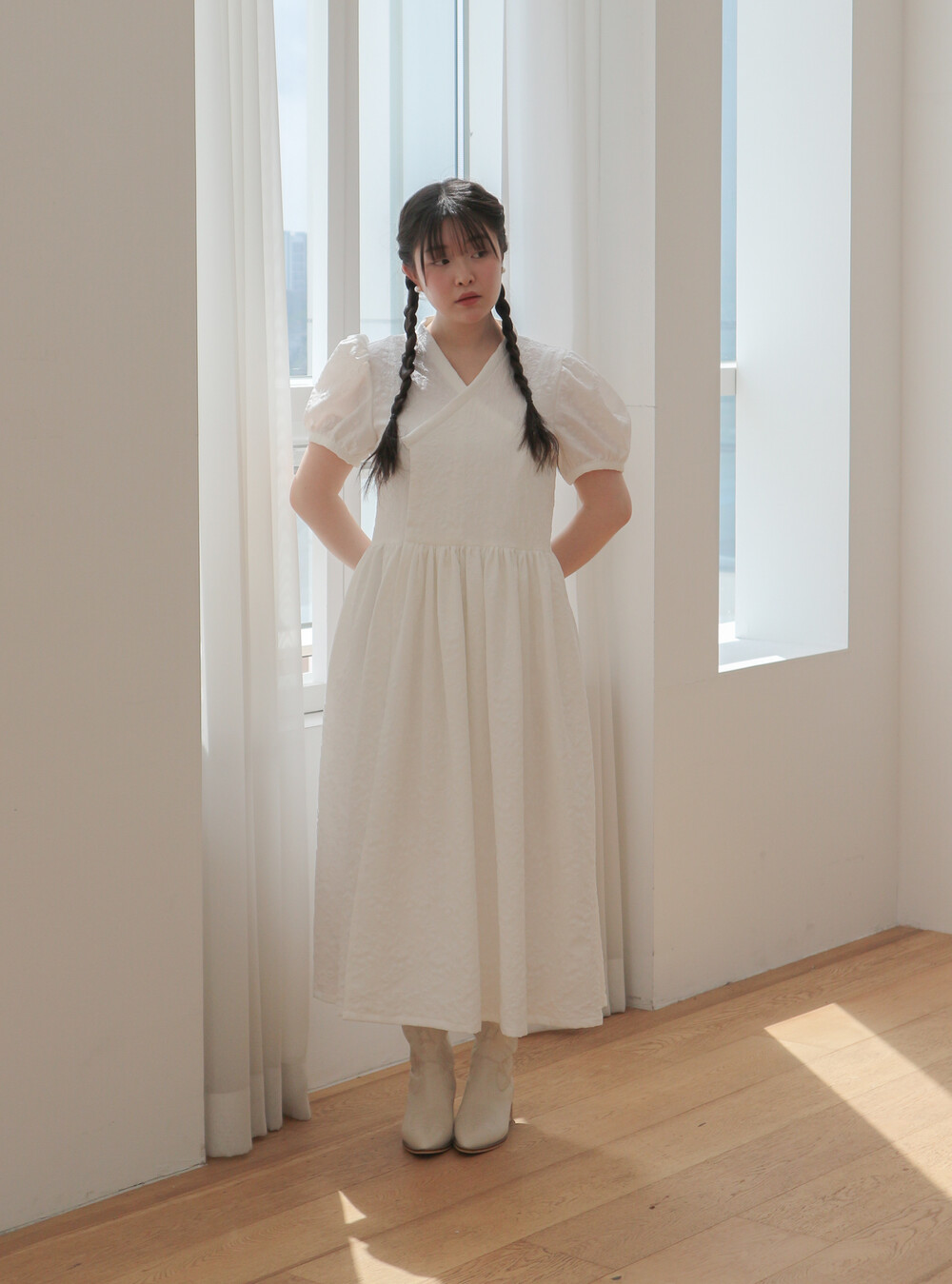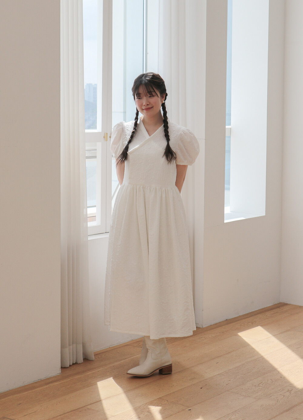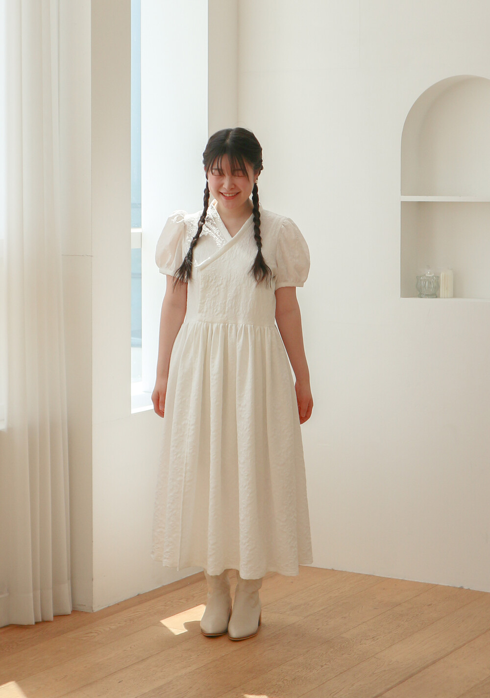 - 긴 기장의 총장에 풍성하고 짧은 퍼프소매로 기본핏으로 제작되었습니다.