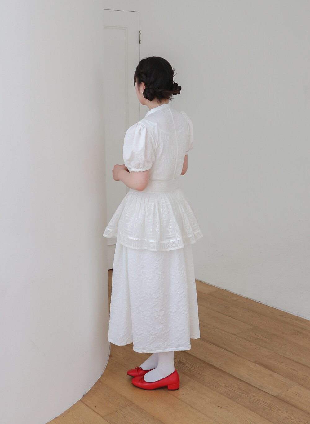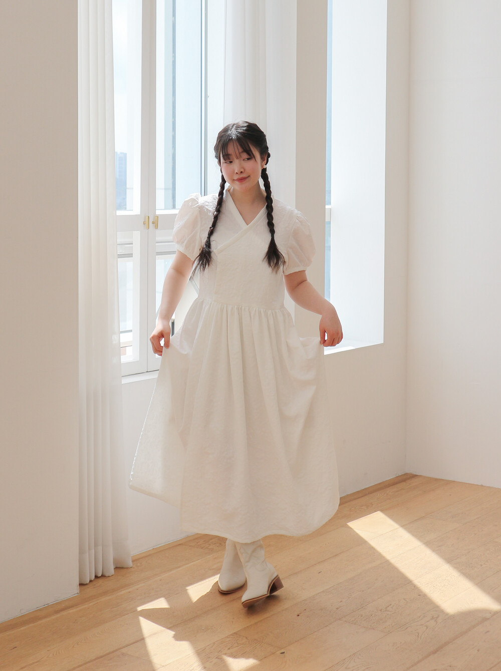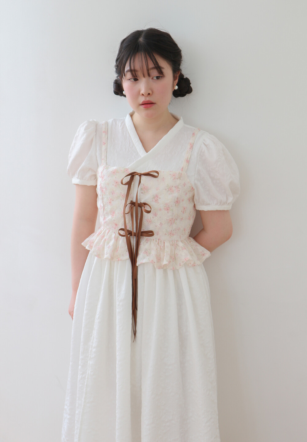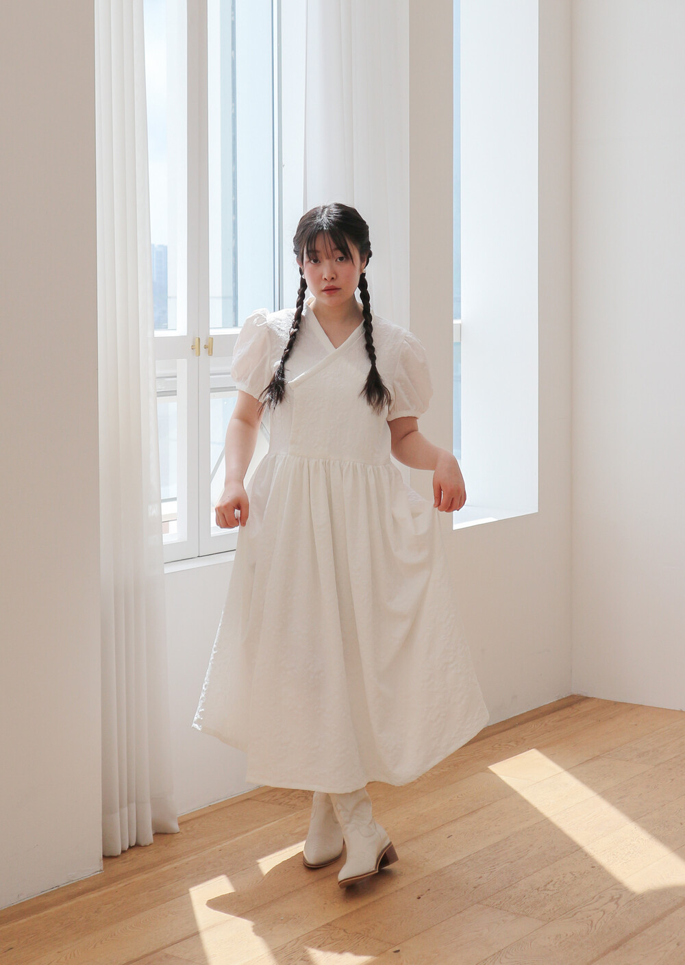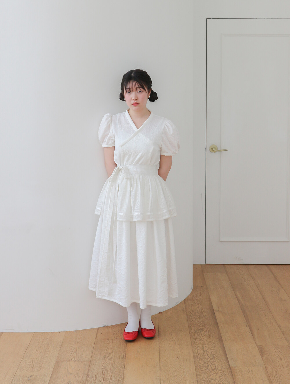 - 긴 기장의 총장에 풍성하고 짧은 퍼프소매로 기본핏으로 제작되었습니다.
