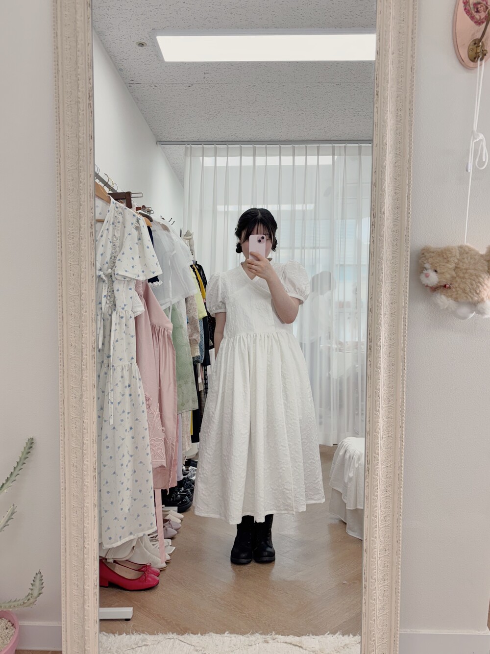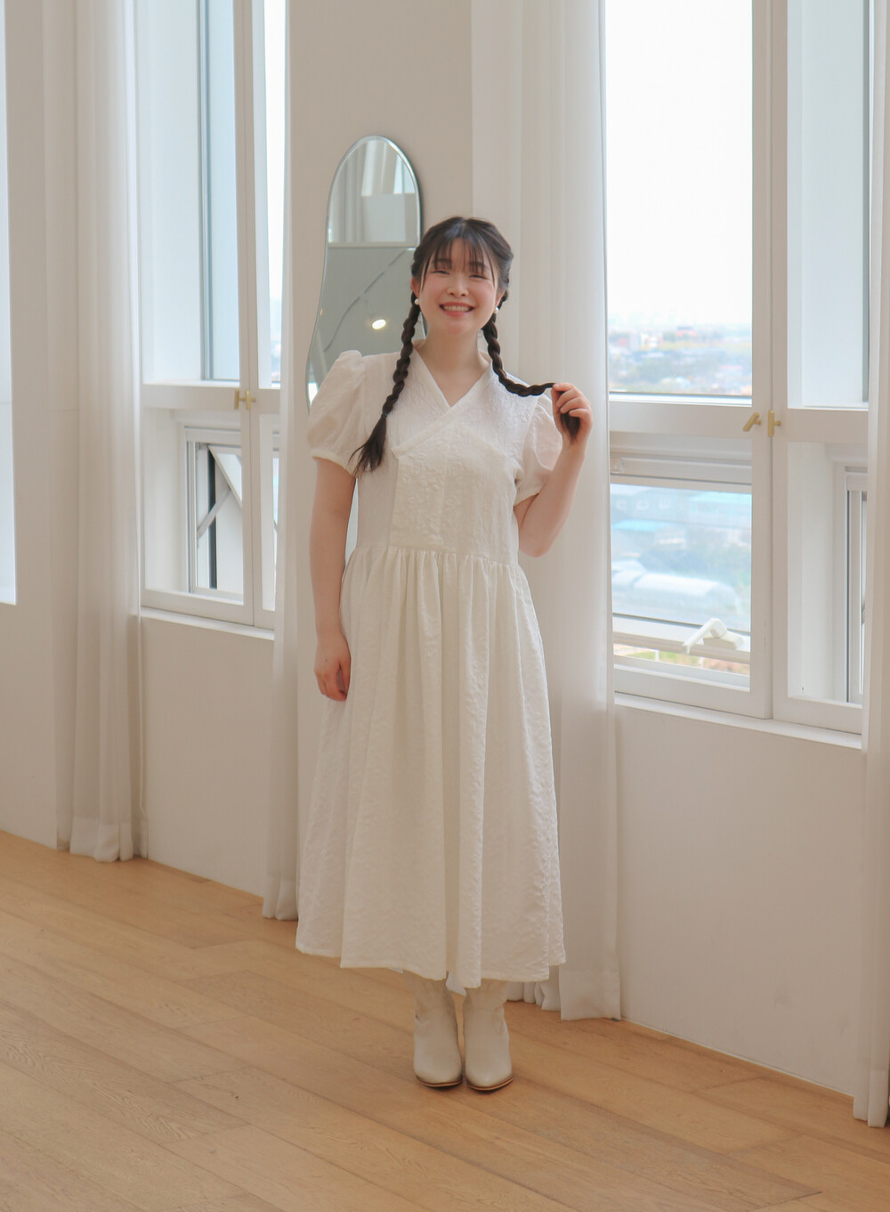 - 얇은 진주 벨트로 포인트를 주었으며, 셀프웨딩 원피스로도 추천합니다.