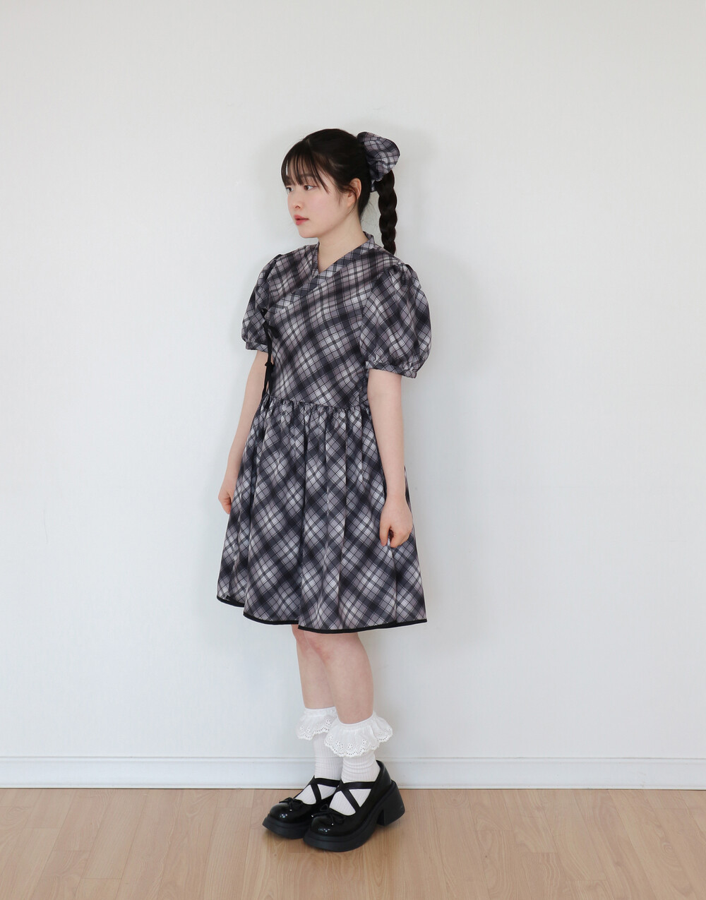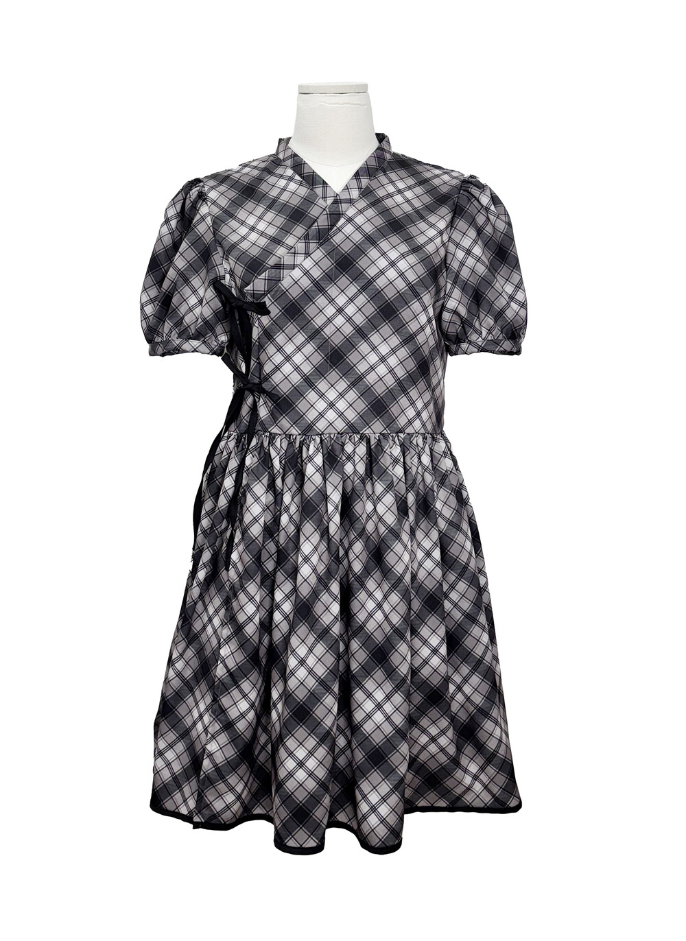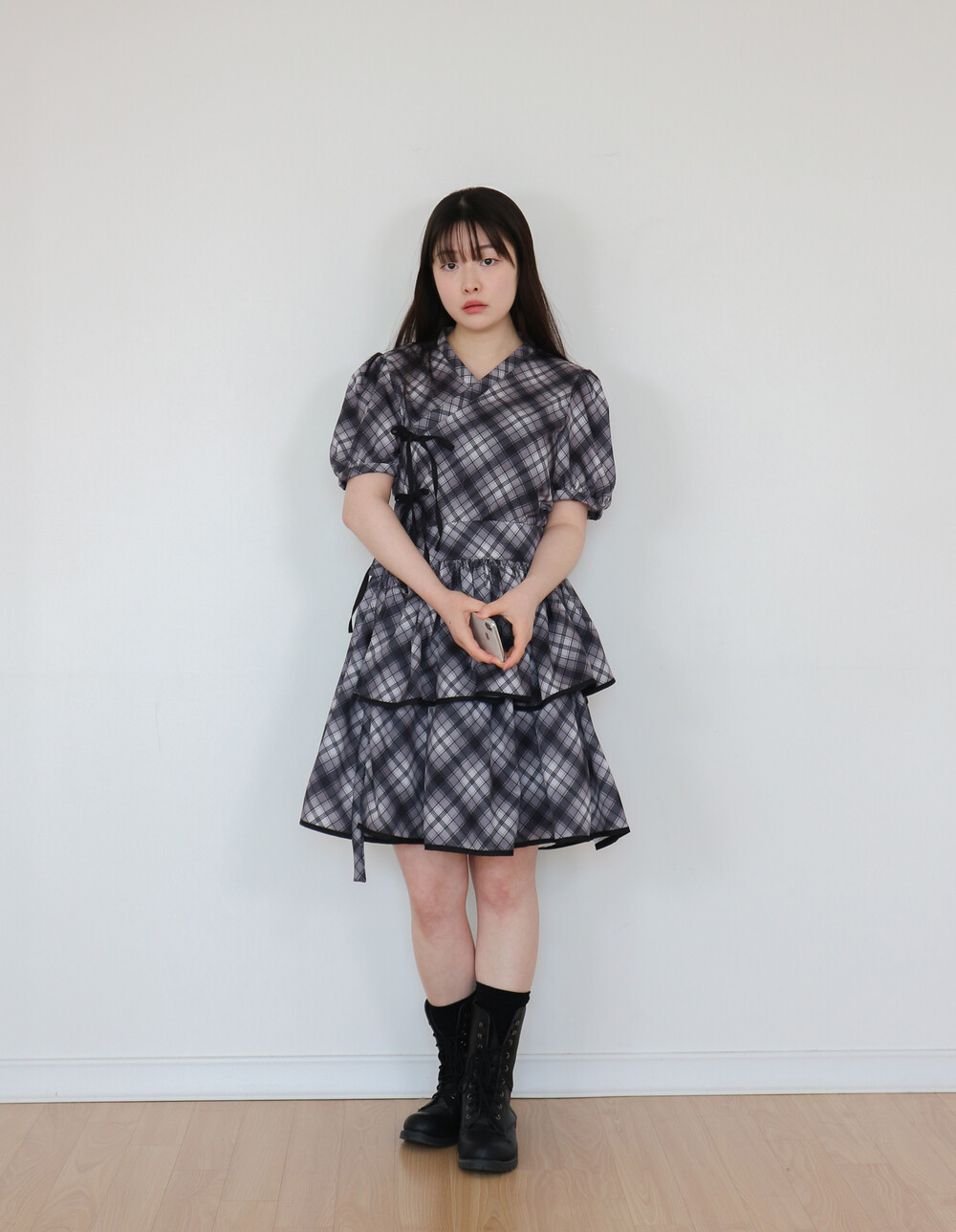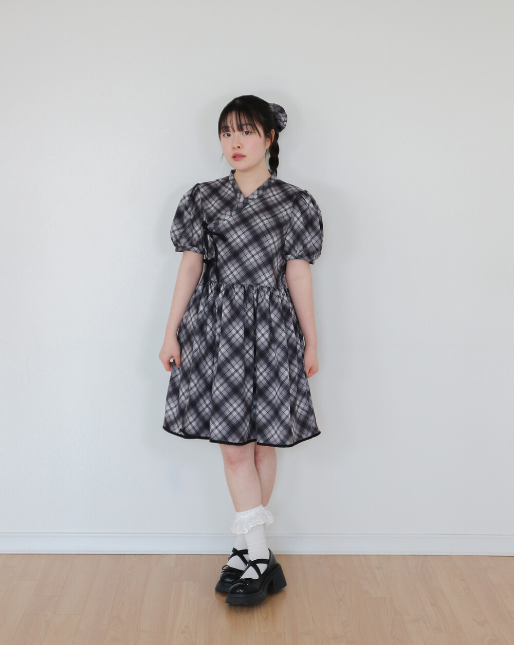 블랙 체크 미니 원피스는 한복의 전통 요소에 프레피룩과 긱시크 감성을 결합한 디자인입니다. 폴리 원단으로 제작되어 찰랑거리는 느낌과 가벼운 착용감을 제공하며,