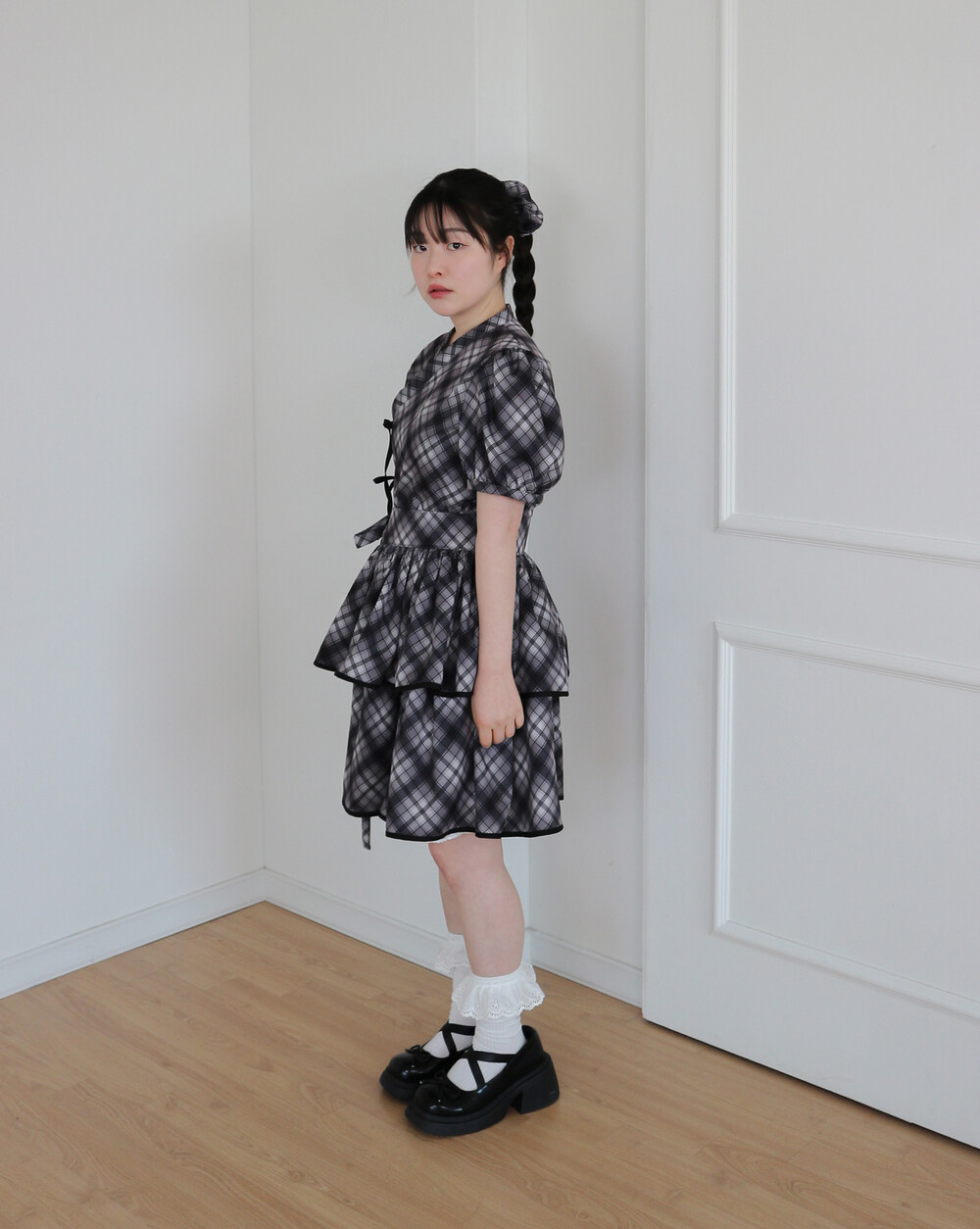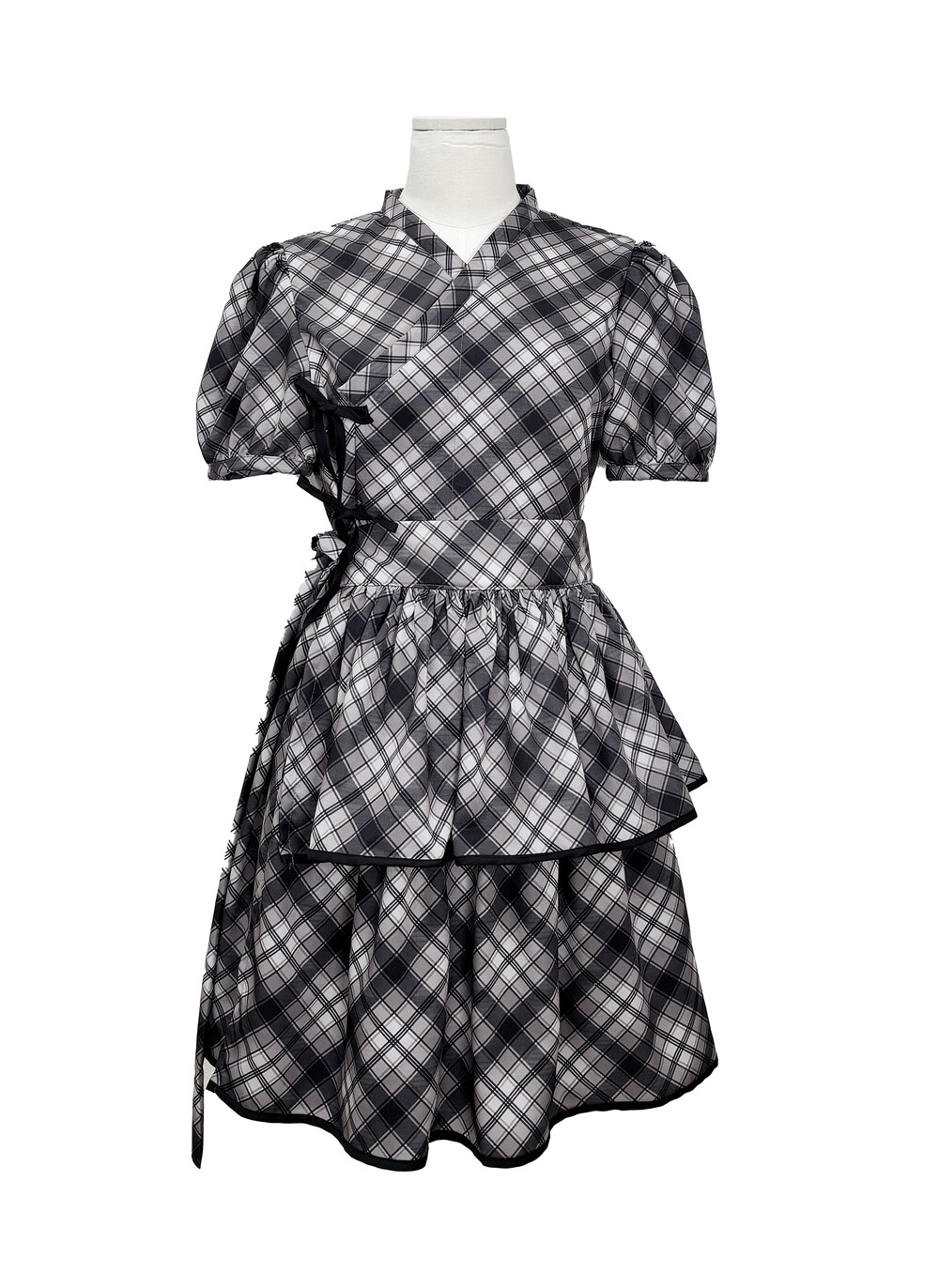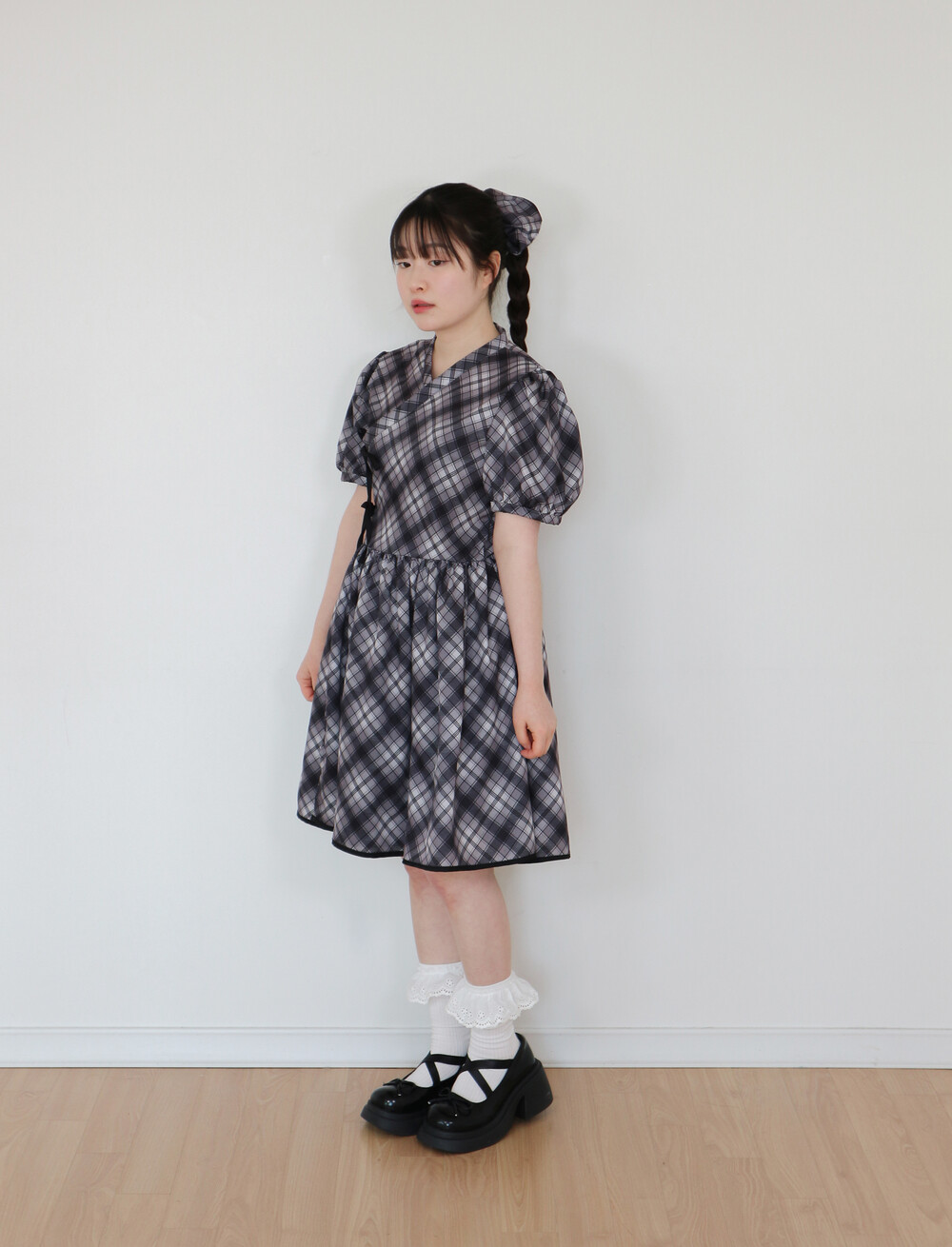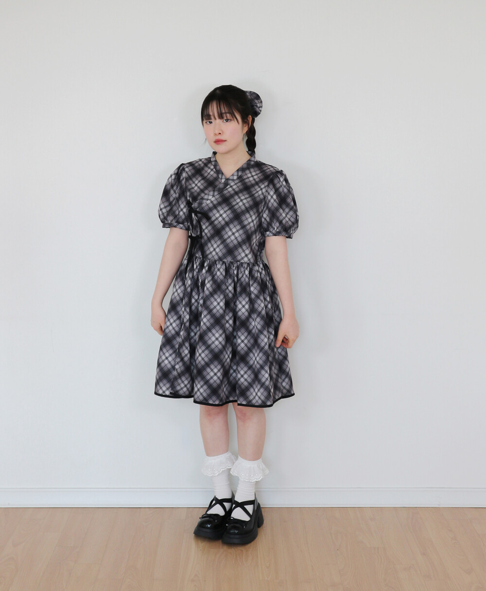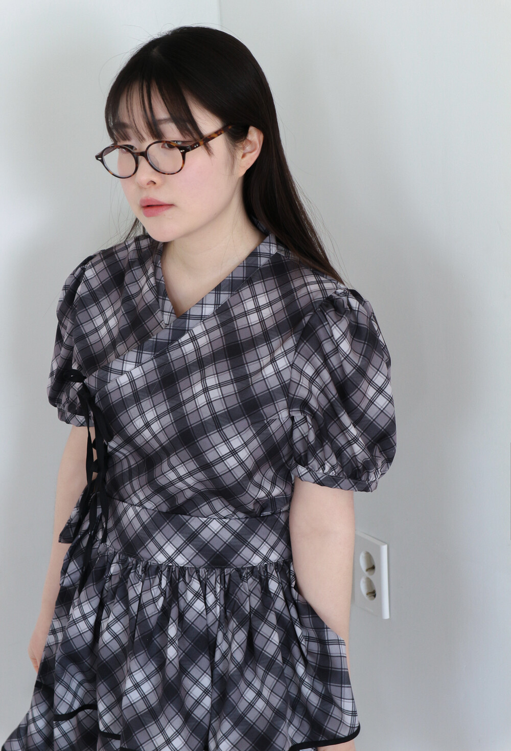 블랙 체크 미니 원피스는 한복의 전통 요소에 프레피룩과 긱시크 감성을 결합한 디자인입니다. 폴리 원단으로 제작되어 찰랑거리는 느낌과 가벼운 착용감을 제공하며,