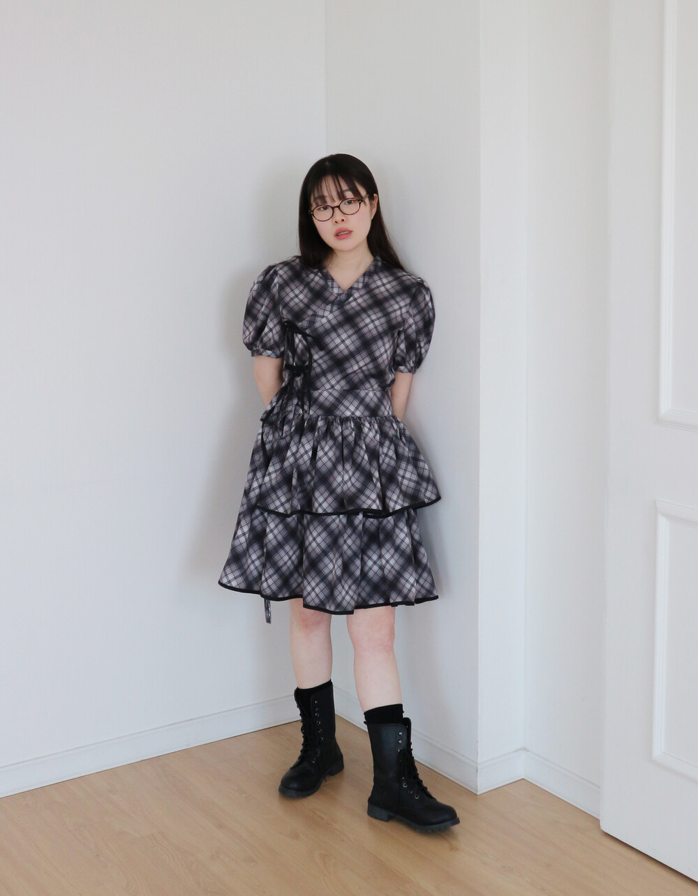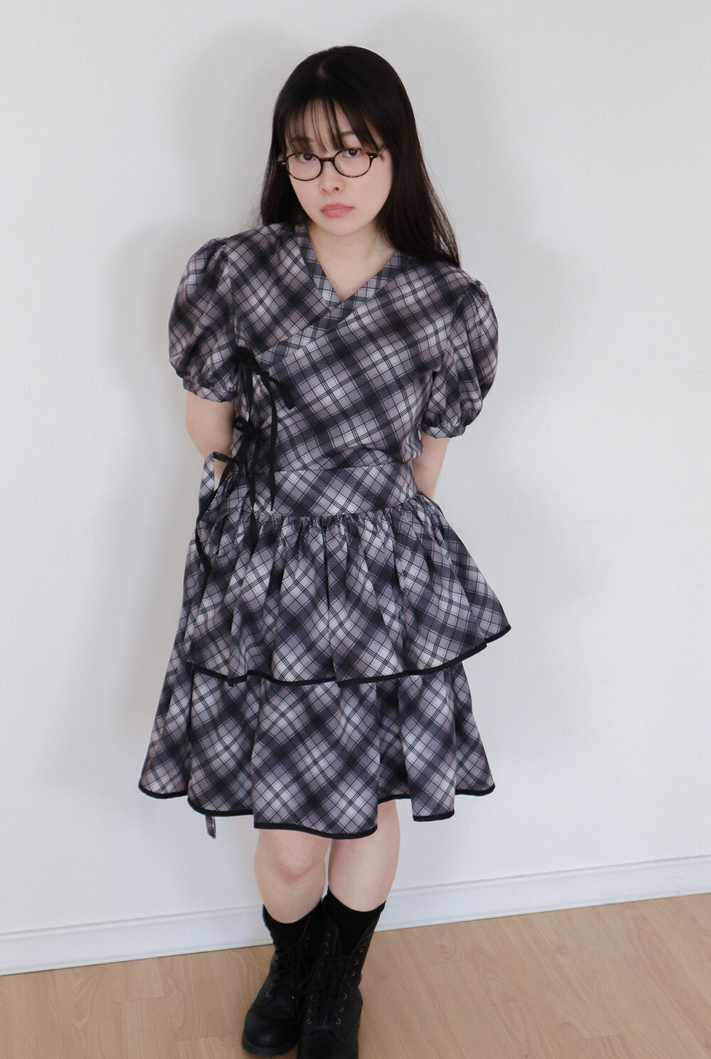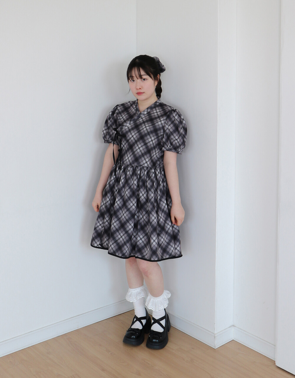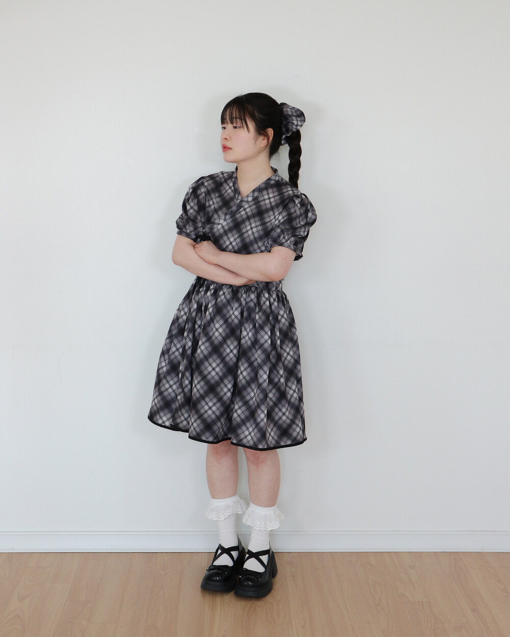 블랙 체크 미니 원피스는 한복의 전통 요소에 프레피룩과 긱시크 감성을 결합한 디자인입니다. 폴리 원단으로 제작되어 찰랑거리는 느낌과 가벼운 착용감을 제공하며,