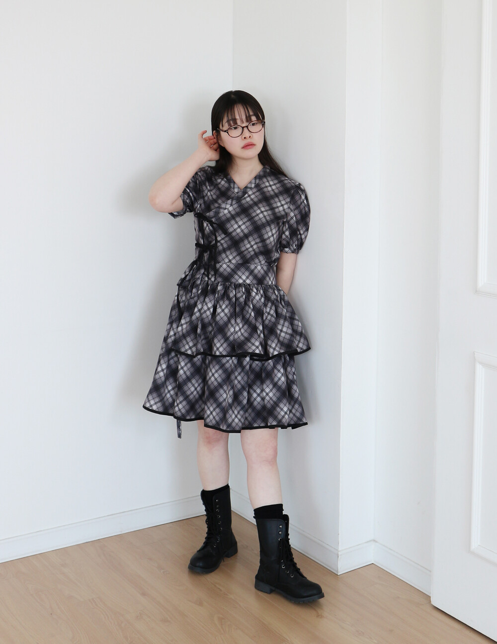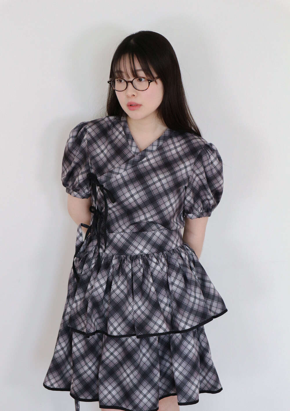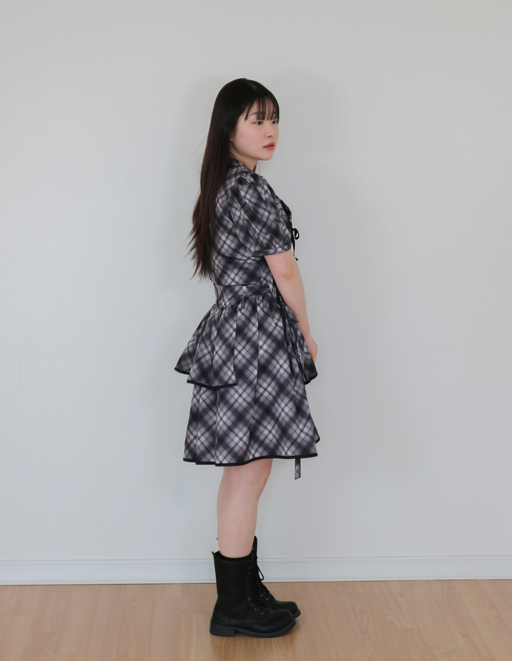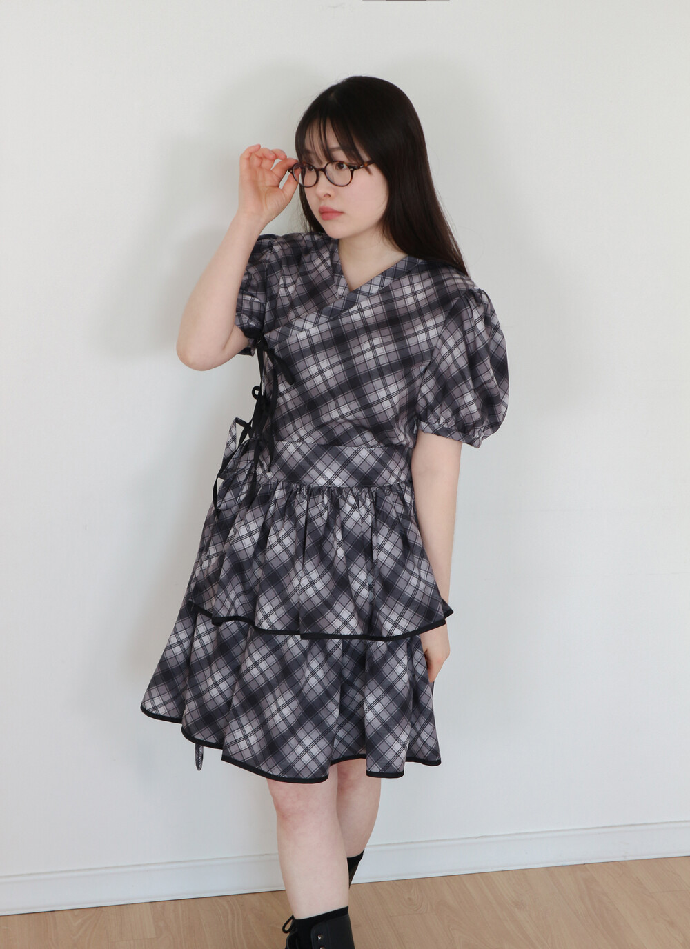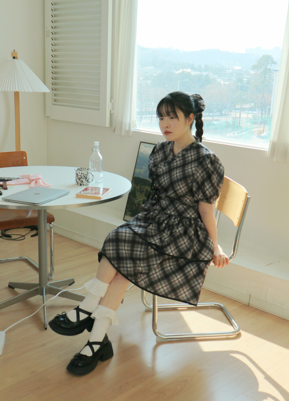 블랙 체크 미니 원피스는 한복의 전통 요소에 프레피룩과 긱시크 감성을 결합한 디자인입니다. 폴리 원단으로 제작되어 찰랑거리는 느낌과 가벼운 착용감을 제공하며,