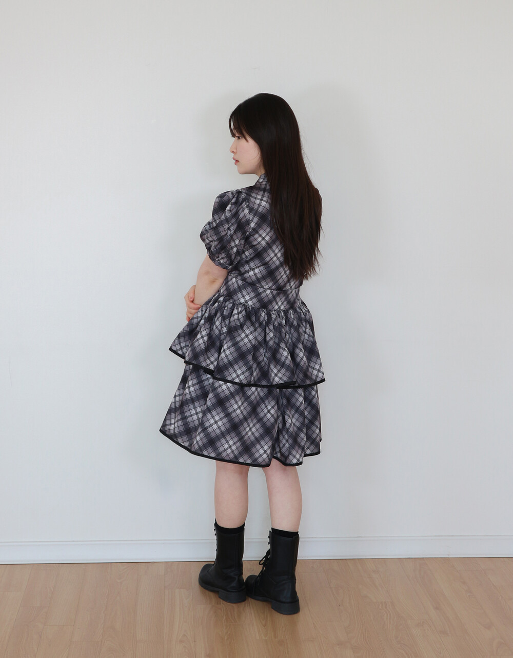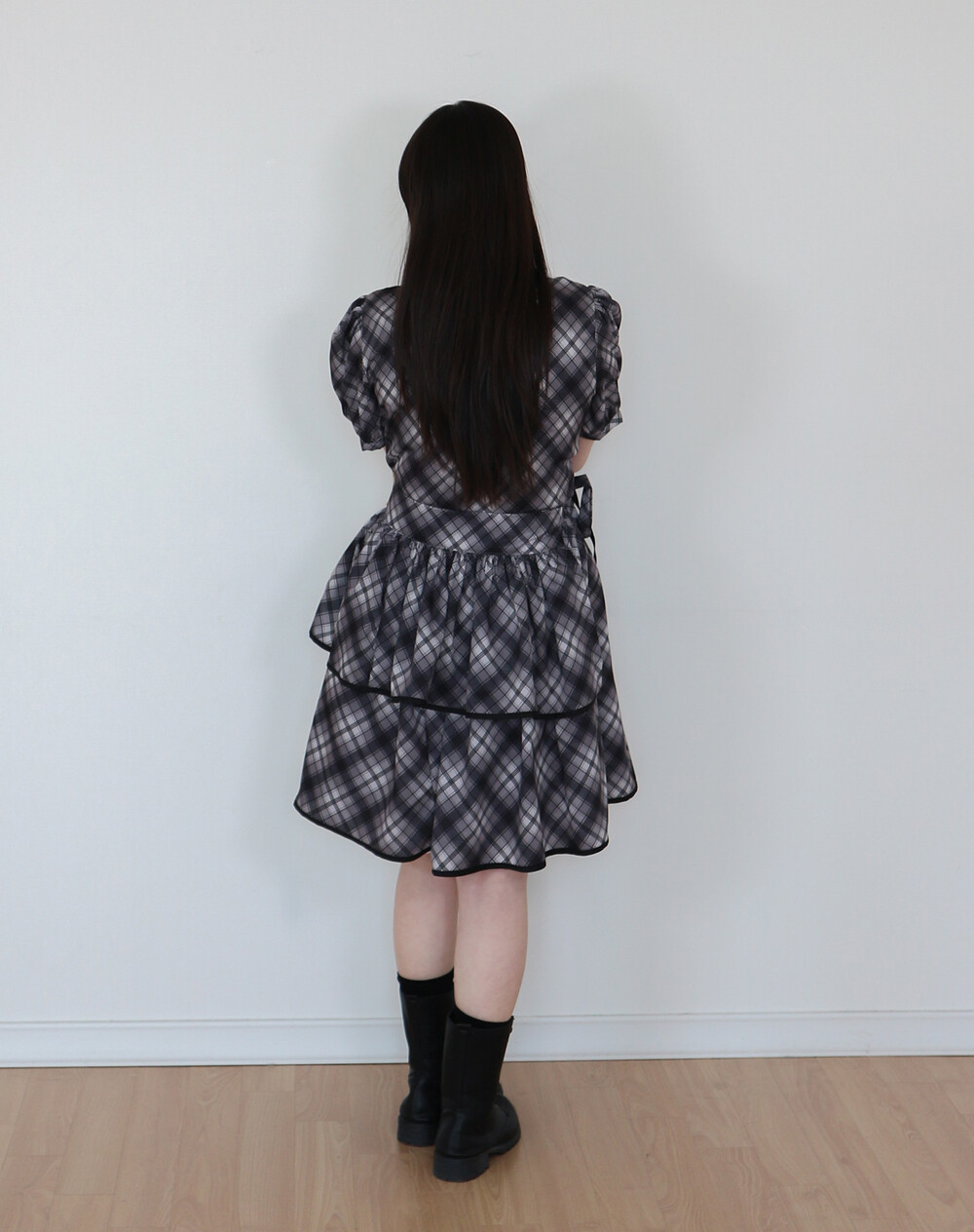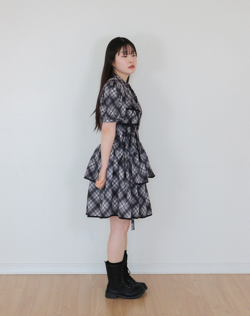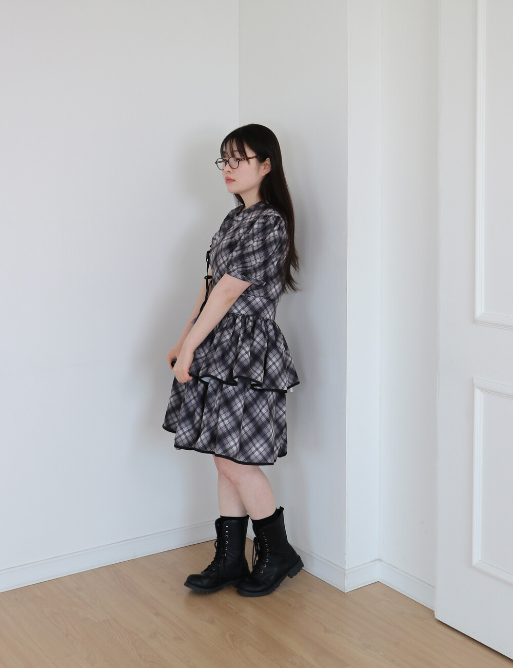 블랙 체크 미니 원피스는 한복의 전통 요소에 프레피룩과 긱시크 감성을 결합한 디자인입니다. 폴리 원단으로 제작되어 찰랑거리는 느낌과 가벼운 착용감을 제공하며,
