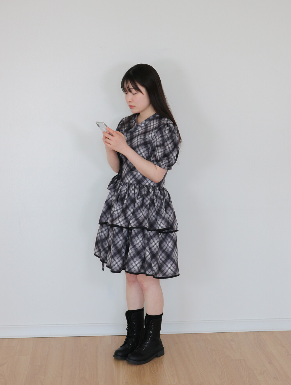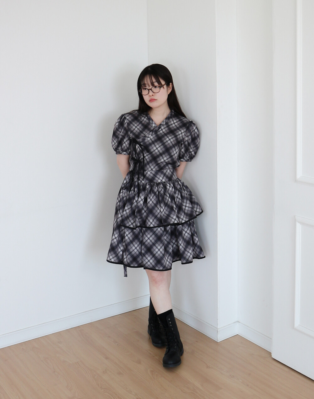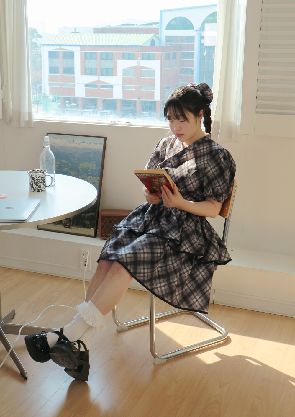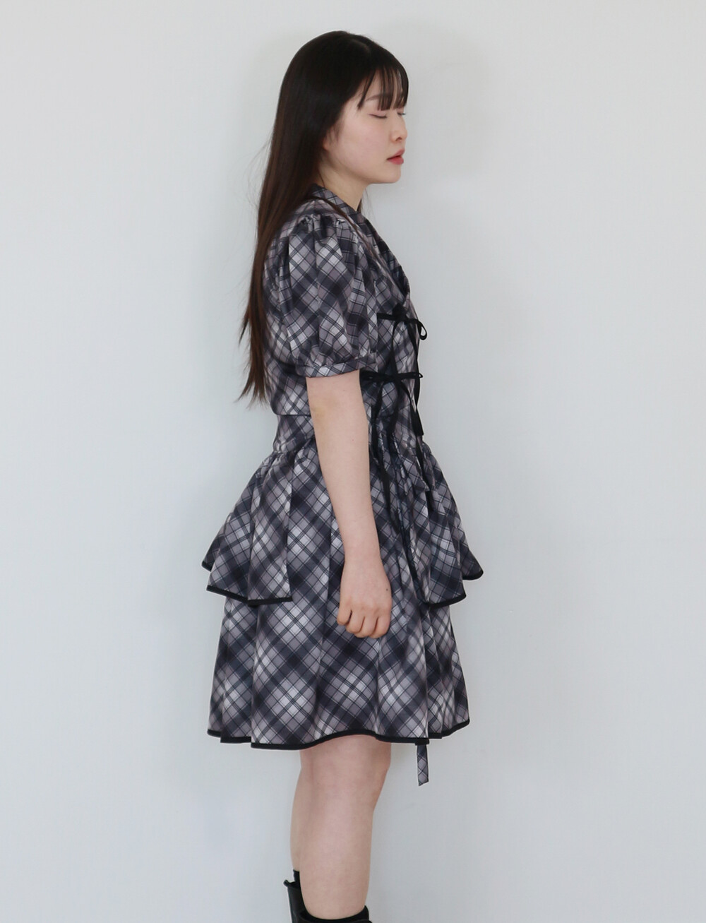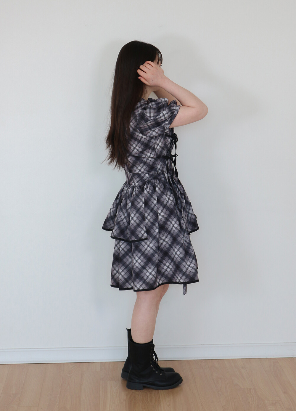 블랙 체크 미니 원피스는 한복의 전통 요소에 프레피룩과 긱시크 감성을 결합한 디자인입니다. 폴리 원단으로 제작되어 찰랑거리는 느낌과 가벼운 착용감을 제공하며,