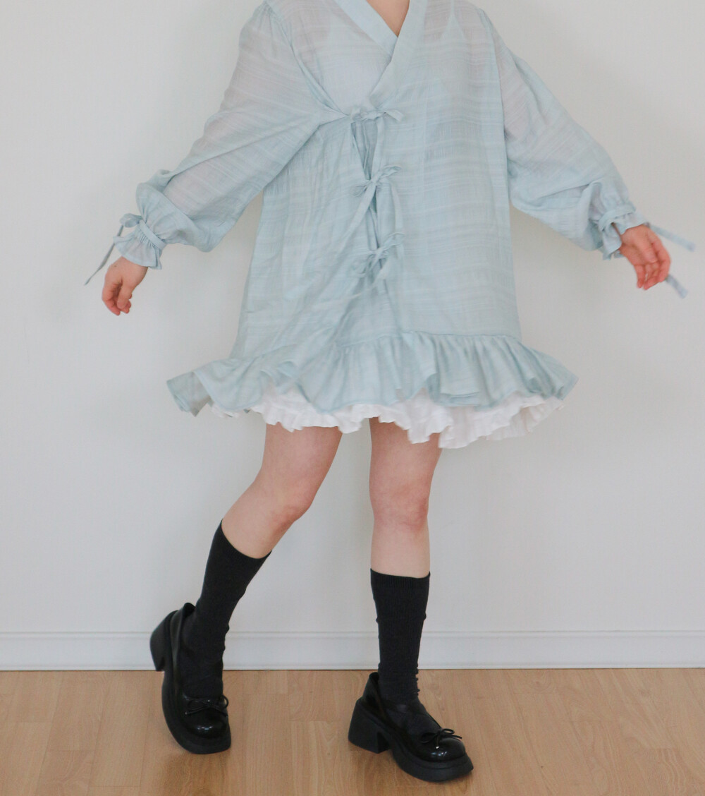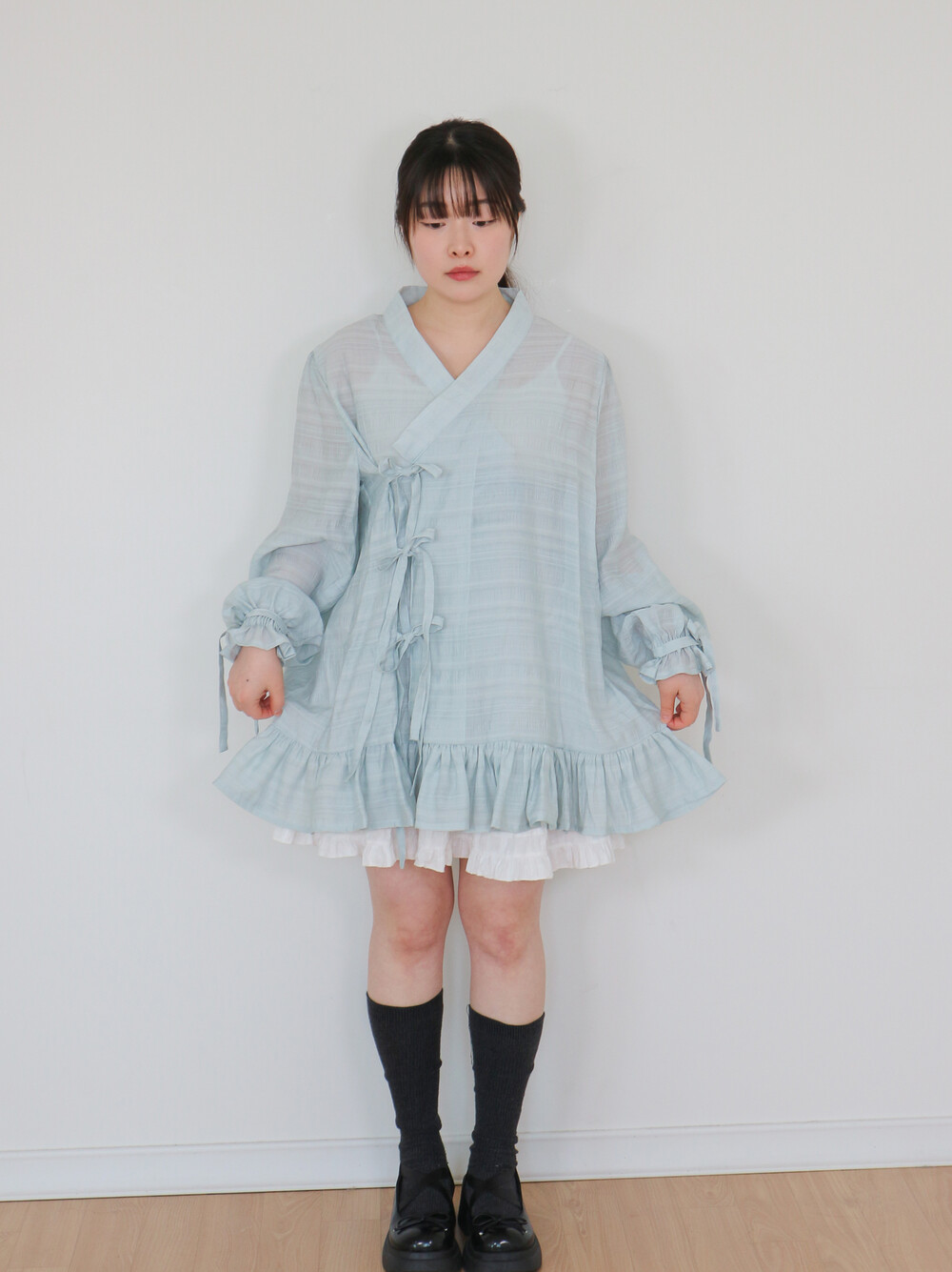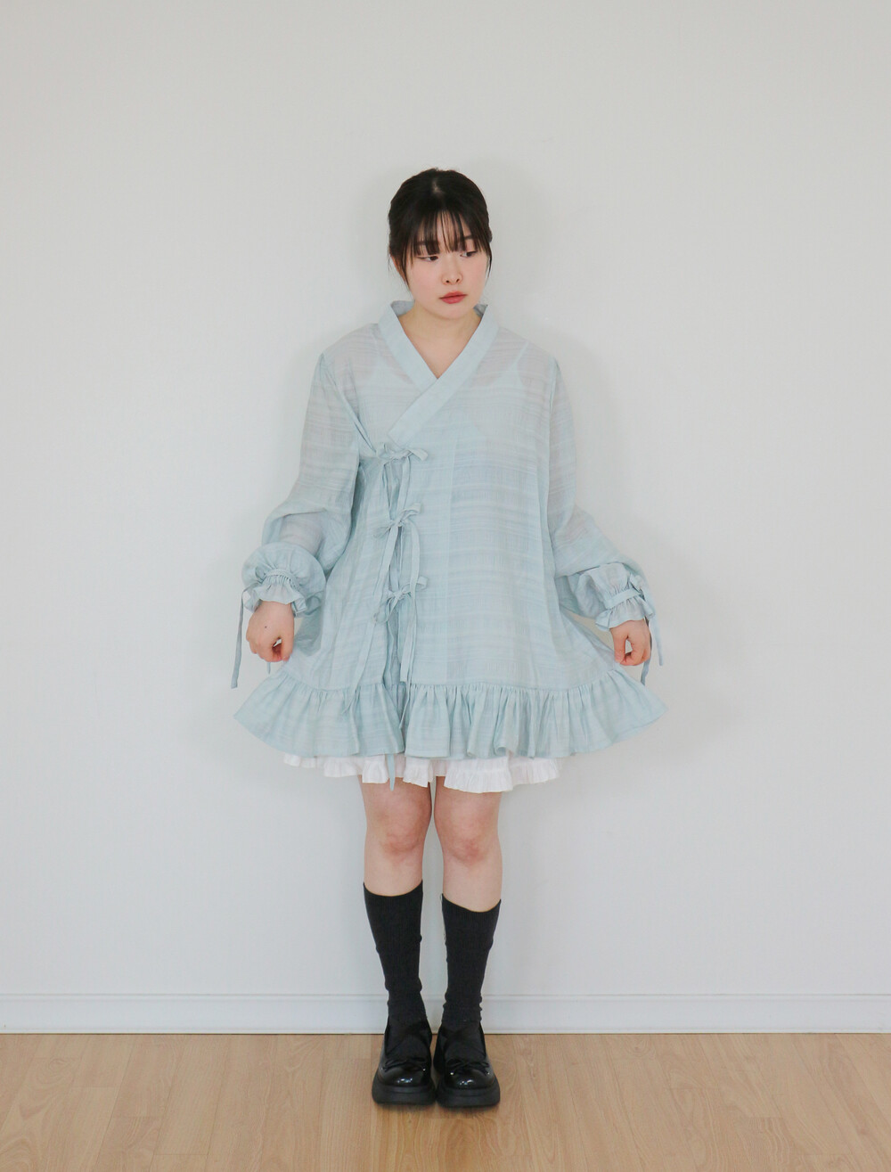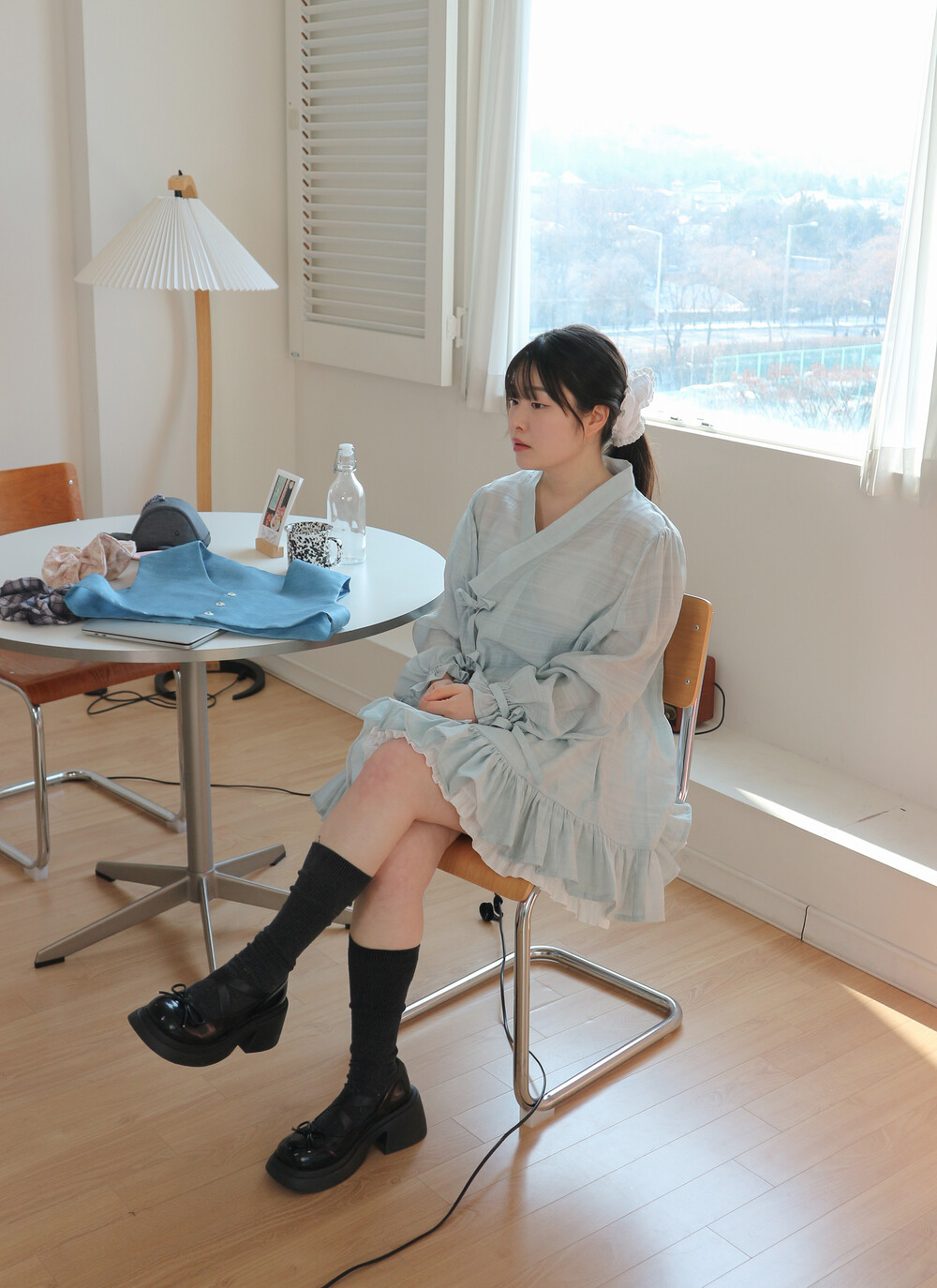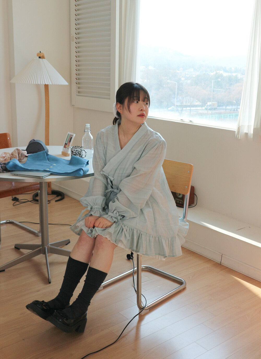 밑단의 풍성한 셔링은 러블리한 실루엣을 만들어주며, 앞쪽의 두꺼운 깃과 3개의 고름(리본)은 러블리하면서도 클래식한 분위기를 더합니다.
