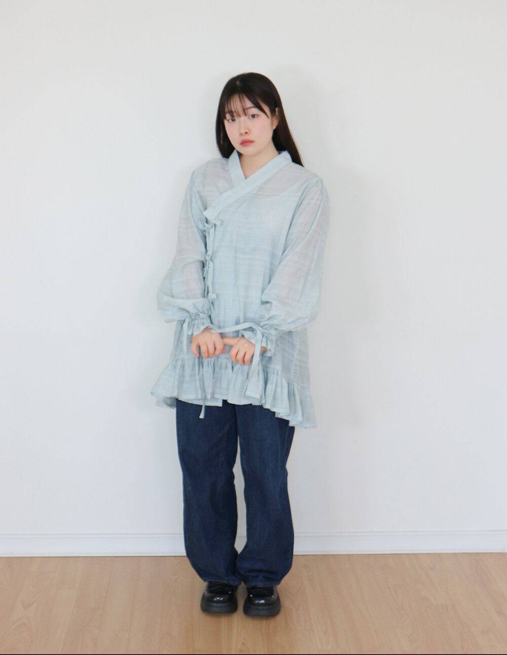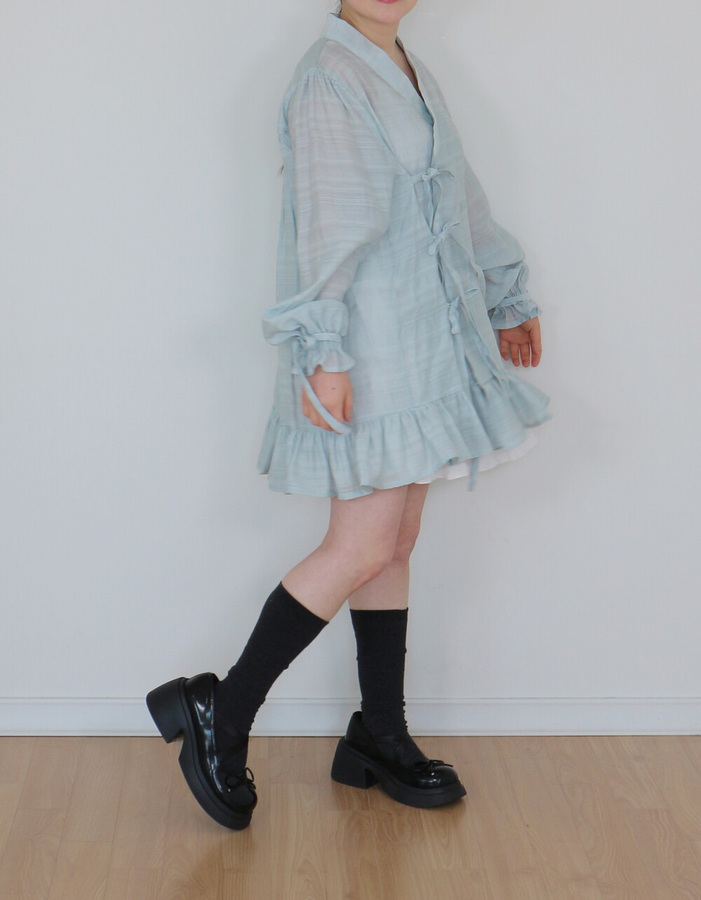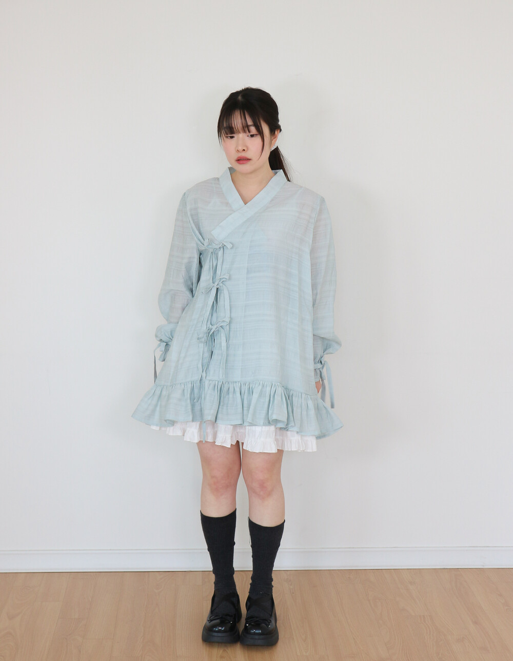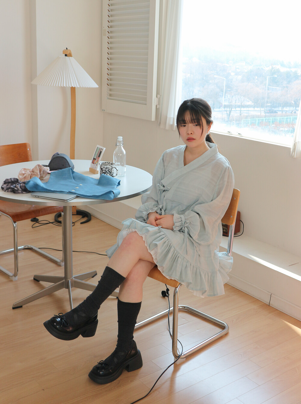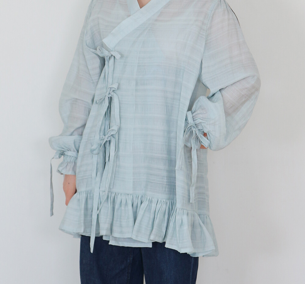 밑단의 풍성한 셔링은 러블리한 실루엣을 만들어주며, 앞쪽의 두꺼운 깃과 3개의 고름(리본)은 러블리하면서도 클래식한 분위기를 더합니다.
