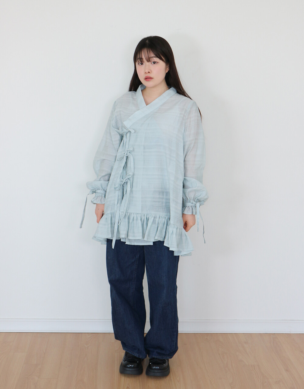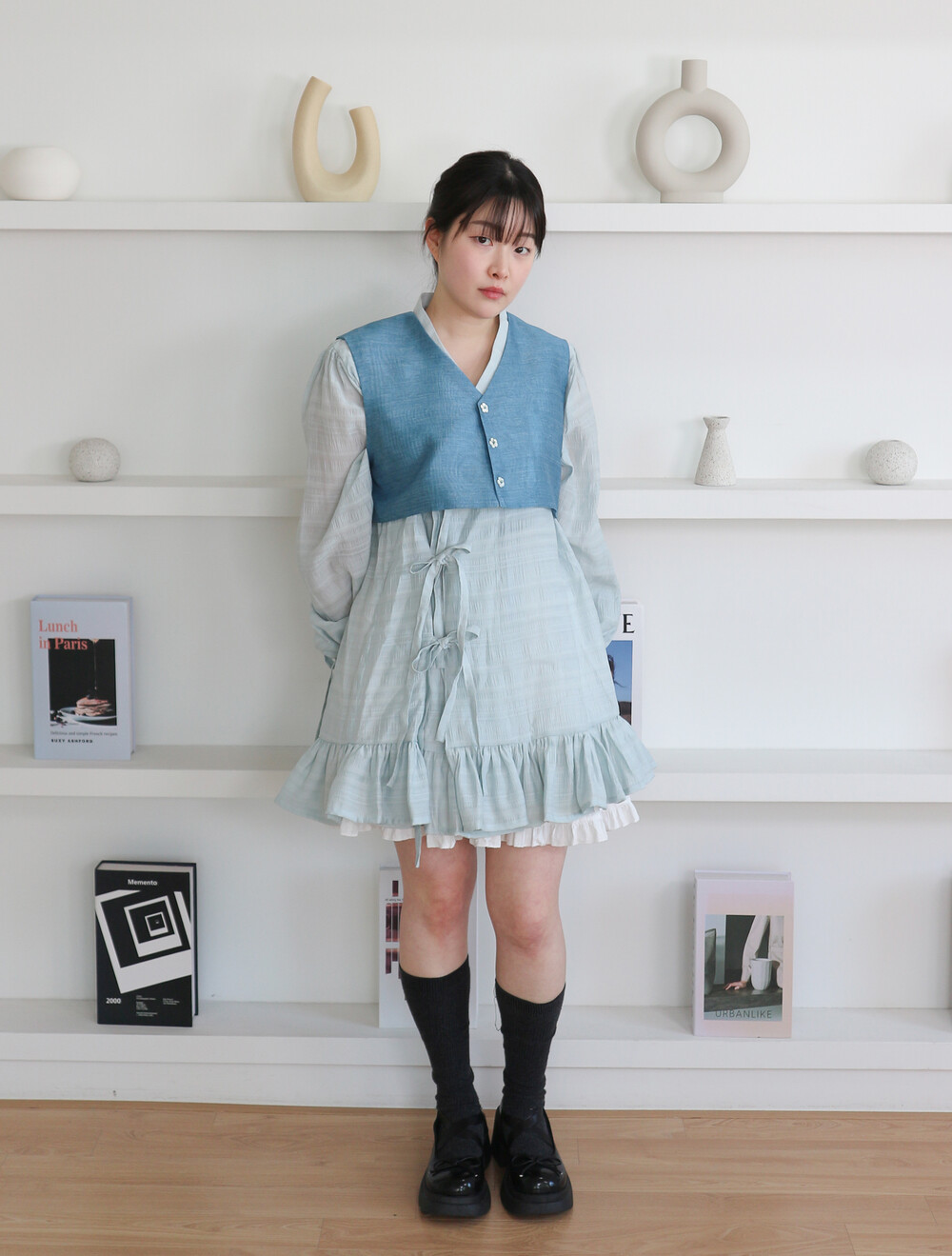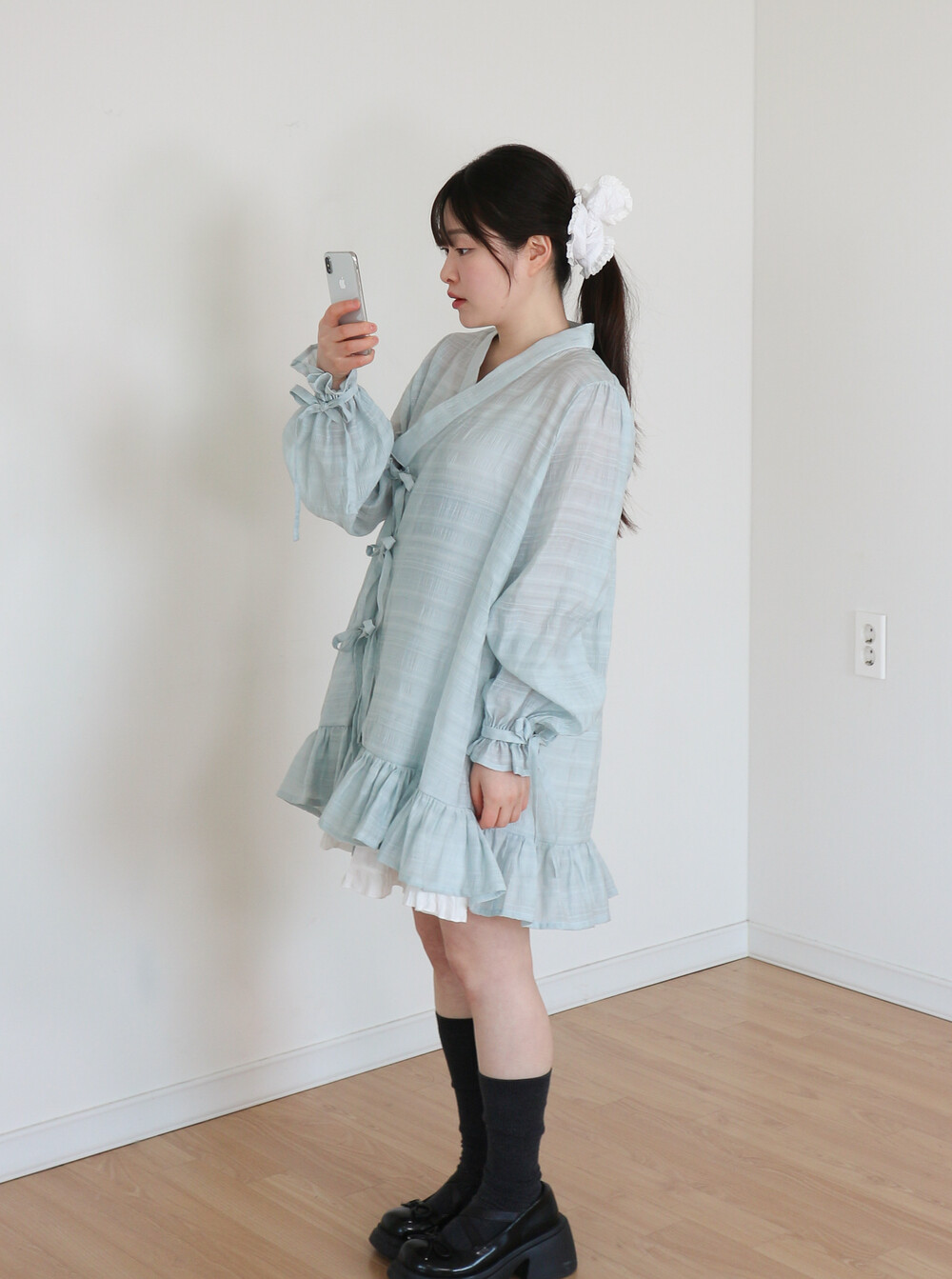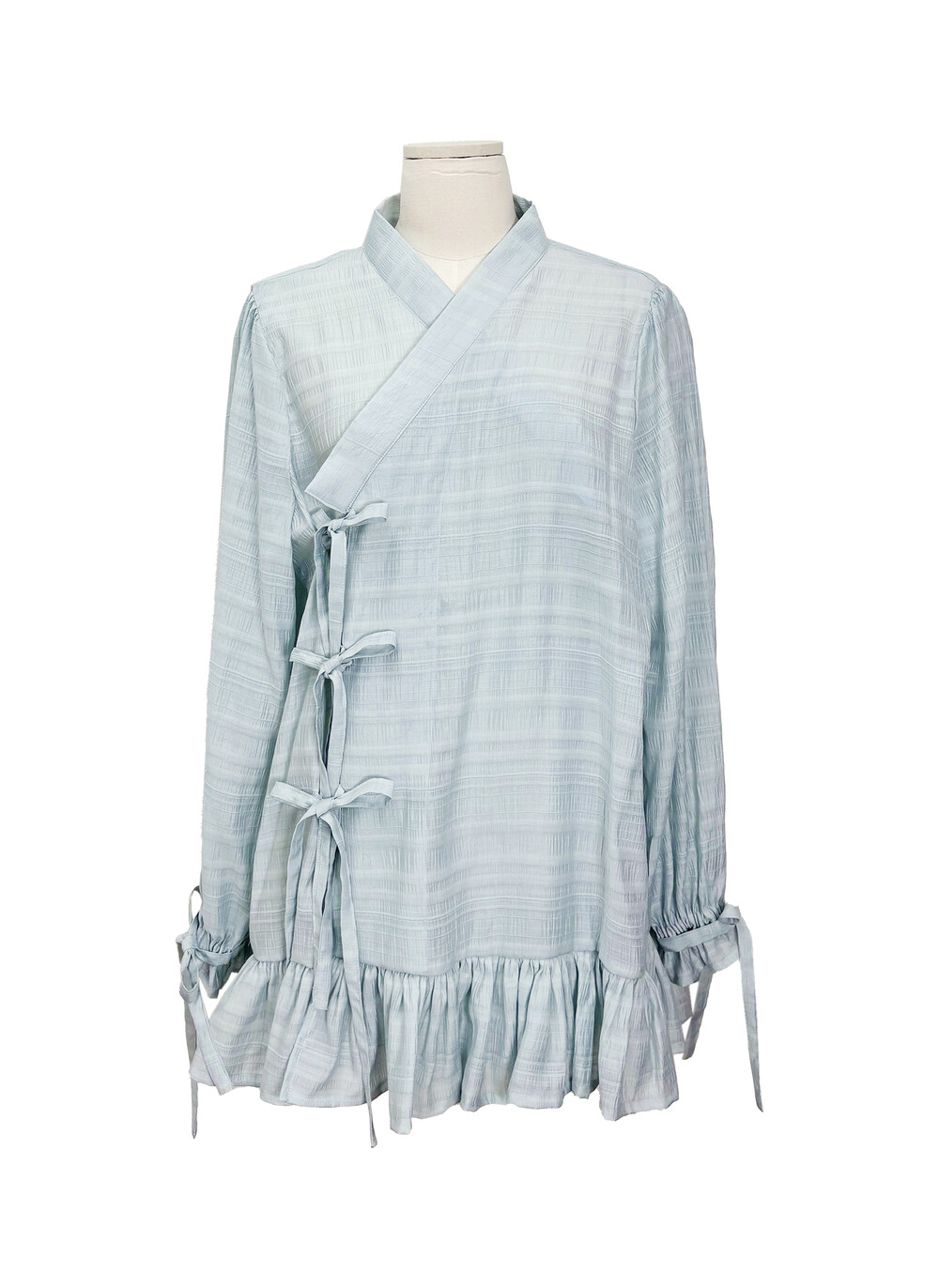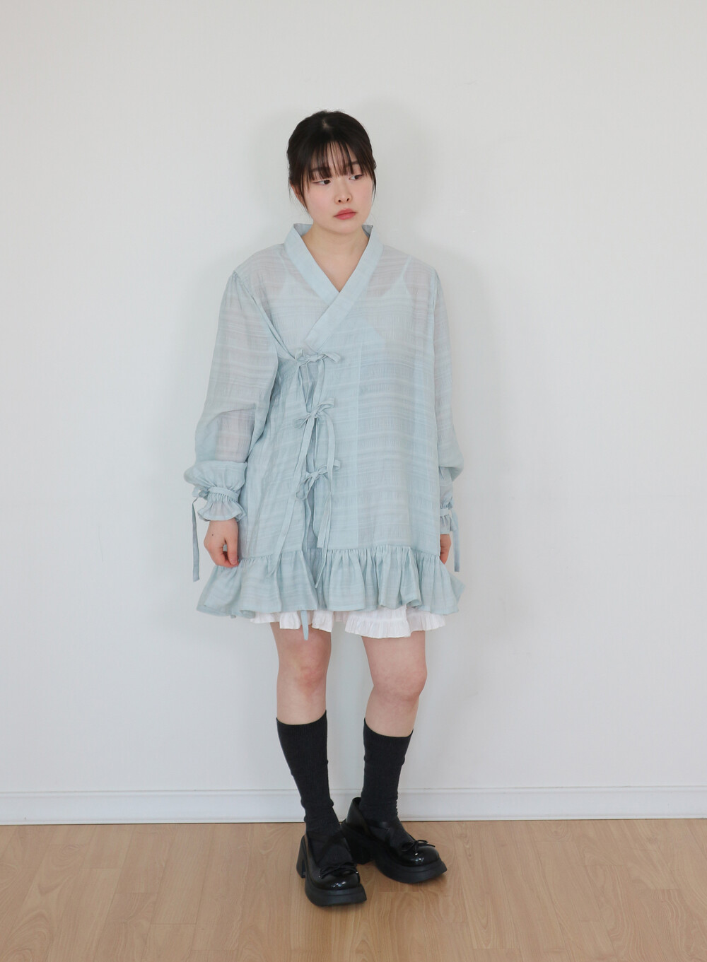 밑단의 풍성한 셔링은 러블리한 실루엣을 만들어주며, 앞쪽의 두꺼운 깃과 3개의 고름(리본)은 러블리하면서도 클래식한 분위기를 더합니다.