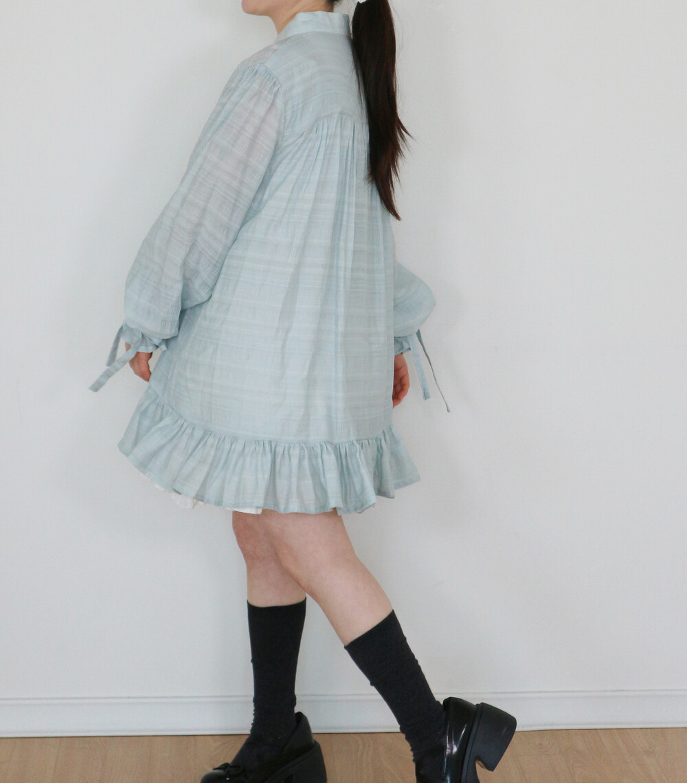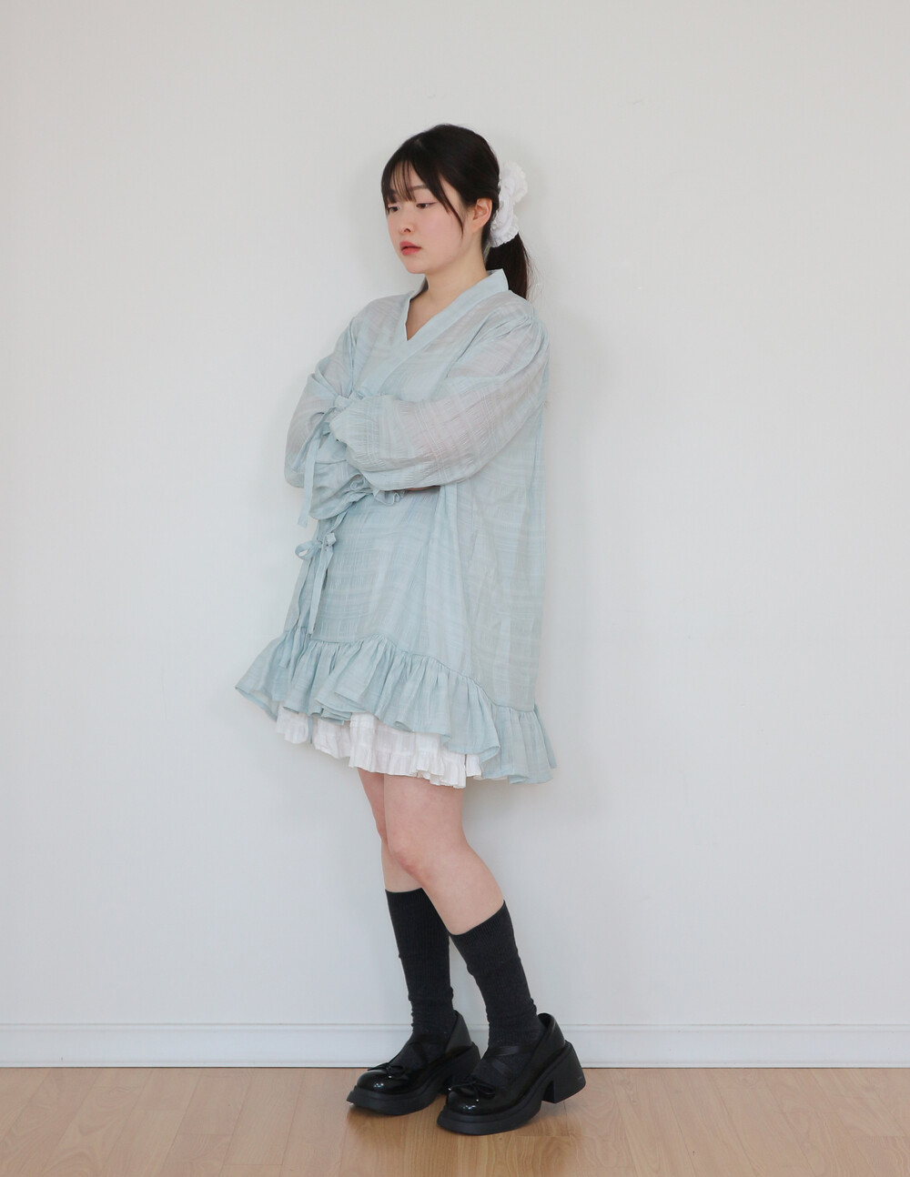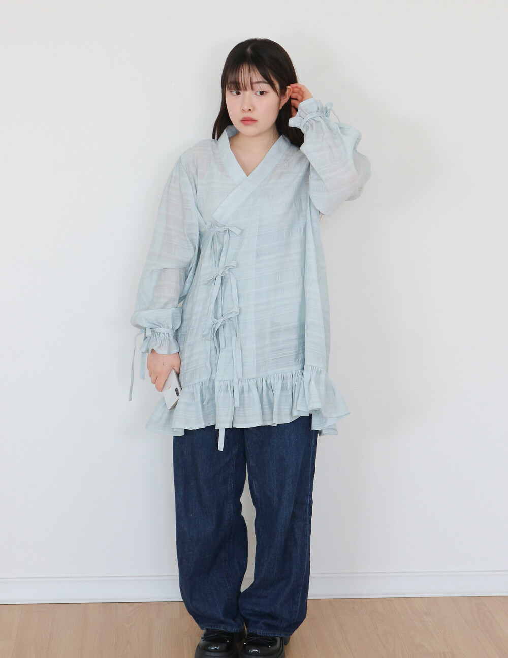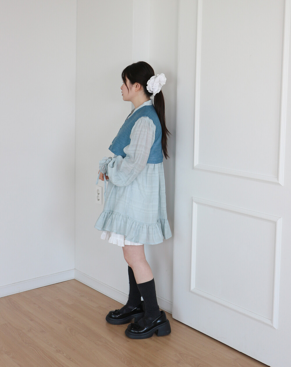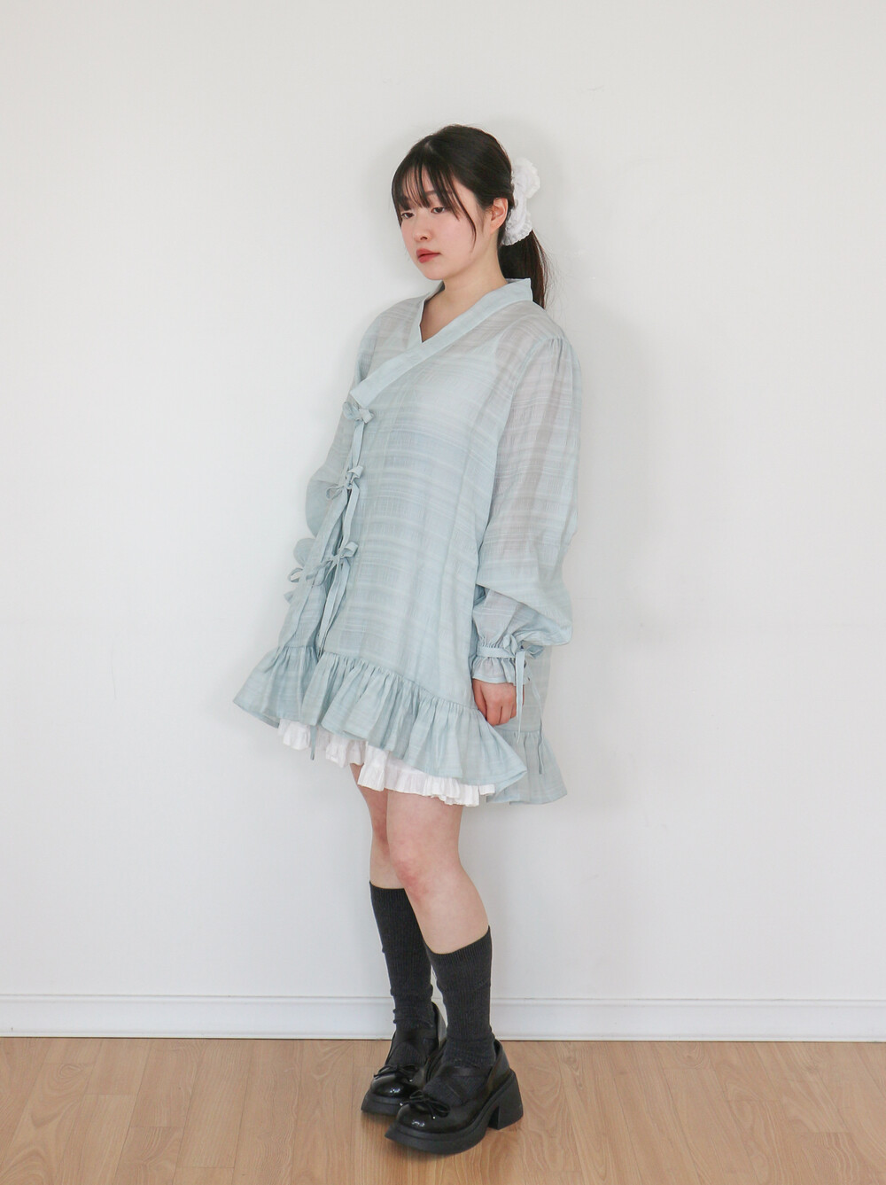 밑단의 풍성한 셔링은 러블리한 실루엣을 만들어주며, 앞쪽의 두꺼운 깃과 3개의 고름(리본)은 러블리하면서도 클래식한 분위기를 더합니다.