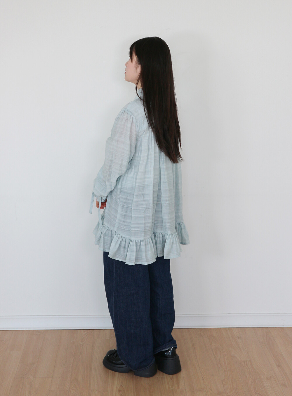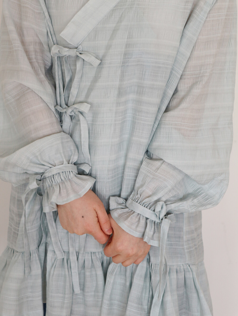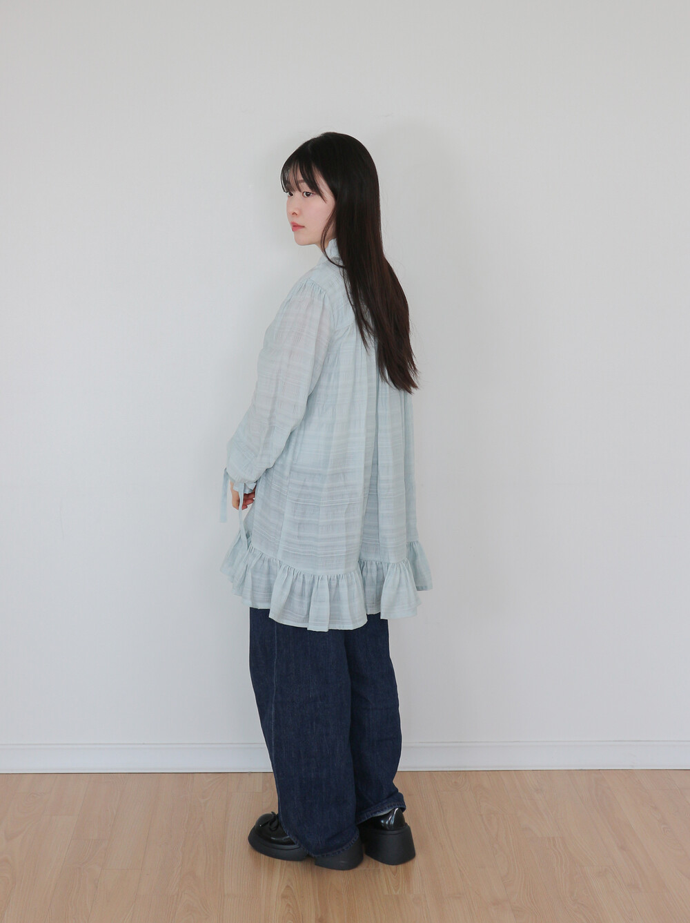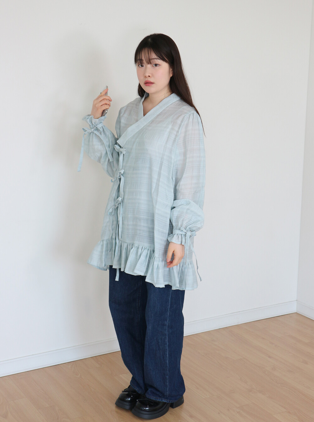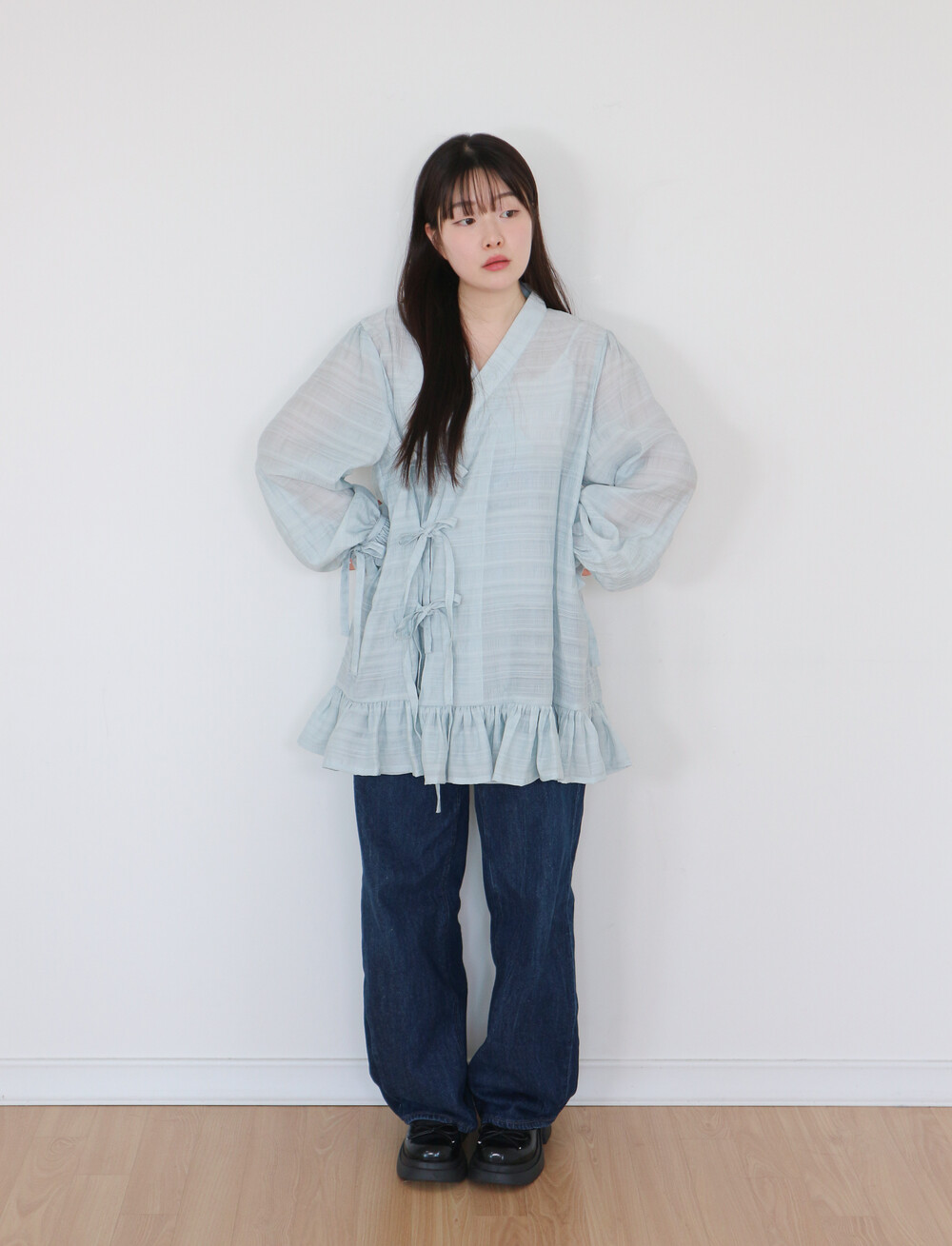밑단의 풍성한 셔링은 러블리한 실루엣을 만들어주며, 앞쪽의 두꺼운 깃과 3개의 고름(리본)은 러블리하면서도 클래식한 분위기를 더합니다.