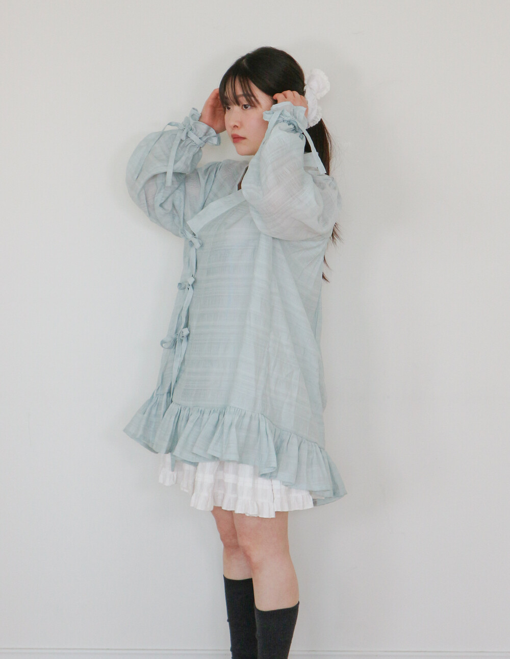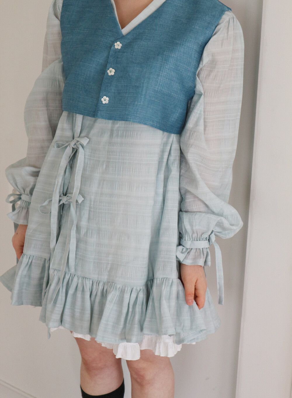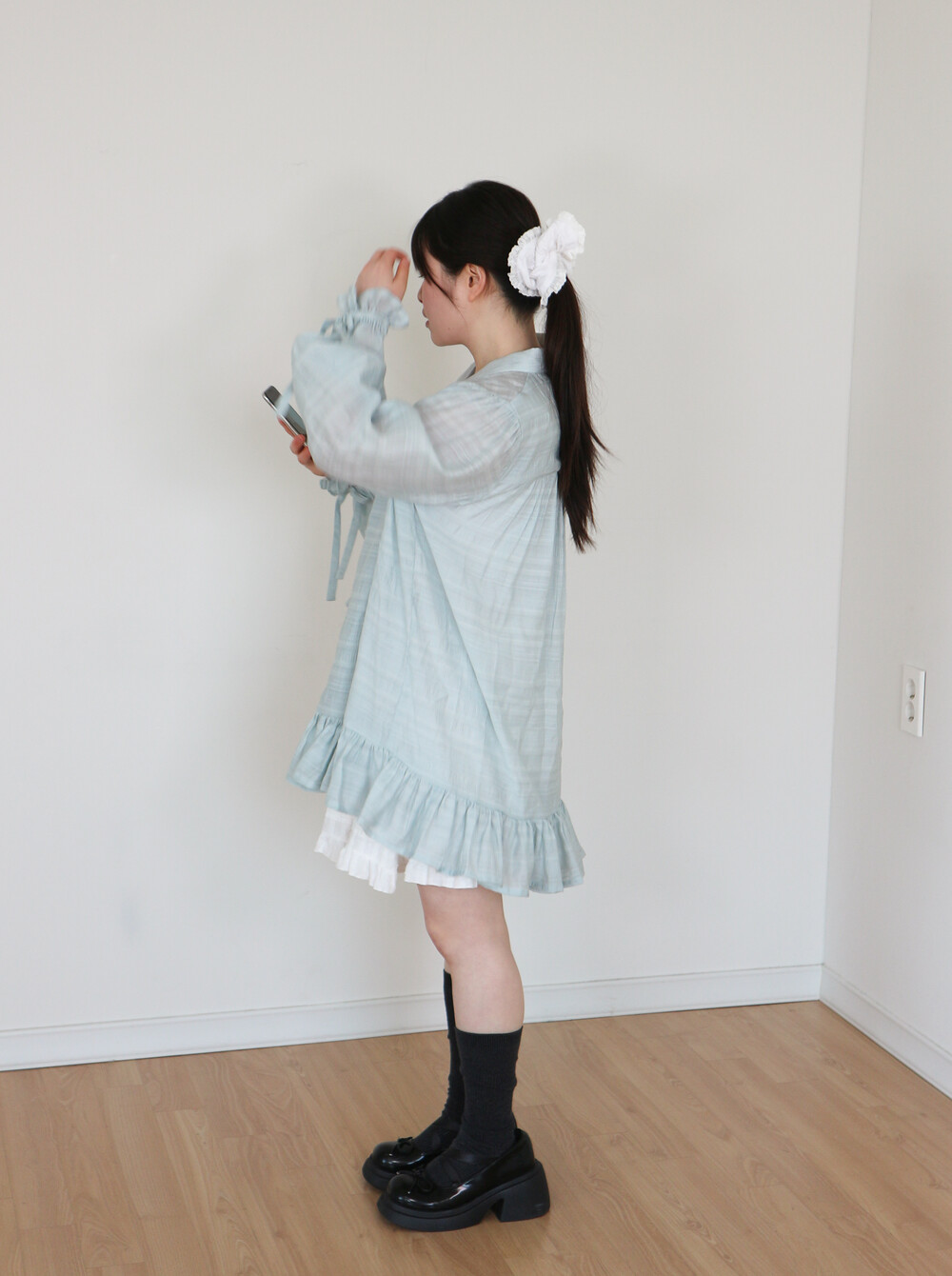 가벼운 소재로 레이어드하기 좋고, 청바지, 화이트 스커트, 반바지 등과 함께 데일리하게 스타일링 할 수 있습니다. 또한, 소매에는 고무줄과 리본 끈을 더해 사랑스러운 무드를 연출할 수 있습니다! 착용감과 촉감이 좋아 봄철에 입기 좋은 미니 원피스입니다.