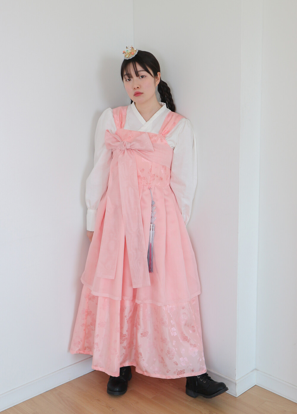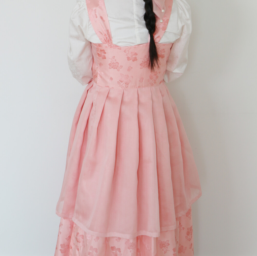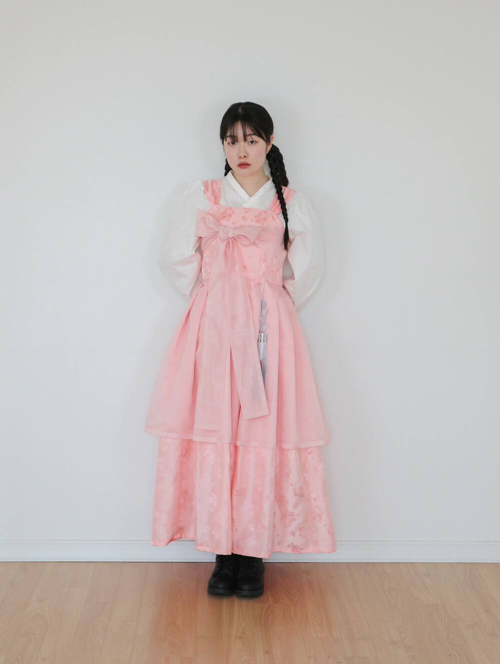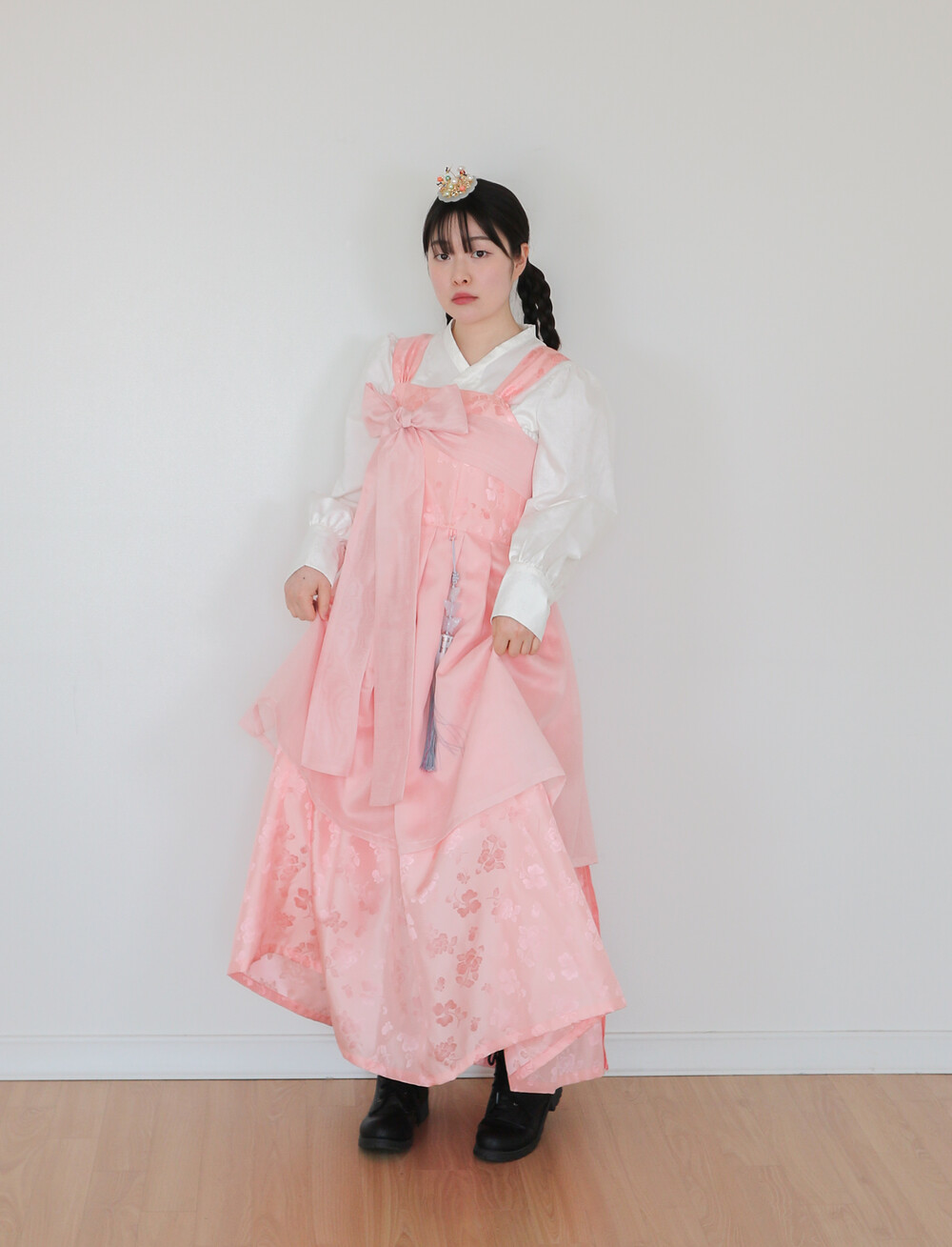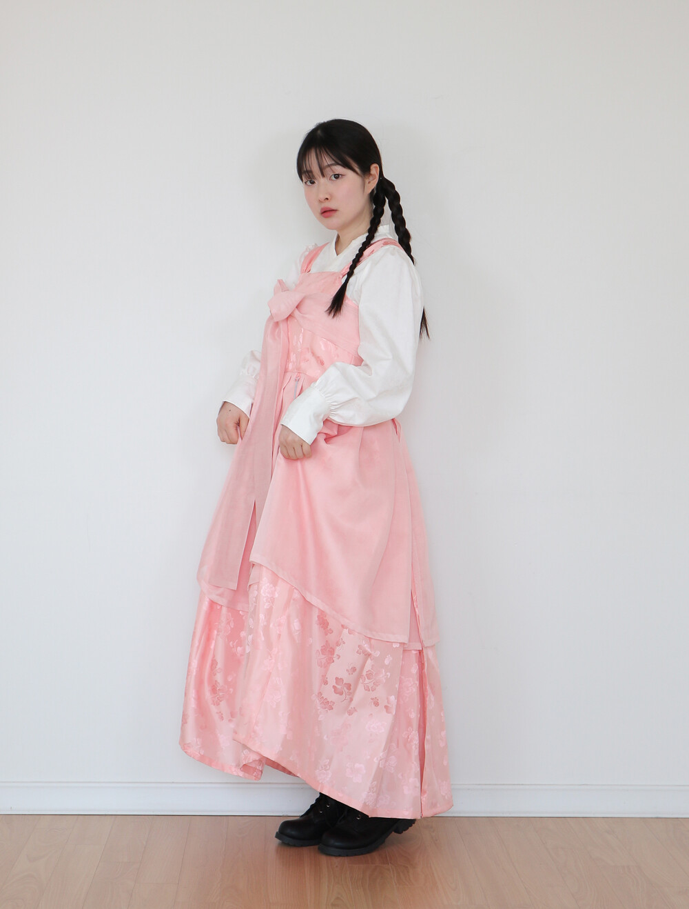 화이트 저고리나 블라우스와 함께 착용하기 좋으며, 단독으로도 멋스럽게 연출할 수 있습니다. 허리부분의 고리를 활용해 전통적인 노리개부터 다양한 장신구까지 스타일링할 수 있으며, 사랑스럽고 화려한 디자인으로 공연 한복으로도 활용하기 좋은 원피스입니다.