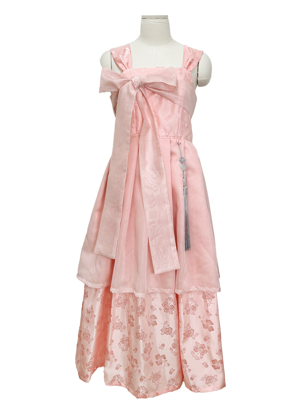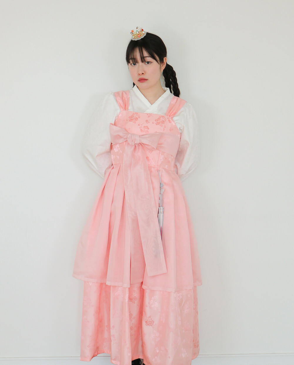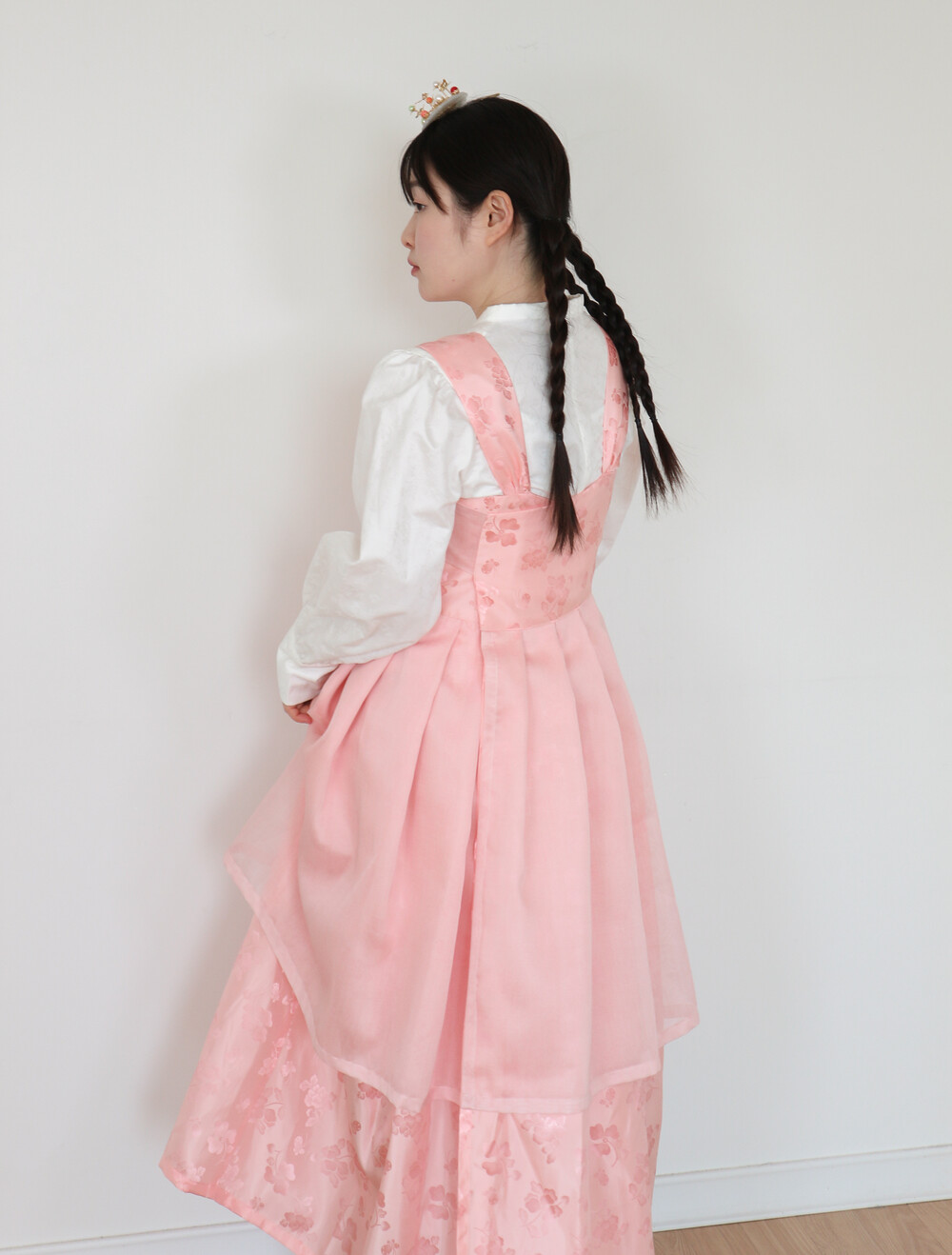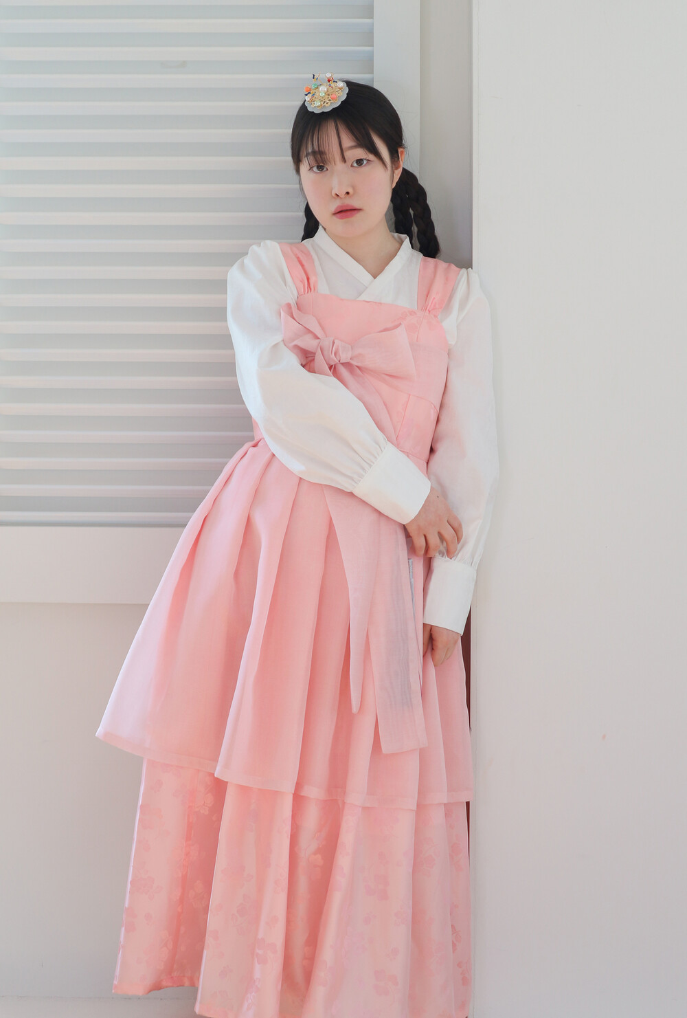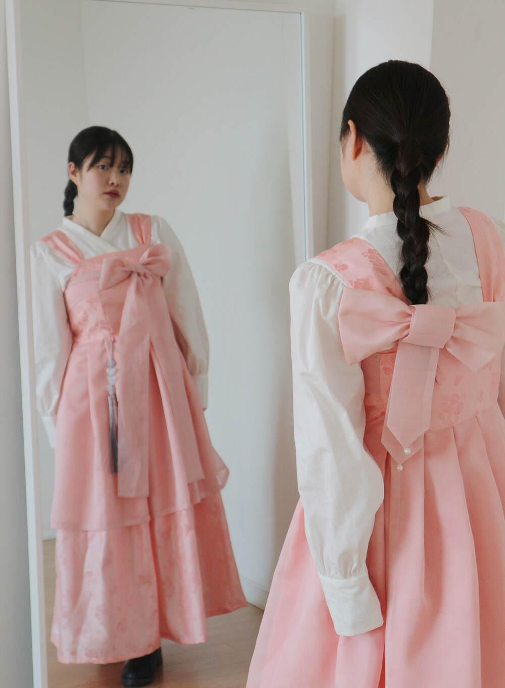 화이트 저고리나 블라우스와 함께 착용하기 좋으며, 단독으로도 멋스럽게 연출할 수 있습니다. 허리부분의 고리를 활용해 전통적인 노리개부터 다양한 장신구까지 스타일링할 수 있으며, 사랑스럽고 화려한 디자인으로 공연 한복으로도 활용하기 좋은 원피스입니다.