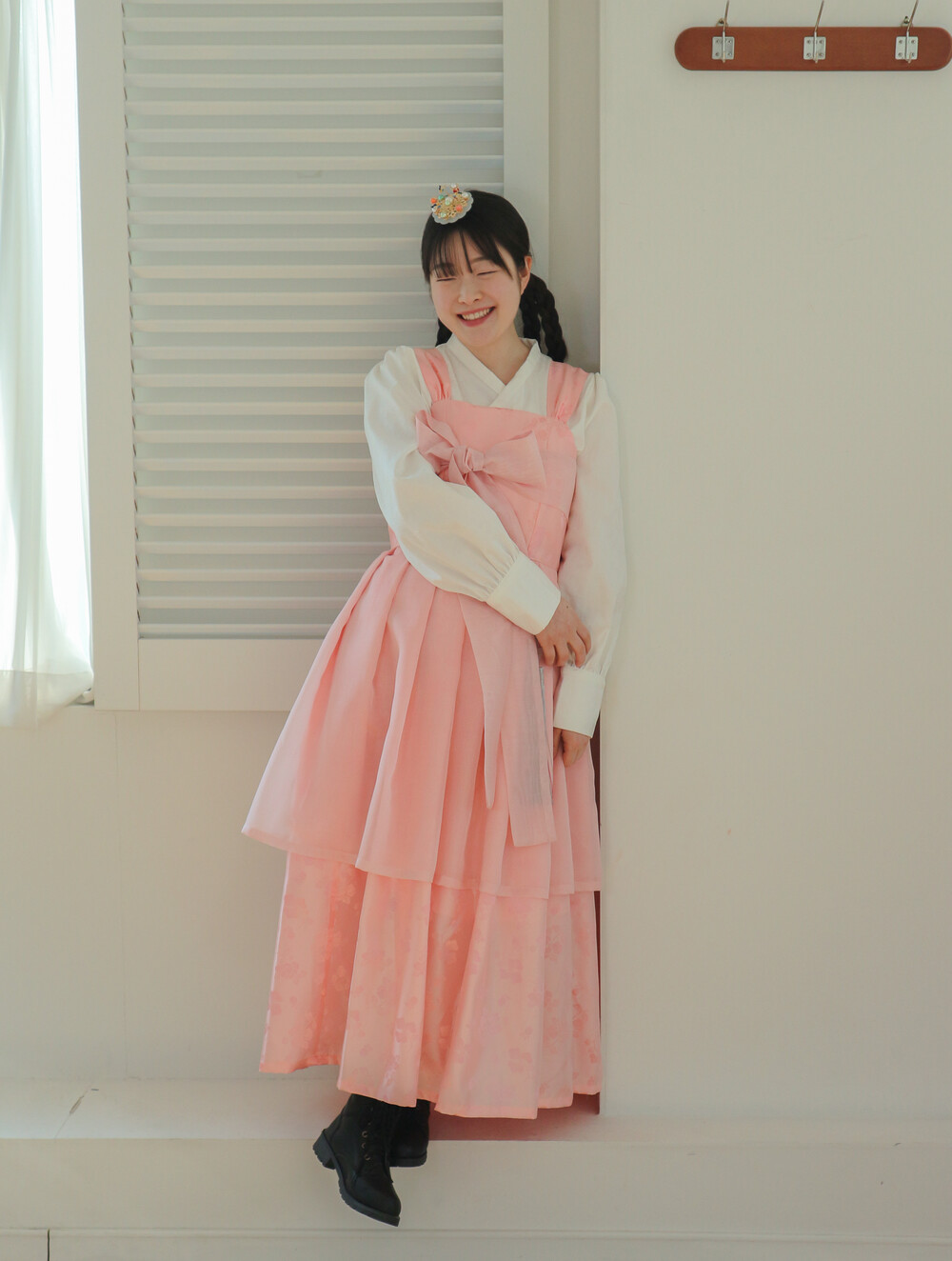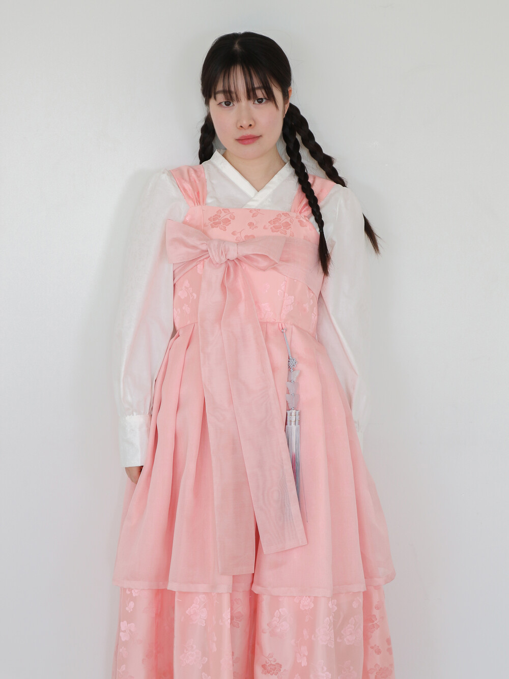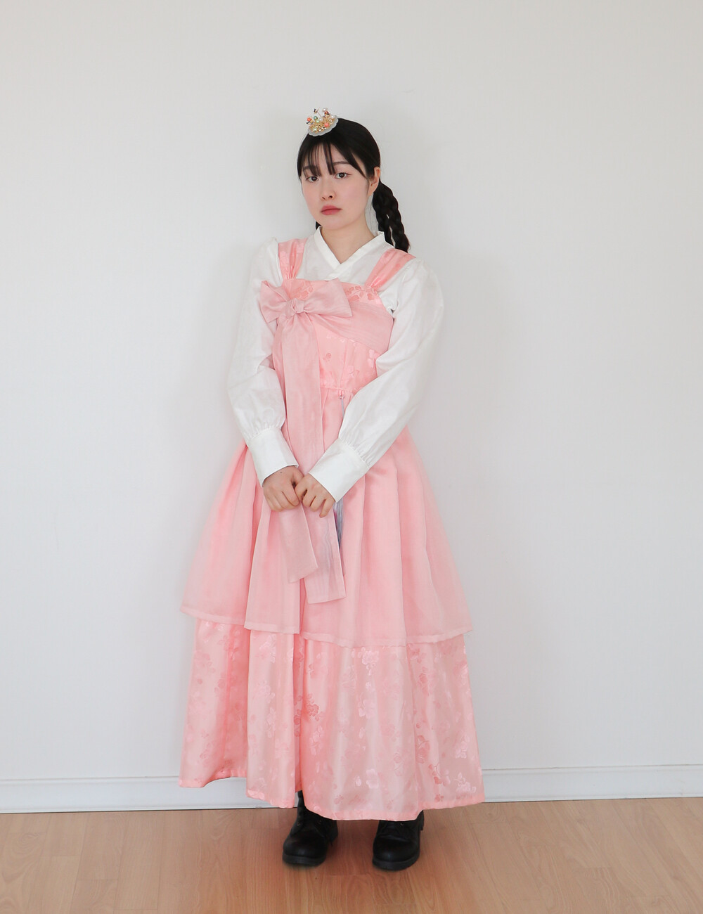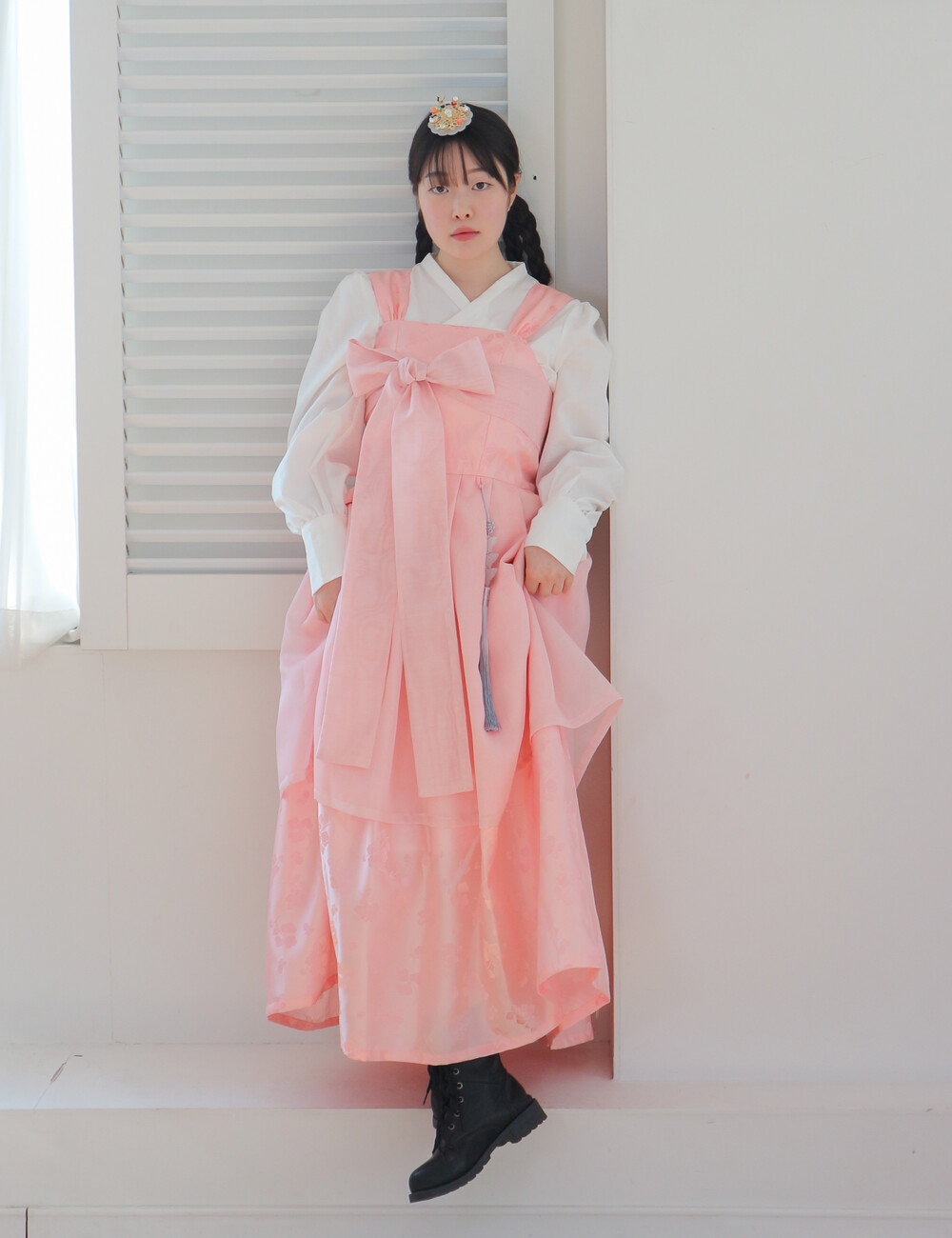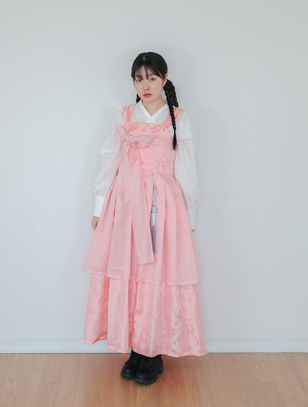 화이트 저고리나 블라우스와 함께 착용하기 좋으며, 단독으로도 멋스럽게 연출할 수 있습니다. 허리부분의 고리를 활용해 전통적인 노리개부터 다양한 장신구까지 스타일링할 수 있으며, 사랑스럽고 화려한 디자인으로 공연 한복으로도 활용하기 좋은 원피스입니다.